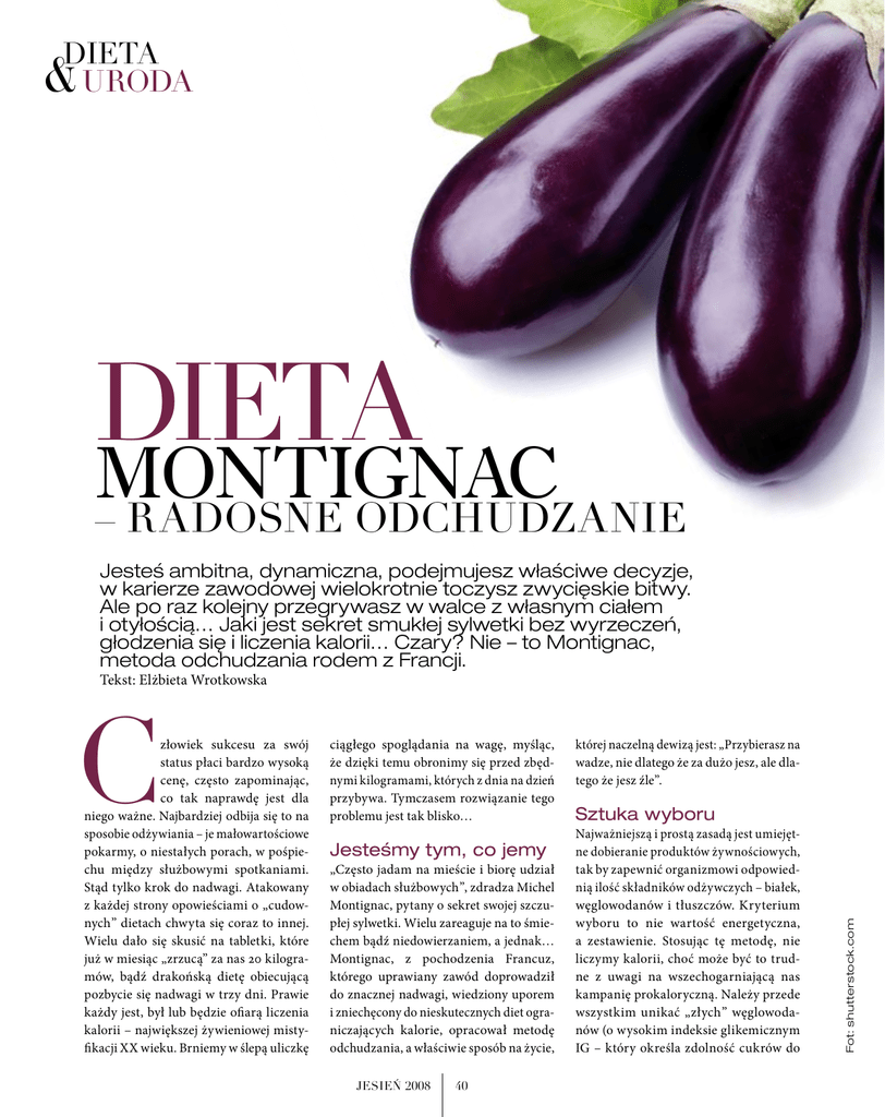 dieta uroda & Dieta Montignac – radosne odchudzanie Jesteś ambitna, dynamiczna, podejmujesz właściwe decyzje, w karierze zawodowej wielokrotnie toczysz zwycięskie bitwy. Ale po raz kolejny przegrywasz w walce z własnym ciałem i otyłością… Jaki jest sekret smukłej sylwetki bez wyrzeczeń, głodzenia się i liczenia kalorii… Czary? Nie – to Montignac, metoda odchudzania rodem z Francji. Tekst: Elżbieta Wrotkowska ciągłego spoglądania na wagę, myśląc, że dzięki temu obronimy się przed zbędnymi kilogramami, których z dnia na dzień przybywa. Tymczasem rozwiązanie tego problemu jest tak blisko… Jesteśmy tym, co jemy „Często jadam na mieście i biorę udział w obiadach służbowych”, zdradza Michel Montignac, pytany o sekret swojej szczupłej sylwetki. Wielu zareaguje na to śmiechem bądź niedowierzaniem, a jednak… Montignac, z pochodzenia Francuz, którego uprawiany zawód doprowadził do znacznej nadwagi, wiedziony uporem i zniechęcony do nieskutecznych diet ograniczających kalorie, opracował metodę odchudzania, a właściwie sposób na życie, jesień 2008 40 której naczelną dewizą jest: „Przybierasz na wadze, nie dlatego że za dużo jesz, ale dlatego że jesz źle”. Sztuka wyboru Najważniejszą i prostą zasadą jest umiejętne dobieranie produktów żywnościowych, tak by zapewnić organizmowi odpowiednią ilość składników odżywczych – białek, węglowodanów i tłuszczów. Kryterium wyboru to nie wartość energetyczna, a zestawienie. Stosując tę metodę, nie liczymy kalorii, choć może być to trudne z uwagi na wszechogarniającą nas kampanię prokaloryczną. Należy przede wszystkim unikać „złych” węglowodanów (o wysokim indeksie glikemicznym IG – który określa zdolność cukrów do Fot: shutterstock.com C złowiek sukcesu za swój status płaci bardzo wysoką cenę, często zapominając, co tak naprawdę jest dla niego ważne. Najbardziej odbija się to na sposobie odżywiania – je małowartościowe pokarmy, o niestałych porach, w pośpiechu między służbowymi spotkaniami. Stąd tylko krok do nadwagi. Atakowany z każdej strony opowieściami o „cudownych” dietach chwyta się coraz to innej. Wielu dało się skusić na tabletki, które już w miesiąc „zrzucą” za nas 20 kilogramów, bądź drakońską dietę obiecującą pozbycie się nadwagi w trzy dni. Prawie każdy jest, był lub będzie ofiarą liczenia kalorii – największej żywieniowej mistyfikacji XX wieku. Brniemy w ślepą uliczkę podwyższania poziomu glukozy we krwi) oraz „złych” tłuszczów (podwyższających poziom cholesterolu). W pierwszej fazie diety, kiedy zrzucamy zbędne kilogramy, nie wolno także jeść dań węglowodanowotłuszczowych. Konieczne jest zrezygnowanie z podjadania między posiłkami oraz jedzenie bez pośpiechu i o stałej porze. Na tym kończą się zakazy, dieta ta bowiem oferuje całą listę niezwykle smacznych i pożywnych potraw – jej autorem jest w końcu przedstawiciel narodu, który słynie z wyrafinowanego kulinarnego gustu i oczywiście ze zgrabnych sylwetek. Metodę tę, paradoksalnie, bardzo łatwo wdrożyć w życie, jedząc w restauracjach. To, co było przyczyną naszego problemu – zbyt częste spożywanie obfitych posiłków poza domem – może się teraz stać zbawienne i niezwykle pomocne w odkrywaniu nowych smaków i wprowadzaniu diety Montignac w codzienność. Przykazania restauracyjnego pracoholika Dzień jak co dzień, kolejne służbowe spotkanie, a Ty z nową wiedzą i chęciami, by w końcu coś zmienić w swoim menu, siadasz przy stoliku i zamawiasz, ale… co? Właśnie to pytanie najczęściej zadają sobie adepci tej metody odchudzania. Odpowiedź na nie wymaga jednak przyswojenia sobie kilku zasad... Zamawiając, zawsze pamiętaj, aby unikać łączenia węglowodanów z tłuszczami w jednym posiłku. Jeśli więc masz ochotę na stek, to powinnaś zrezygnować z ziemniaków i zjeść go np. z warzywami, które mimo że zawierają cukry, to jednak te o niskim IG. Zdarza się jednak, że nie będziesz mieć wyboru – wtedy staraj się zjeść jak najmniej. Nie zapomnij w takiej sytuacji zamówić warzyw z dużą zawartością błonnika, np. sałaty, porów, szparagów, karczochów czy bakłażanów. Bardzo ważne jest także, aby do głównych dań wybierać mięsa z zawartością Przybierasz na wadze, nie dlatego że za dużo jesz, ale dlatego że jesz źle. „dobrych” tłuszczów, np. ryby, a jeśli podawane są z sosami, koniecznie zwróć szczególną uwagę na ich skład i pochodzenie – czy zawierają białą mąkę, czy były przygotowywane w restauracji, albo może kupiono je gotowe. Tych trzecich bezwzględnie się wystrzegaj ze względu na olbrzymią dawkę „złych” węglowodanów. Nie zamawiaj potraw zawierających cukier (sacharozę) – czyli wszelkiego rodzaju słodzonych dżemów, miodu, słodyczy. Jeśli chodzi o desery, to jeżeli możesz, wybieraj surowe owoce – maliny, truskawki bądź jagody. Od czasu do czasu pozwól sobie na jesień 2008 41 czekoladę (powyżej 70 proc. miazgi kakaowej), sorbet, lody lub bitą śmietanę – co ciekawe, porcja lodów zawiera mniej szkodliwych węglowodanów niż jeden ziemniak! Należy jednak bardzo uważać i nie przesadzać z deserami. Jeśli zdarza ci się jeść śniadania w restauracji, to pamiętaj, aby zamawiać chleb pełnoziarnisty lub z pełnej mąki – nie jadaj go na obiad i kolację. Wystrzegaj się także białego ryżu i makaronów. Jeśli uczestniczysz w spotkaniu, na którym pije się alkohol, zamów sobie czerwone wino (najlepiej Bordeaux), zanim jednak wzniesiesz toast, poczekaj przynajmniej do połowy posiłku. Za to bezwzględnie wystrzegaj się piwa i wódki, które tuczą i czynią spustoszenie w Twoim organizmie, szczególnie wypite na pusty żołądek. Długofalowo znaczy skutecznie Każda dieta, szczególnie Montignac, ma sens tylko wtedy, gdy stosujemy ją konsekwentnie. N