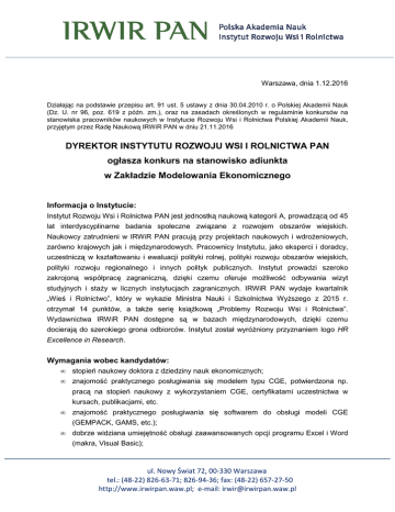 Warszawa, dnia 1.12.2016 Działając na podstawie przepisu art. 91 ust. 5 ustawy z dnia 30.04.2010 r. o Polskiej Akademii Nauk (Dz. U. nr 96, poz. 619 z późn. zm.), oraz na zasadach określonych w regulaminie konkursów na stanowiska pracowników naukowych w Instytucie Rozwoju Wsi i Rolnictwa Polskiej Akademii Nauk, przyjętym przez Radę Naukową IRWiR PAN w dniu 21.11.2016 DYREKTOR INSTYTUTU ROZWOJU WSI I ROLNICTWA PAN ogłasza konkurs na stanowisko adiunkta w Zakładzie Modelowania Ekonomicznego Informacja o Instytucie: Instytut Rozwoju Wsi i Rolnictwa PAN jest jednostką naukową kategorii A, prowadzącą od 45 lat interdyscyplinarne badania społeczne związane z rozwojem obszarów wiejskich. Naukowcy zatrudnieni w IRWiR PAN pracują przy projektach naukowych i wdroŜeniowych, zarówno krajowych jak i międzynarodowych. Pracownicy Instytutu, jako eksperci i doradcy, uczestniczą w kształtowaniu i ewaluacji polityki rolnej, polityki rozwoju obszarów wiejskich, polityki rozwoju regionalnego i innych polityk publicznych. Instytut prowadzi szeroko zakrojoną współpracę zagraniczną, dzięki czemu oferuje moŜliwość odbywania wizyt studyjnych i staŜy w licznych instytucjach zagranicznych. IRWiR PAN wydaje kwartalnik „Wieś i Rolnictwo”, który w wykazie Ministra Nauki i Szkolnictwa WyŜszego z 2015 r. otrzymał 14 punktów, a takŜe serię ksiąŜkową „Problemy Rozwoju Wsi i Rolnictwa”. Wydawnictwa IRWiR PAN dostępne są w bazach międzynarodowych, dzięki czemu docierają do szerokiego grona odbiorców. Instytut został wyróŜniony przyznaniem logo HR Excellence in Research. Wymagania wobec kandydatów: • stopień naukowy doktora z dziedziny nauk ekonomicznych; • znajomość praktycznego posługiwania się modelem typu CGE, potwierdzona np. pracą na stopień naukowy z wykorzystaniem CGE, certyfikatami uczestnictwa w kursach, publikacjami, etc. • znajomość praktycznego posługiwania się softwarem do obsługi modeli CGE (GEMPACK, GAMS, etc.); • dobrze widziana umiejętność obsługi zaawansowanych opcji programu Excel i Word (makra, Visual Basic); ul. Nowy Świat 72, 00-330 Warszawa tel.: (48-22) 826-63-71; 826-94-36; fax: (48-22) 657-27-50 http://www.irwirpan.waw.pl; e-mail: [email protected] • udział w projektach krajowych i zagranicznych, dobrze widziane doświadczenie w kierowaniu grantem lub projektem; • doświadczenie w prezentowaniu wyników badań na konferencjach w jęz. polskimi i językach konferencyjnych (w szczególności angielskim); • bardzo dobra znajomość języka angielskiego w mowie, w piśmie i czytaniu; • bardzo dobrze widziane kontakty naukowe z zagranicznymi ośrodkami badawczymi; • cechy osobowe: wychodzenie z inicjatywą, pracowitość, lojalność, koleŜeńskość, umiejętność pracy w zespole. Zgłoszenie do konkursu winno zawierać: o list motywacyjny (maksymalnie jedna strona A4); o Ŝyciorys naukowy z wyszczególnieniem działalności naukowej, dydaktycznej i organizacyjnej wraz z wykazem publikacji; o odpis dyplomu ukończenia studiów wyŜszych, oraz dyplomu doktorskiego; o kopie waŜniejszych publikacji (maksymalnie 10); o inne dokumenty potwierdzające doświadczenie zawodowe i posiadane kompetencje; o oświadczenie, Ŝe w wypadku wygrania konkursu, IRWiR PAN będzie podstawowym miejscem pracy Kandydata; o oświadczenie kandydata o wyraŜeniu zgody na przetwarzanie danych osobowych zawartych w zgłoszeniu, zgodnie z Ustawą z dnia 29.08.1997 r. o ochronie danych osobowych (Dz. U. Nr 133 poz. 883 ze zmianami). Informacje o zatrudnieniu: Osoba wyłoniona w drodze konkursu będzie zatrudniona na stanowisku adiunkta na czas określony w pełnym wymiarze czasu pracy w Zakładzie Modelowania Ekonomicznego. Do głównych zadań wybranego kandydata będzie naleŜało: realizowanie badań statutowych w Instytucie oraz ubieganie się o projekty naukowe własne, realizację kolejnego stopnia naukowego, składanie publikacji naukowych w czasopismach z listy filadelfijskiej (listy A wg. MNiSW), reprezentowanie Instytutu z wystąpieniami naukowymi na polskich i zagranicznych konferencjach naukowych, angaŜowanie się w projekty ewaluacyjne i dla praktyki oraz w szeroko pojętą aktywność rozwojową instytutu (np. organizacja konferencji, wyjazdów studyjnych, etc.). Oczekuje się teŜ, Ŝe wyłoniona osoba przygotuje w czasie krótszym niŜ przewiduje ustawa rozprawę habilitacyjną. Dokumenty naleŜy składać drogą elektroniczną na adres [email protected] do dnia 15.12.2016 r. Wybrani kandydaci zostaną zaproszeni na rozmowę kwalifikacyjną. Rozstrzygnięcie konkursu nastąpi do dnia 22.12.2016. r. Planowany termin zatrudnienia: 01.01.2017 r. Ilość etatów: 1 Osoba udzielająca informacji: Ewa Aniołkowska, tel. (22) 826-75-94, [email protected] 2