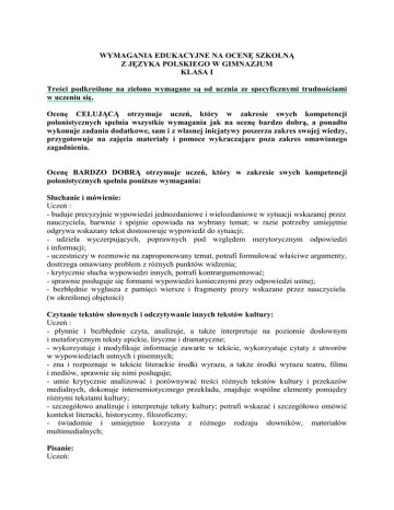 WYMAGANIA EDUKACYJNE NA OCENĘ SZKOLNĄ Z JĘZYKA POLSKIEGO W GIMNAZJUM KLASA I Treści podkreślone na zielono wymagane są od ucznia ze specyficznymi trudnościami w uczeniu się. Ocenę CELUJĄCĄ otrzymuje uczeń, który w zakresie swych kompetencji polonistycznych spełnia wszystkie wymagania jak na ocenę bardzo dobrą, a ponadto wykonuje zadania dodatkowe, sam i z własnej inicjatywy poszerza zakres swojej wiedzy, przygotowuje na zajęcia materiały i pomoce wykraczające poza zakres omawianego zagadnienia. Ocenę BARDZO DOBRĄ otrzymuje uczeń, który w zakresie swych kompetencji polonistycznych spełnia poniższe wymagania: Słuchanie i mówienie: Uczeń : - buduje precyzyjnie wypowiedzi jednozdaniowe i wielozdaniowe w sytuacji wskazanej przez nauczyciela, barwnie i spójnie opowiada na wybrany temat; w razie potrzeby umiejętnie odgrywa wskazany tekst dostosowuje wypowiedź do sytuacji; - udziela wyczerpujących, poprawnych pod względem merytorycznym odpowiedzi i informacji; - uczestniczy w rozmowie na zaproponowany temat, potrafi formułować właściwe argumenty, dostrzega omawiany problem z różnych punktów widzenia; - krytycznie słucha wypowiedzi innych, potrafi kontrargumentować; - sprawnie posługuje się formami wypowiedzi koniecznymi przy odpowiedzi ustnej; - bezbłędnie wygłasza z pamięci wiersze i fragmenty prozy wskazane przez nauczyciela. (w określonej objętości) Czytanie tekstów słownych i odczytywanie innych tekstów kultury: Uczeń : - płynnie i bezbłędnie czyta, analizuje, a także interpretuje na poziomie dosłownym i metaforycznym teksty epickie, liryczne i dramatyczne; - wykorzystuje i modyfikuje informacje zawarte w tekście, wykorzystuje cytaty z utworów w wypowiedziach ustnych i pisemnych; - zna i rozpoznaje w tekście literackie środki wyrazu, a także środki wyrazu teatru, filmu i mediów, sprawnie się nimi posługuje; - umie krytycznie analizować i porównywać treści różnych tekstów kultury i przekazów medialnych, dokonuje intersemiotycznego przekładu, znajduje wspólne elementy pomiędzy różnymi tekstami kultury; - szczegółowo analizuje i interpretuje teksty kultury; potrafi wskazać i szczegółowo omówić kontekst literacki, historyczny, filozoficzny; - świadomie i umiejętnie korzysta z różnego rodzaju słowników, materiałów multimedialnych; Pisanie: Uczeń: - sprawnie redaguje wszystkie pisemne formy wypowiedzi objęte programowymi treściami nauczania: notatka (tradycyjna i według schematu), opis (przedmiotu, postaci, przeżycia wewnętrznego), charakterystyka postaci (jednej, dwóch, zbiorowości, autocharakterystyka), opowiadanie, opowiadanie z dialogiem, sprawozdanie typu recenzja, głos w dyskusji, esej szkolny, list (otwarty, motywacyjny, prywatny), dziennik, pamiętnik, teksty publicystyczne (notatka prasowa, felieton, reportaż, artykuł), teksty użytkowe (ogłoszenia drobne, instrukcje, regulaminy), formularze i druki (telegram, depesza, przekaz pieniężny, ankieta, kwestionariusz); rozprawka, sprawozdanie, zaproszenie, dedykacja, ogłoszenie zawiadomienie, podanie - umiejętnie i sprawnie dokonuje stylizacji wybranego tekstu dostosowując jego treść do określonej przez nauczyciela sytuacji; - prawidłowo tworzy przypisy i bibliografię; Nauka o języku: Uczeń sprawnie, świadomie i funkcjonalnie wykorzystuje wiedzę językową z zakresu: - Frazeologia: (zna związki frazeologiczne omówione na zajęciach, podaje ich znaczenie dosłowne i metaforyczne; potrafi dokonać ich podziału i podać pochodzenie związku frazeologicznego, zna kontekst historyczno – literacki powstania związku; wykorzystuje właściwie związki frazeologiczne w wypowiedziach) - zna schemat komunikacji językowej, podaje przykłady różnych sytuacji, wskazuje odbiorcę, nadawcę, określa kod i kontekst wypowiedzi, rozpoznaje znaki niewerbalne, dostrzega manipulacje językowe, perswazje, rozpoznaje i posługuje się prawidłowo odmianą języka: mówioną, pisaną, oficjalną i nieoficjalną, tworzy monolog, dialog, zna zasady etykiety językowej, rozróżnia fakty od opinii) - Fleksji (części mowy odmienne i nieodmienne, osobliwości w odmianie, funkcje części mowy w formach wypowiedzi, bezbłędnie i szczegółowo rozpoznaje i określa części mowy we wskazanym wypowiedzeniu); - Składni (zna i bezbłędnie tworzy wskazane wypowiedzenia: równoważnik zdania, zdania pojedyncze, zdanie złożone – współrzędnie złożone, podrzędnie złożone przydawkowe, dopełnieniowe, okolicznikowe, wypowiedzenie wielokrotnie złożone, tworzy ich wykresy, tworzy wypowiedzenia na podstawie wykresów zna i bezbłędnie rozpoznaje części zdania i ich rodzaje, rozpoznaje związki składniowe, wyrazy poza związkami składniowymi); - Ortografii i interpunkcji (zna zasady i reguły ortograficzne i interpunkcyjne oraz bezbłędnie je stosuje) – dostosowuje się ocenę do opinii PPP Lektura: Uczeń: - Szczegółowo zna treść wszystkich wskazane przez nauczyciela lektur programowych i tekstów omawianych na zajęciach, co świadczy o świadomym i krytycznym zapoznaniu się z ich treścią, - w wypowiedziach ustnych stosuje dojrzały i krytyczny komentarz, odwołuje się do treści tekstu i innych tekstów, które nawiązują bezpośrednio lub pośrednio do omawianego tekstu; - oryginalnie, samodzielnie, krytycznie, na wysokim poziomie literackim tworzy prace pisemne, cytuje odpowiednie fragmenty z omawianego tekstu, wskazuje motywy wędrowne, dostrzega znaczenia metaforyczne; - dogłębnie zna biogramy autorów lektur, podaje daty, inne działa, inspiracje, prądy literackie) Pojęcia: Uczeń bezbłędnie wskazuje, nazywa i definiuje obowiązujące według ustaleń programowych pojęcia teoretycznoliterackie, językowe i kulturowe, czynnie posługuje się nimi w pracach pisemnych i wypowiedziach ustnych, potrafi podać przykład w tekście kultury: W starożytnym świecie: Antyk, filozofia, Biblia (kanon, apokryf, werset),