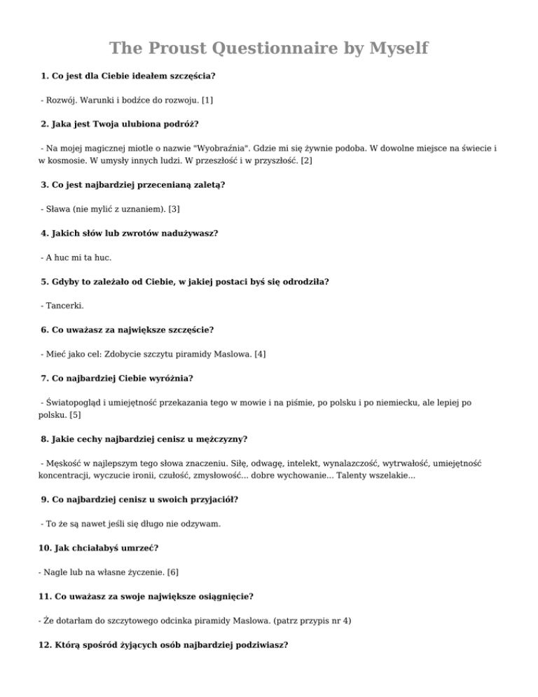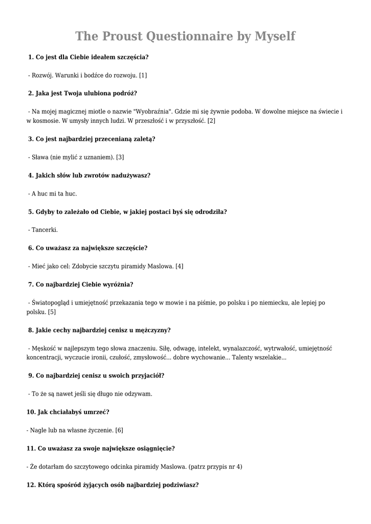 The Proust Questionnaire by Myself 1. Co jest dla Ciebie ideałem szczęścia? - Rozwój. Warunki i bodźce do rozwoju. [1] 2. Jaka jest Twoja ulubiona podróż? - Na mojej magicznej miotle o nazwie "Wyobraźnia". Gdzie mi się żywnie podoba. W dowolne miejsce na świecie i w kosmosie. W umysły innych ludzi. W przeszłość i w przyszłość. [2] 3. Co jest najbardziej przecenianą zaletą? - Sława (nie mylić z uznaniem). [3] 4. Jakich słów lub zwrotów nadużywasz? - A huc mi ta huc. 5. Gdyby to zależało od Ciebie, w jakiej postaci byś się odrodziła? - Tancerki. 6. Co uważasz za największe szczęście? - Mieć jako cel: Zdobycie szczytu piramidy Maslowa. [4] 7. Co najbardziej Ciebie wyróżnia? - Światopogląd i umiejętność przekazania tego w mowie i na piśmie, po polsku i po niemiecku, ale lepiej po polsku. [5] 8. Jakie cechy najbardziej cenisz u mężczyzny? - Męskość w najlepszym tego słowa znaczeniu. Siłę, odwagę, intelekt, wynalazczość, wytrwałość, umiejętność koncentracji, wyczucie ironii, czułość, zmysłowość... dobre wychowanie... Talenty wszelakie... 9. Co najbardziej cenisz u swoich przyjaciół? - To że są nawet jeśli się długo nie odzywam. 10. Jak chciałabyś umrzeć? - Nagle lub na własne życzenie. [6] 11. Co uważasz za swoje największe osiągnięcie? - Że dotarłam do szczytowego odcinka piramidy Maslowa. (patrz przypis nr 4) 12. Którą spośród żyjących osób najbardziej podziwiasz? - Hm, tu gorzej, bo te kilka osób zdążyło umrzeć: Lem, Kapuściński, Szymborska, Mama... I nie umiem wymienić jednej osoby. Z żyjących: Zygmunt Bauman... Amos Oz... Peter Singer... Wymieniałam spontanicznie, ale widzę, że głównie Żydzi i przewaga mężczyzn... Ale podziwiam bez względu na narodowość i płeć. 13. Kogo uważasz za bohatera? - Felixa Baumgartnera [7]. Poza tym tzw. "zwykłych bohaterów". O, i dopisuję dziś (14.5.13) Angelinę Jolie. 14. Jakiej cechy charakteru najbardziej nie lubisz u innych? - Miałkości (czy to jest cecha charakteru?). 15. Czego najbardziej żałujesz? - Że za mało zadbałam o rozwój zdolności do rysunku i tańca. A mogłam. [8] 16. Co ma dla Ciebie największą wartość? - Pamięć i rozwój. 17. Gdzie chciałabyś mieszkać? - Tu, gdzie mieszkam. Może kiedyś jeszcze gdzieś? Ponownie w Szwajcarii? W zamku na południu Francji (wtedy ze służbą, sama nie ogarnę)? W sumie zawsze mieszkałam, gdzie chciałam, więc kto wie z tą Francją? (patrz przypis nr 1) 18. Jakie jest Twoje ulubione zajęcie? - Myślenie, czytanie i pisanie. Oglądanie filmów i sztuk teatralnych. Taniec i muzyka. Kontakt ze sztuką. Głaskanie psa i kotów... 19. Jakie cechy najbardziej cenisz u kobiety? - Kobiecość w najbardziej pozytywnym tego słowa znaczeniu. Zmysłowość (przed urodą), (ale) urodę (też), tę ciekawą, oryginalną, niepowtarzalną, nienudną... a poza tym czułość, niezależność, cięty język... Oj, tam, wszystko. Talenty wszelakie... [9] 20. Czego boisz się najbardziej? - Poczucia bezsilności. 21. Z którą postacią historyczną najmocniej się identyfikujesz? - Hm, z żadną, ale jeżeli już muszę odpowiedzieć to może z George Sand? Nie, jednak z żadną. Podziwiam wiele, nie identyfikuję się z żadną. Identyfikuję się sama ze sobą. [10] 22. Której cechy charakteru najbardziej w sobie nie lubisz? - Właściwie nie ma takiej, lubię się z całym bagażem. Czasami skłonności do leniuchowania, ale lenistwo jest mi też potrzebne. Wtedy się resetuję. 23. Kiedy i gdzie byłaś najszczęśliwsza? - Kiedyś na środku Atlantyku, nocą, po 5 dniach wściekłego sztormu i jedyny raz w życiu przerobionej za to do samego spodu choroby morskiej... Sama ze sobą (ale ze śpiącym w kajucie M.). Pode mną morze, kosmos dookoła... Poza tym setki razy. O ile nie tysiące. Często bywam szczęśliwa. W stanie flow. (patrz przypis nr 1) 24. A gdyby to zależało od Ciebie, w jakiej postaci byś się odrodziła. - Tancerki takiej jak Wiola Fiuk: http://www.youtube.com/watch?v=xyFgFVfR2OY 25. Kto jest Twoim ulubionym bohaterem literackim? - Odyseusz, Robinson Cruzoe, Candid, podróżnicy... a poza tym, och, jest ich wielu, wiele... [11] 26. Jak brzmi Twoje motto? - Wierzę w życie przed śmiercią. Za to bardzo głęboko. W tym transcendentalnie i mistycznie... I w ogóle. [12] 27. W jakich okolicznościach kłamiesz? - Jak trzeba. Gdy mi tak wygodniej. (Ponieważ są "reklamacje", dlaczego przyznaję się do kłamania, wyjaśniam: gdybym powiedziała, że nie kłamię, skłamałabym, przyznając, że czasami kłamię, mówię prawdę.) 28. Jakich słów lub zwrotów nadużywasz? - A huc mi ta huc. 29. Jak określiłabyś stan swojego umysłu? - Na bardzo dobrze. Może to i nieskromnie, ale przecież właśnie do tego dążyłam całe życie, więc co się mam krygować? Tak właśnie jest. Przedtem było na dobrze z dążeniem do bardzo dobrze. Teraz dążę do lepiej, +5. Ale jak nie dodążę, to też dobrze. 30. Co ma dla Ciebie największą wartość? - Oprócz tego co powyżej (pamięć i rozwój), diamenty i wolność wyboru. 31. Twoi ulubieni pisarze? - Lem, Dostojewski, Kapuściński, Oz... Od niedawna Andreas Eschbach. (więcej w przypisie nr 11) 32. Czego najbardziej nie lubisz? - Przeciętności. Równania do średniej. 33. Co jest Twoją największą ekstrawagancją? - Ponowne zamieszkanie w Polsce. (więcej w przypisie nr 1) 34. Czego najbardziej nie lubisz w swoim wyglądzie? - Obecnie nadmiaru tłuszczu. Dawniej akceptowałam się właściwie bez większego wybrzydzania. Słyszałam na ten temat tyle dobrego, że wybrzydzanie byłoby jawnym grzechem. *** No, tak, widać, że skromność nie jest moją mocną stroną ;). Fakt, co zresztą zawsze szczerze podkreślam (i za co niektórzy mnie nie lubią). Lecz nie należy mylić tego z pokorą. Często bywam pokorna. Wobec wiedzy innych. Wobec dokonań innych. Wobec cierpień innych. Wobec talentów innych