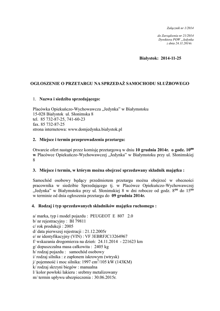 Załącznik nr 1/2014 do Zarządzenia nr 21/2014 Dyrektora POW „Jedynka z dnia 24.11.2014r. Białystok: 2014-11-25 OGŁOSZENIE O PRZETARGU NA SPRZEDAŻ SAMOCHODU SŁUŻBOWEGO 1. Nazwa i siedziba sprzedającego: Placówka Opiekuńczo-Wychowawcza „Jedynka” w Białymstoku 15-028 Białystok ul. Słonimska 8 tel. 85 732-87-25, 741-60-23 fax. 85 732-87-25 strona internetowa: www.domjedynka.bialystok.pl 2. Miejsce i termin przeprowadzenia przetargu: Otwarcie ofert nastąpi przez komisję przetargową w dniu 10 grudnia 2014r. o godz. 10ºº w Placówce Opiekuńczo-Wychowawczej „Jedynka” w Białymstoku przy ul. Słonimskiej 8 3. Miejsce i termin, w którym można obejrzeć sprzedawany składnik majątku : Samochód osobowy będący przedmiotem przetargu można obejrzeć w obecności pracownika w siedzibie Sprzedającego tj. w Placówce Opiekuńczo-Wychowawczej „Jedynka” w Białymstoku przy ul. Słonimskiej 8 w dni robocze od godz. 8ºº do 15ºº w terminie od dnia ogłoszenia przetargu do 09 grudnia 2014r. 4. Rodzaj i typ sprzedawanych składników majątku ruchomego : a/ marka, typ i model pojazdu : PEUGEOT E 807 2.0 b/ nr rejestracyjny : BI 79811 c/ rok produkcji : 2005 d/ data pierwszej rejestracji : 21.12.2005r e/ nr identyfikacyjny (VIN) : VF 3EBRFJC13264967 f/ wskazania drogomierza na dzień: 24.11.2014 - 221623 km g/ dopuszczalna masa całkowita : 2405 kg h/ rodzaj pojazdu : samochód osobowy i/ rodzaj silnika : z zapłonem iskrowym (wtrysk) j/ pojemność i moc silnika: 1997 cm3/105 kW (143KM) k/ rodzaj skrzyni biegów : manualna l/ kolor powłoki lakieru : srebrny metalizowany m/ termin upływu ubezpieczenia : 30.06.2015r. n/ termin badania technicznego : 09.01.2015r. Samochód posiada wyposażenie standardowe : autoalarm, klimatyzacja, immobilizer, szyby regulowane elektrycznie, lusterka podgrzewane i elektryczne, zamek centralny zamykany z kluczyka, Na stanie pojazdu znajduje się : cztery opony zimowe, gaśnica samochodowa, apteczka, trójkąt, koło zapasowe pełnowymiarowe, dwa kluczyki, lewarek, pokrowce na fotele. 5. Cena wywoławcza : 13 000 zł (słownie złotych: trzynaście tysięcy) 6. Wymagania jakie powinna spełniać oferta w prowadzonym przetargu. pisemna oferta (załącznik nr 1 do regulaminu) oświadczenie oferenta, że zapoznał się ze stanem przedmiotu lub, że ponosi odpowiedzialność za skutki wynikające z rezygnacji z oględzin (załącznik nr 2 do regulaminu) wzór umowy kupna – sprzedaży (załącznik nr 3 do regulaminu) oświadczenie o zapoznaniu się ze wzorem umowy kupna - sprzedaży (załącznik nr 4 do regulaminu) Regulamin przeprowadzenia przetargu pisemnego na sprzedaż samochodu osobowego wraz z załącznikami znajduje się na: - stronie internetowej: www.domjedynka.bialystok.pl - tablicy ogłoszeń : w Placówce Opiekuńczo-Wychowawczej „Jedynka” w Białymstoku przy ul. Słonimskiej - BIP Białystok 7. Termin, miejsce i tryb złożenia oferty oraz okres, w którym oferta jest wiążąca : Ofertę należy złożyć w zamkniętej kopercie z dopiskiem „Oferta przetargowa na zakup samochodu marki PEUGEOT 807” Oferty pisemne należy składać w dni robocze w godz. 8ºº – 15ºº nie później jednak niż do dnia 09 grudnia 2014r. do godz. 15oo w sekretariacie Placówki OpiekuńczoWychowawczej „Jedynka” w Białymstoku przy ul. Słonimskiej 8. Oferta jest wiążąca do 14 dni, od terminu wyznaczonego do składania ofert. 8. Organizatorowi przetargu przysługuje prawo zamknięcia przetargu bez wybrania którejkolwiek z ofert, bez podania przyczyny. REGULAMIN PRZEPROWADZENIA PRZETARGU PISEMNEGO NA SPRZEDAŻ SAMOCHODU OSOBOWEGO BĘDĄCEGO MIENIEM PLACÓWKI OPIEKUŃCZO-WYCHOWAWCZEJ W BIAŁYMSTOKU Tryb postępowania: „JEDYNKA” Postępowanie jest prowadzone w trybie przetargu pisemnego. Cel postępowania: Celem postępowania jest: - sprzedaż pojazdu samochodowego - uzyskanie najwyższej ceny sprzedaży Organizator: 1. Organizatorem przetargu pisemnego jest Placówka Opiekuńczo-Wychowawcza „Jedynka” w Białymstoku przy ul. Słonimskiej 8 2. Organizator powoła do przeprowadzenia przetargu zespół składający się z co najmniej 3 osób zwany dalej komisją przetargową. Przedmiot przetargu pisemnego: 1. Przedmiotem przetargu jest samochód osobowy marki PEUGEOT 807, 8 osobowy, nr rejestracyjny pojazdu: BI 79811 rok produkcji 2005, data pierwszej rejestracji: 21.12.2005r., rodzaj silnika: z zapłonem iskrowym (wtrysk) , pojemność: 1997cm³, skrzynia biegów: manualna, kolor powłoki lakieru: srebrny metalizowany 2. Cena wywoławcza została ustalona na podstawie wyceny rzeczoznawcy Nr 71/21/14 z dnia 27.10.2014r. Warunki sprzedaży: Warunkiem przystąpienia do kupna jest złożenie do dnia 09 grudnia 2014r. w sekretariacie Placówki Opiekuńczo-Wychowawczej „Jedynka” w Białymstoku przy ul. Słonimskiej 8 do godziny 15ºº pisemnej oferty w zamkniętej kopercie z napisem „Oferta przetargowa na zakup samochodu marki PEUGEOT 807”. 1. O prawie kupna decyduje najkorzystniejsza oferta cenowa. 2. W przypadku kiedy najkorzystniejsze oferty okażą się równorzędne, zostanie zorganizowana licytacja ograniczona do oferentów, którzy złożyli te oferty. Przedmioty uprawnione do zakupu: 1. W postępowaniu mogą brać udział osoby fizyczne, prawne oraz jednostki organizacyjne nieposiadające osobowości prawnej uprawnione do prowadzenia działalności gospodarczej, które złożą ofertę zakupu. 2. W sprzedaży nie mogą uczestniczyć : Dyrekcja Placówki Opiekuńczo-Wychowawczej „Jedynka” w Białymstoku , członkowie komisji przetargowej, osoby bliskie tym osobom, a także osoby, które pozostają z członkami komisji w takim stosunku prawnym lub faktycznym, że może budzić to uzasadnione wątpliwości co do bezstronności komisji. Komisja: 1. Czynności związane z przeprowadzeniem sprzedaży wykonuje komisja w następującym składzie: - przewodniczący – Jacek Przesmycki - zastępca przewodniczącego – Anat
