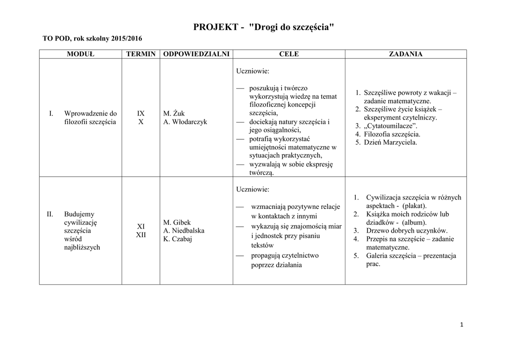PROJEKT - "Drogi do szczęścia" TO POD, rok szkolny 2015/2016 MODUŁ TERMIN ODPOWIEDZIALNI CELE ZADANIA Uczniowie: I. Wprowadzenie do filozofii szczęścia IX X M. Żuk A. Włodarczyk poszukują i twórczo wykorzystują wiedzę na temat filozoficznej koncepcji szczęścia, dociekają natury szczęścia i jego osiągalności, potrafią wykorzystać umiejętności matematyczne w sytuacjach praktycznych, wyzwalają w sobie ekspresję twórczą. 1. Szczęśliwe powroty z wakacji – zadanie matematyczne. 2. Szczęśliwe życie książek – eksperyment czytelniczy. 3. „Cytatoumilacze”. 4. Filozofia szczęścia. 5. Dzień Marzyciela. Uczniowie: 1. II. Budujemy cywilizację szczęścia wśród najbliższych XI XII M. Gibek A. Niedbalska K. Czabaj wzmacniają pozytywne relacje w kontaktach z innymi wykazują się znajomością miar i jednostek przy pisaniu tekstów propagują czytelnictwo poprzez działania 2. 3. 4. 5. Cywilizacja szczęścia w różnych aspektach - (plakat). Książka moich rodziców lub dziadków - (album). Drzewo dobrych uczynków. Przepis na szczęście – zadanie matematyczne. Galeria szczęścia – prezentacja prac. 1 Uczniowie: III. Żyj sportowo, aktywnie i zdrowo I II B. Sajewicz G. Wawrzyniak M. Tuz radzą sobie z nadmiernym obciążeniem kręgosłupa znają zasady zdrowego odżywiania i picia odpowiedniej ilości wody rozwijają aktywność ruchową, uprawiają sporty zimowe znają naturalne sposoby leczenia rozpoznają rośliny lecznicze występujące w przyrodzie Uczniowie: IV. Budzenie szczęścia III IV E. Bury M. Zaworska B. Hawron rozwijają różnorodne uzdolnienia w zależności od zainteresowań wnikliwie obserwują otaczający świat przejawiają wrażliwość na piękno budzącej się do życia przyrody wykorzystują umiejętności matematyczne w sytuacjach praktycznych Uczniowie: V. Azymut na morze V VI J. Trybel T. Wójtowicz J. Brudniak w sposób kreatywny rozwijają swoje twórcze predyspozycje poszukują informacji na Zadania: 1. 2. Dbamy o własny kręgosłup Dbamy o własne zdrowie Czysta woda zdrowia doda – promowanie picia wody i jej dobroczynny wpływ na nasze samopoczucie i prawidłowy rozwój naszego organizmu Pamiętamy o drugim śniadaniu 3.”Leki z bożej apteki” - stosowanie zasad medycyny niekonwencjonalnej. Zadania: 1. Pobudka! „Co nam w duszy gra’ - czas na wiosenną aktywność. 2. Pobudka! „Odkrywamy piękno”- tworzymy wiosenną fotogalerię. 3. Pobudka! „Przyroda już nie śpi”- podpatrujemy budzącą się do życia przyrodę. 4. Pobudka! „Matematycy na start” – liczby wokół nas. Zadania: 1.Atrakcje Rewala w pigułce – plakaty i prezentacje 2.„Cyferkowo” pierwszaki na matematyczno -muzycznej otwartej 2 temat atrakcji turystycznych rozumieją jaką wartość w życiu człowieka stanowi szczęście rozwijają umiejętność sztuki samoobrony, debatowania, pisania japońskiej kaligrafii. scenie – inscenizacja + lekcja piosenek o szczęściu. 3. „ W Krainie Kwitnącej Wiśni” – tydzień w Japonii: - warsztaty dla rodziców i nauczycieli (samoobrona) - spotkanie z zawodnikami LKS „Zarzewie” - konferencja – „Jak można osiągnąć sukces sportowy”, - pokaz karate – grupa początkująca, - warsztaty kaligrafii dla uczniów – nauka pisania i czytania liczebników od 1-10 w języku japońskim, słownik 3