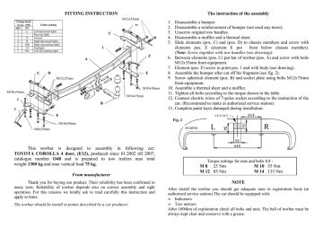 FITTING INSTRUCTION The instruction of the assembly M12x35mm Clamp mark in acc. with ISO PN 1 L 2 + 3 31 4 R 5 58R 6 54 7 58L 1. 2. 3. 4. 5. D Cables joining Left directional lights Rear fog lights Ground Right directional lights Right side parking lights Stoplights Left side parking lights C 1 F A C D E M12x35mm M10x50mm M10x35mm M10x35mm 1 6. 7. 8. 9. 10. 11. 12. B 13. F Disassemble a bumper. Disassemble a reinforcement of bumper (not used any more). Unscrew original tow handles. Disassemble a muffler and a thermal sheet. Slide elements (pos. C) and (pos. D) to chassis members and screw with elements pos. E (element E put from below chassis member). (Note: Screw together with tow handles (see drawing)). Between elements (pos. C) put bar of towbar (pos. A) and screw with bolts M12x35mm from equipment. Element (pos. F) screw in point pos. 1 and with body (see drawing). Assemble the bumper after cut off his fragment (see fig. 2). Screw spherical element (pos. B) and socket plate using bolts M12x75mm from equipment. Assemble a thermal sheet and a muffler. Tighten all bolts according to the torque shown in the table. Connect electric wires of 7-poles socket according to the instruction of the car. (Recommend to make at authorized service station). Complete paint layer damaged during installation. E CUT CUT OUT OUT Wyciąć Fig. 2 M10x50mm ZDERZAK BUMPER M8x25mm This towbar is designed to assembly in following car: TOYOTA COROLLA 4 door, (E12), produced since 01.2002 till 2007, catalogue number O48 and is prepared to tow trailers max total weight 1300 kg and max vertical load 75 kg. From manufacturer Thank you for buying our product. Their reliability has been confirmed in many tests. Reliability of towbar depends also on correct assembly and right operation. For this reasons we kindly ask to read carefully this instruction and apply to hints. The towbar should be install in points described by a car producer. R L Torque settings for nuts and bolts 8,8 : M 8 25 Nm M 12 85 Nm M 10 55 Nm M 14 135 Nm NOTE After install the towbar you should get adequate note in registration book (at authorised service station).The car should be equipped with: • Indicators • Tow mirrors After 1000km of exploitation check all bolts and nuts. The ball of towbar must be always kept clear and conserve with a grease. PPUH AUTO-HAK S.J. Produkcja Zaczepów Kulowych Henryk & Zbigniew Nejman 76-200 SŁUPSK ul. Słoneczna 16K tel/fax (059) 8-414-414; 8-414-413 E-mail: [email protected] www. autohak.com.pl Towing hitch (without electrical set) Class: A50-X Cat. no. O48 Technical data: D-value: 7,37 kN maximum trailer weight: 1300 kg maximum vertical cup load: 75 kg Designed for: Manufacturer: TOYOTA Model: COROLLA Type: 4 door (E12) produced since 01.2002 till 2007 Approval number acc. to regulations EKG/ONZ 55.01: E20-55R-01 1033 Foreword This towbar is designed according to rules of safety traffic regulations. The towing hitch is a safety component and can be install only by qualified personnel. Any alteration or conversion of the towing hitch is prohibited and would lead to cancellation of design certification. Remove insulating compound and underseal from vehicle (if present) in the area of the matting surfaces of the towing hitch. The vehicle manufacturer’s specifications regarding trailer load and max. vertical cup load are decisive for driving whereat values for the towing hitch cannot be exceeded. D-value formula: Max trailer weight [kg] x Max vehicle weight [kg] Max trailer weight [kg] + Max vehicle weight [kg] X 9,81 = 1000 D [kN] INSTRUCTION De montage et d’exploitation du dispositif d'attelage à boule Désignation de borne selon la norme ISO PN 1 L 2 3 + 31 4 R 5 6 7 58R 54 58L Instructions de montage 1. 2. 3. 4. 5. M12x35mm Connexion des câbles D Pour indicateurs de direction gauche Feux de brouillard arrière Au poids du véhicule Pour indicateurs de direction droite Feux de circulation droites Pour feux de freinage Feux de circulation gauches C 6. 1 F A C D E 7. 8. 9. 10. 11. 12. M12x35mm M10x50mm 13. Démonter le pare-chocs. Démonter le renfort du pare-chocs, il ne sera plus utilisé. Démonter les poignées de transport d’origine. Démonter le silencieux d'échappement et dévisser le bouclier thermique. Faire glisser les éléments de l’attelage (pos.C) et (pos.D) dans les longerons et serrer avec les éléments (pos.E). Placer les éléments (pos.E) du dessous du longeron. (Attention: Serrer avec les poignées de transport (voir le dessin)). Faire glisser la poutre principale de l’attelage (pos.A) entre les éléments (pos.C) et serrer à l’aide des vis M12x35mm. Serrer l’élément (pos.F) à l’emplacement (pos.1) de l’attelage et avec la carrosserie. Découper une partie du pare-chocs (voir le dessin 2), monter le pare-chocs. Fixer la boule d’attelage (pos.B) avec la tôle sous la prise à l’aide des vis M12x75mm. Monter le bouclier thermique et le silencieux d'échappement. Serrer toutes les vis aux couples de serrage, comme indiqué dans le tableau. Connecter les câbles de la prise 7 – à l'installation électrique en conformité avec les instructions d'une usine automobile (recommandé la mise en œuvre d’une stationservice autorisée). Remplir des pertes de peinture causées durant l'installation. M10x35mm M10x35mm 1 Dessin 2 découper B F le pare-chocs R L E Dessin 1 M10x50mm M8x25mm Le dispositif d'attelage à boule est conçu pour être monté dans la voiture: TOYOTA COROLLA, 4 portes (E12), produit à partir de 01.2002 au 2007, numéro de catalogue O48 et est utilisé pour tirer des remorques du poids total 1300 kg et de la pression totale sur la boule max 75 kg. DE LA PART DU FABRICANT Merci d'avoir choisi le dispositif d'attelage à boule produit par notre société. Son fiabilité a été confirmée dans de nombreux tests et par les opinions des clients satisfaits. Toutefois, la fiabilité des dispositifs d'attelage à boule dépend aussi d'installation et d