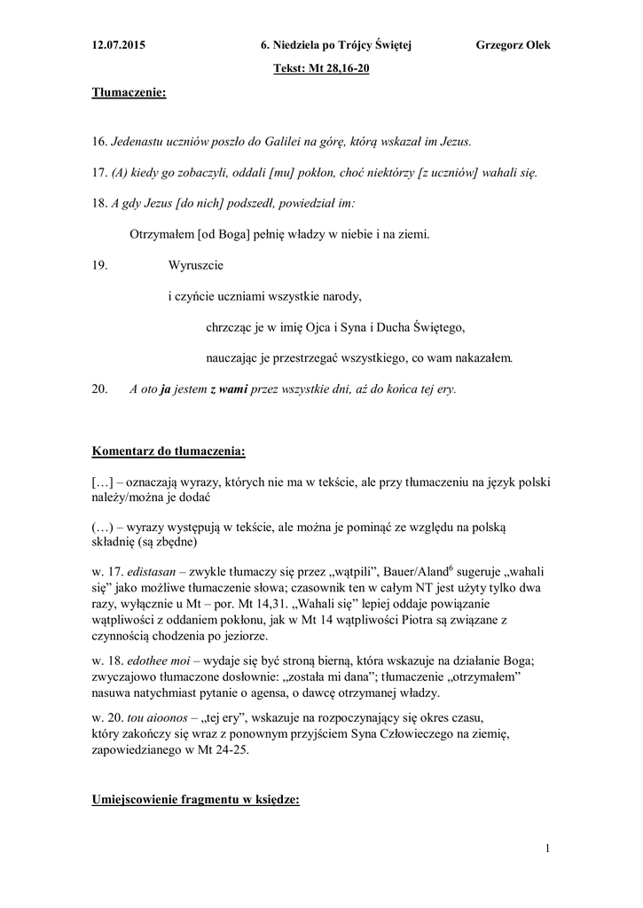 12.07.2015 6. Niedziela po Trójcy Świętej Grzegorz Olek Tekst: Mt 28,16-20 Tłumaczenie: 16. Jedenastu uczniów poszło do Galilei na górę, którą wskazał im Jezus. 17. (A) kiedy go zobaczyli, oddali [mu] pokłon, choć niektórzy [z uczniów] wahali się. 18. A gdy Jezus [do nich] podszedł, powiedział im: Otrzymałem [od Boga] pełnię władzy w niebie i na ziemi. 19. Wyruszcie i czyńcie uczniami wszystkie narody, chrzcząc je w imię Ojca i Syna i Ducha Świętego, nauczając je przestrzegać wszystkiego, co wam nakazałem. 20. A oto ja jestem z wami przez wszystkie dni, aż do końca tej ery. Komentarz do tłumaczenia: […] – oznaczają wyrazy, których nie ma w tekście, ale przy tłumaczeniu na język polski należy/można je dodać (…) – wyrazy występują w tekście, ale można je pominąć ze względu na polską składnię (są zbędne) w. 17. edistasan – zwykle tłumaczy się przez „wątpili”, Bauer/Aland6 sugeruje „wahali się” jako możliwe tłumaczenie słowa; czasownik ten w całym NT jest użyty tylko dwa razy, wyłącznie u Mt – por. Mt 14,31. „Wahali się” lepiej oddaje powiązanie wątpliwości z oddaniem pokłonu, jak w Mt 14 wątpliwości Piotra są związane z czynnością chodzenia po jeziorze. w. 18. edothee moi – wydaje się być stroną bierną, która wskazuje na działanie Boga; zwyczajowo tłumaczone dosłownie: „została mi dana”; tłumaczenie „otrzymałem” nasuwa natychmiast pytanie o agensa, o dawcę otrzymanej władzy. w. 20. tou aioonos – „tej ery”, wskazuje na rozpoczynający się okres czasu, który zakończy się wraz z ponownym przyjściem Syna Człowieczego na ziemię, zapowiedzianego w Mt 24-25. Umiejscowienie fragmentu w księdze: 1 12.07.2015 Mt 28,16-20 jest 6. Niedziela po Trójcy Świętej Grzegorz Olek ostatnim segmentem księgi, wyraźnie oddzielonym od poprzednich – wizyty kobiet przy grobie i spotkania zmartwychwstałego Jezusa (Mt 28,1-10), relacji o przekupieniu strażników grobu i wynikłej z tego interpretacji pustego grobu (Mt 28,11-15). Ten fragment należy czytać w odniesieniu do całości przekazu ewangelii Mateusza – pewne tematy zostają ponownie podjęte, niektóre rozwinięte, a zapowiedzi zostają wypełnione. Komentarz: w.16. Góra w tradycji biblijnej jest miejscem bliskości z Bogiem, choć w tym fragmencie może także chodzić o teren górzysty (por. Mt 14,23). Galilea rozpoczyna i zamyka okres misji Jezusa na ziemi (Mt 4,12nn.). Górę można łączyć z motywem Kazania na Górze, gdzie Jezus jest przedstawiony jako nowy Mojżesz, normatywnie wykładając przykazania Tory i praktyki religijne (wyjaśniając ich pierwotny sens i cel). W pierwszej ewangelii kanonicznej nie mamy narracji o spotkaniu kobiet z uczniami, ani o wskazaniu przez Jezusa miejsca spotkania. Uczniowie idą na miejsce spotkania wierząc temu, co powiedziały im kobiety. w.17. Pokłon uczniów, czyli wyrażenie szacunku i oddania, należałoby czytać w powiązaniu z Mt 4,8-9, gdzie szatan obiecuje Jezusowi władzę nad wszystkimi królestwami ziemi w zamian za oddanie pokłonu – władza, którą otrzymał Jezus po zmartwychwstaniu znacznie przewyższa obiecaną przez diabła (Mt 28,18). Część uczniów ma wątpliwości, waha się, nie może przezwyciężyć krytycznego dystansu. Wątpliwości należy łączyć z oddaniem pokłonu, które staje się ambiwalentnym gestem części uczniów, podobnie jak w historii o Piotrze chodzącym po wodzie w Mt 14,31. Możliwe, że Łk 24,37 wskazuje, o jaki rodzaj wątpliwości chodziło. w.18. Jezus przezwycięża dystans fizyczny, najprawdopodobniej również wątpliwości uczniów (por. Łk 24,39) i przekazuje uczniom przesłanie, nazywane tradycyjnie nakazem misyjnym. Zastanawiać mogą różnice w przedstawieniu ostatniego spotkania zmartwychwstałego z uczniami według czterech ewangelii, które są związane z różnym teologicznym akcentem poszczególnych ewangelii. Słowa Jezusa rozpoczynają się od strony biernej, która wydaje się wskazywać na Boga jako dawcę władzy. Pełnia władzy w niebie i na ziemi oznacza władzę realną, atrybut Boga Izraela, którą otrzymał zmartwychwstały Jezus. Może to być aluzja do księgi Daniela 7,13-14. Otrzymane przez Jezusa pełnomocnictwo jest podstawą nakazu misyjnego i wskazuje na godność zmartwychwstałego. w.19. Naczelnym zadaniem jedenastu jest czynienie uczniami (gr. matheeteusate). Termin ten oddaje charakter pierwszej ewangelii kanonicznej, która kładzie największy nacisk na przekazanie nauki, co widać w samym układzie nauki Jezusa w tej księdze. Jedenastu ma czynić innych uczniami Jezusa – wynika to z całości wersetu. Jedenastu jest posłanych do wszystkich narodów (panta ta ethnee). Jest to rozszerzenie misji skierowanej do Izraela również na narody pogańskie – bazuje ono na godności zmartwychwstałego Jezusa, który ma wszelką władzę. 2 12.07.2015 6. Niedziela po Trójcy Świętej Grzegorz Olek Czynienie uczniami jest dookreślone przez trzy formy czasownikowe (w tekście oryginalnym są to imiesłowy): wyruszenie, chrzczenie i nauczanie. Chrzest jako ryt inicjacji był powiązany z podstawowym nauczaniem o wierze chrześcijańskiej i konwersją, która w przypadku misji wśród nie-Żydów oznaczała zerwanie z wcześniejszymi wierzeniami, najczęściej politeistycznymi. Postawienie Jezusa na równi z Bogiem Ojcem i Duchem Świętym podkreśla jego boskość i jest jedną z wczesnych formuł trynitarnych. Nauczanie przestrzegania nauki Jezusa wydaje się odnosić w szczególności do Kazania na Górze, które w Ewangelii Mateusza jest interpretacją Tory i tradycji, które Jezus wypełnia, a nie znosi (Mt 5,17). Równie istotna wydaje się być mowa Jezusa o zasadach panujących we wspólnocie uczniów z Mt 18, a dalej trzy pozostałe duże mowy Jezusa (Mt 10; 13; 23-25). Bycie uczniem jest ściśle związane z trzymaniem się nauki Jezusa. Ze względu na nacisk położ