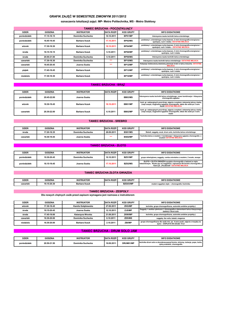 GRAFIK ZAJĘĆ W SEMESTRZE ZIMOWYM 2011/2012 oznaczenia lokalizacji zajęć: MP- Metro Politechnika, MS - Metro Stokłosy TANIEC BRZUCHA - POCZĄTKUJĄCY DZIEŃ GODZINA INSTRUKTOR DATA ROZP. KOD GRUPY INFO DODATKOWE poniedziałek 17.15-18.15 Dominika Suchecka 10.10.2011 BP01/MP Intensywna nauka techniki tańca orientalnego poniedziałek 18.45-19.45 Barbara Ilczuk 17.10.2011 BP02/MS podstawy t. orientalnego-ruchy bazowe, 2 mini choreografie-energiczna i spokojna, ruch i relaks- OSTATNIE MIEJSCA wtorek 17.30-18.30 Barbara Ilczuk 18.10.2011 BP04/MP podstawy t. orientalnego-ruchy bazowe, 2 mini choreografie-energiczna i spokojna, ruch i relaks – OSTATNIE MIEJSCA środa 18.15-19.15 Barbara Ilczuk 5.10.2011 BP08/MP podstawy t. orientalnego-ruchy bazowe, 2 mini choreografie-energiczna i spokojna, ruch i relaks środa 20.00-21.00 Dominika Suchecka 5.10.2011 BP09/MS Intensywna nauka techniki tańca orientalnego czwartek 17.30-18.30 Dominika Suchecka *** BP10/MS Intensywna nauka techniki tańca orientalnego- OSTATNIE MIEJSCA czwartek 19.45-20.45 Joanna Suska *** BP12/MP Kołysząc kobiecością stawiamy pierwsze kroki w tańcu brzucha. OSTATNIE MIEJSCA piątek 17.45-18.45 Barbara Ilczuk BP13/MP podstawy t. orientalnego-ruchy bazowe, 2 mini choreografie-energiczna i spokojna, ruch i relaks niedziela 17.30-18.30 Barbara Ilczuk BP16/MP podstawy t. orientalnego-ruchy bazowe, 2 mini choreografie-energiczna i spokojna, ruch i relaks TANIEC BRZUCHA - BRĄZ DZIEŃ GODZINA INSTRUKTOR poniedziałek 20:45-22.00 Joanna Suska wtorek 18.30-19.45 Barbara Ilczuk czwartek 20.30-22.00 Barbara Ilczuk DATA ROZP. KOD GRUPY INFO DODATKOWE BB03/MS Intensywna nauka techniki tańca orientalnego, nowe kombinacje + klasyczna choreografia egipska 18.10.2011 BB01/MP kont. gr. wakacyjnych pocz+brąz, zajęcia z woalem i elementy tańca z laską (raqs asaya), oryginalne egipskie choreografie, także dla osób po 3 sem. Nauki OSTATNIE MIEJSCA 6.10.2011 BB02/MP kont. gr. wakacyjnych pocz+brąz, zajęcia z woalem i elementy tańca z laską (raqs asaya), oryginalne egipskie choreografie, także dla osób po 3 sem. nauki TANIEC BRZUCHA - SREBRO DZIEŃ GODZINA INSTRUKTOR DATA ROZP. KOD GRUPY INFO DODATKOWE środa 17.20-18.35 Dominika Suchecka 28.09.2011 BS01/MS Baladi, saggaty, woal, drum solo, technika tańca orientalnego czwartek 18.30-19.45 Joanna Suska *** BS02/MP Technika tańca z woalem + kombinacje + klasyczna egipska choreografia z woalem OSTATNIE MIEJSCA TANIEC BRZUCHA - ZŁOTO DZIEŃ GODZINA INSTRUKTOR DATA ROZP. KOD GRUPY INFO DODATKOWE poniedziałek 19.30-20.45 Dominika Suchecka 10.10.2011 BZ01/MP grupa rekwizytowa, saggaty, rumba orientalna z woalem, 2 woale, assaye poniedziałek 18.15-19.45 Joanna Suska 17.10.2011 BZ02/MS ZŁOTO + ZŁOTA GWIAZDA syryjska choreografia z laskami w stylu kabaretowym, Nauka gry na saggatach, najnowsza flirciarska choreografia z Kairu pt. „Pocałunek” OSTATNIE MIEJSCA TANIEC BRZUCHA ZŁOTA GWIAZDA DZIEŃ GODZINA INSTRUKTOR czwartek 19.15-20.30 Barbara Ilczuk DATA ROZP. KOD GRUPY INFO DODATKOWE BZG03/MP modern egyptian style – choreografia i technika TANIEC BRZUCHA - ZESPOŁY Dla nowych chętnych osób przed zapisem wymagana jest rozmowa z instruktorem DZIEŃ GODZINA INSTRUKTOR DATA ROZP. KOD GRUPY INFO DODATKOWE wtorek 17.30-18.45 Kamila Gołębiewska 27.09.2011 ZKG/MP technika, grupa choreograficzna, autorskie ambitne projekty:) środa 19.15-20.45 Joanna Suska 12.10.2011 ZJS/MP Saggaty + analiza rytmiczna + choreografia z elementami tańca klasycznego (baletu) i drum solo technika, grupa choreograficzna, autorskie ambitne projekty:) środa 17.45-19.00 Katarzyna Wronka 21.09.2011 ZKW/MP czwartek 18.30-20.00 Dominika Suchecka 6.10.2011 ZDS/MS saggaty, fan veils, baladi, megance niedziela 18.30-20.00 Barbara Ilczuk 2.10.2011 ZBI/MP grupa choreograficzna dla osób min. po 4 sem nauki, zajęcia z muzyką na żywo – DOPŁATA DO ZAJĘĆ 10 zł TANIEC BRZUCHA - DRUM SOLO JAM DZIEŃ poniedziałek GODZINA 20.50-21.50 INSTRUKTOR Dominika Suchecka DATA ROZP. 19.09.2011 KOD GRUPY INFO DODATKOWE DRUM01/MP technika drum solo w skondensowanej formie, shimmy, izolacje, pops, locks, rytmy arabskie, choreografie SEXY BELLYDANCE – NOWOŚĆ Zajęcia dla osób tańczących taniec brzucha min. 1 semestr, które szukają tanecznych wyzwań i chcą wzbogacić swoją technikę. DZIEŃ GODZINA INSTRUKTOR DATA ROZP. KOD GRUPY INFO DODATKOWE środa 19.00-20.15 Katarzyna Wronka 19.10.2011 BV01/MP Poznasz styl choreografii z videoclipów, obudzisz swój seksapil,. Zapraszamy na autorską zmysłową fuzję stylów – w programie elementy BURLESKI OSTATNIE MIEJSCA TANIEC BRZUCHA - FOLKLOR ARABSKI POCZĄTKUJĄCY DZIEŃ GODZINA INSTRUKTOR poniedziałek 19.45-20.45 Joanna Suska DATA ROZP. KOD GRUPY INFO DODATKOWE BPF01/MS Dwie choreografie: dynamiczne egipskie szaabi i przestrzenne uwodzicielskie khaleegy TANIEC BRZUCHA - FOLKLOR ARABSKI BRĄZ START ! DZIEŃ GODZINA INSTRUKTOR DATA ROZP. KOD GRUPY INFO DODATKOWE środa 20.45-22.00 Joanna Suska 12.10.2011 BPFB01/MP brąz + powakacyjna: dwie choreografie: pełne zwrotów akcji beledi i kokieteryjna milaja leff TANIEC BRZUCHA - FOLKLOR ARABSKI KONTYNUACJA WARSZTATÓW DZIEŃ sobota GODZINA 12.30-14.00 INSTRUKTOR DATA ROZP. Barbara Ilczuk KOD GRUPY INFO DODATKOWE BPFK01/MP choreografie: 1. skoczne shaabi, 2. wesoły taniec nubijski, 3. zalotna melaya leff, 3. zmysłowe khaleegy Active Practice (Zajęcia cykliczne – warsztatowe) Terminy będą podawane na bieżąco. DZIEŃ GODZINA INSTRUKTOR sobota 11.15-12.30 Barbara Ilczuk DATA ROZP. KOD GRUPY INFO DODATKOWE AP01/MP technika t. orientalnego wpisana w mini choreografie (grafik tematów dostępny wkrótce w siedzibie i na str szkoły) TRIBAL FUSION – POCZĄTKUJĄCY DZIEŃ GODZINA INSTRUKTOR DATA ROZP. KOD GRUPY poniedziałek 18.15-19.30 Dominika Suchecka 19.09.2011 TRB01/MP INFO DODATKOWE T. F. łączy w sobie elementy tańca orientalnego, tańców indyjskich, cygańskich, ale i tańca współczesnego. Po min. 1 se