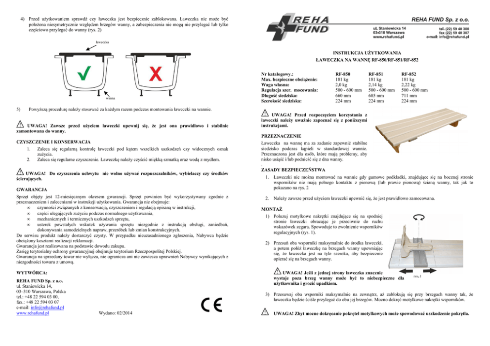 4) Przed użytkowaniem sprawdź czy ławeczka jest bezpiecznie zablokowana. Ławeczka nie może być położona niesymetrycznie względem brzegów wanny, a zabezpieczenia nie mogą nie przylegać lub tylko częściowo przylegać do wanny (rys. 2) ławeczka INSTRUKCJA UŻYTKOWANIA ŁAWECZKA NA WANNĘ RF-850/RF-851/RF-852 wanna 5) Nr katalogowy.: Max. bezpieczne obciążenie: Waga własna: Regulacja szer. mocowania: Długość siedziska: Szerokość siedziska: RF-850 181 kg 2,0 kg 500 - 600 mm 660 mm 224 mm RF-851 181 kg 2,14 kg 500 - 600 mm 685 mm 224 mm RF-852 181 kg 2,22 kg 500 - 600 mm 711 mm 224 mm Powyższą procedurę należy stosować za każdym razem podczas montowania ławeczki na wannie. UWAGA! Zawsze przed użyciem ławeczki upewnij się, że jest ona prawidłowo i stabilnie zamontowana do wanny. UWAGA! Przed rozpoczęciem korzystania z ławeczki należy uważnie zapoznać się z poniższymi instrukcjami. PRZEZNACZENIE CZYSZCZENIE I KONSERWACJA 1. 2. Zaleca się regularną kontrolę ławeczki pod kątem wszelkich uszkodzeń czy widocznych oznak zużycia. Zaleca się regularne czyszczenie. Ławeczkę należy czyścić miękką szmatką oraz wodą z mydłem. UWAGA! Do czyszczenia uchwytu nie wolno używać rozpuszczalników, wybielaczy czy środków ścierających. GWARANCJA Sprzęt objęty jest 12-miesięcznym okresem gwarancji. Sprzęt powinien być wykorzystywany zgodnie z przeznaczeniem i zaleceniami w instrukcji użytkowania. Gwarancja nie obejmuje: • czynności związanych z konserwacją, czyszczeniem i regulacją opisaną w instrukcji, • części ulegających zużyciu podczas normalnego użytkowania, • mechanicznych i termicznych uszkodzeń sprzętu, • usterek powstałych wskutek używania sprzętu niezgodnie z instrukcją obsługi, zaniedbań, dokonywania samodzielnych napraw, przeróbek lub zmian konstrukcyjnych. Do serwisu produkt należy dostarczyć czysty. W przypadku nieuzasadnionego zgłoszenia, Nabywca będzie obciążony kosztami realizacji reklamacji. Gwarancja jest realizowana na podstawie dowodu zakupu. Zasięg terytorialny ochrony gwarancyjnej obejmuje terytorium Rzeczpospolitej Polskiej. Gwarancja na sprzedany towar nie wyłącza, nie ogranicza ani nie zawiesza uprawnień Nabywcy wynikających z niezgodności towaru z umową. 1. Ławeczki nie można montować na wannie gdy gumowe podkładki, znajdujące się na bocznej stronie wsporników nie mają pełnego kontaktu z pionową (lub prawie pionową) ścianą wanny, tak jak to pokazano na rys. 2 2. Należy zawsze przed użyciem ławeczki upewnić się, że jest prawidłowo zamocowana. MONTAŻ 1) Poluzuj motylkowe nakrętki znajdujące się na spodniej stronie ławeczki obracając je przeciwnie do ruchu wskazówek zegara. Spowoduje to zwolnienie wsporników regulacyjnych (rys. 1). 2) Przesuń oba wsporniki maksymalnie do środka ławeczki, a potem połóż ławeczkę na brzegach wanny upewniając się, że ławeczka jest na tyle szeroka, aby bezpiecznie opierać się na brzegach wanny. UWAGA! Jeśli z jednej strony ławeczka znacznie wystaje poza brzeg wanny może być to niebezpieczne dla użytkownika i grozić upadkiem. WYTWÓRCA: REHA FUND Sp. z o.o. ul. Staniewicka 14, 03–310 Warszawa, Polska tel.: +48 22 594 03 00, fax.: +48 22 594 03 07 e-mail: [email protected] www.rehafund.pl Ławeczka na wannę ma za zadanie zapewnić stabilne siedzisko podczas kąpieli w standardowej wannie. Przeznaczona jest dla osób, które mają problemy, aby nisko usiąść i/lub podnieść się z dna wanny. . ZASADY BEZPIECZEŃSTWA . rys 1 3) Przesuwaj oba wsporniki maksymalnie na zewnątrz, aż zablokują się przy brzegach wanny tak, że ławeczka będzie ściśle przylegać do obu jej brzegów. Mocno dokręć motylkowe nakrętki wsporników. Wydano: 02/2014 UWAGA! Zbyt mocne dokręcanie pokręteł motylkowych może spowodować uszkodzenie pokrętła. 4) Przed użytkowaniem sprawdź czy ławeczka jest bezpiecznie zablokowana. Ławeczka nie może być położona niesymetrycznie względem brzegów wanny, a zabezpieczenia nie mogą nie przylegać lub tylko częściowo przylegać do wanny (rys. 2) ławeczka INSTRUKCJA UŻYTKOWANIA ŁAWECZKA NA WANNĘ RF-850/RF-851/RF-852 wanna Nr katalogowy.: Max. bezpieczne obciążenie: Waga własna: Regulacja szer. mocowania: Długość siedziska: Szerokość siedziska: RF-850 181 kg 2,0 kg 500 - 600 mm 660 mm 224 mm RF-851 181 kg 2,14 kg 500 - 600 mm 685 mm 224 mm RF-852 181 kg 2,22 kg 500 - 600 mm 711 mm 224 mm 5) Powyższą procedurę należy stosować za każdym razem podczas montowania ławeczki na wannie. UWAGA! Zawsze przed użyciem ławeczki upewnij się, że jest ona prawidłowo i stabilnie zamontowana do wanny. UWAGA! Przed rozpoczęciem korzystania z ławeczki należy uważnie zapoznać się z poniższymi instrukcjami. PRZEZNACZENIE CZYSZCZENIE I KONSERWACJA 1. 2. Zaleca się regularną kontrolę ławeczki pod kątem wszelkich uszkodzeń czy widocznych oznak zużycia. Zaleca się regularne czyszczenie. Ławeczkę należy czyścić miękką szmatką oraz wodą z mydłem. UWAGA! Do czyszczenia uchwytu nie wolno używać rozpuszczalników, wybielaczy czy środków ścierających. GWARANCJA Sprzęt objęty jest 12-miesięcznym okresem gwarancji. Sprzęt powinien być wykorzystywany zgodnie z przeznaczeniem i zaleceniami w instrukcji użytkowania. Gwarancja nie obejmuje: • czynności związanych z konserwacją, czyszczeniem i regulacją opisaną w instrukcji, • części ulegających zużyciu podczas normalnego użytkowania, • mechanicznych i termicznych uszkodzeń sprzętu, • usterek powstałych wskutek używania sprzętu niezgodnie z instrukcją obsługi, zaniedbań, dokonywania samodzielnych napraw, przeróbek lub zmian konstrukcyjnych. Do serwisu produkt należy dostarczyć czysty. W przypadku nieuzasadnionego zgłoszenia, Nabywca będzie obciążony kosztami realizacji reklamacji. Gwarancja jest realizowana na podstawie dowodu zakupu. Zasięg terytorialny ochrony gwar