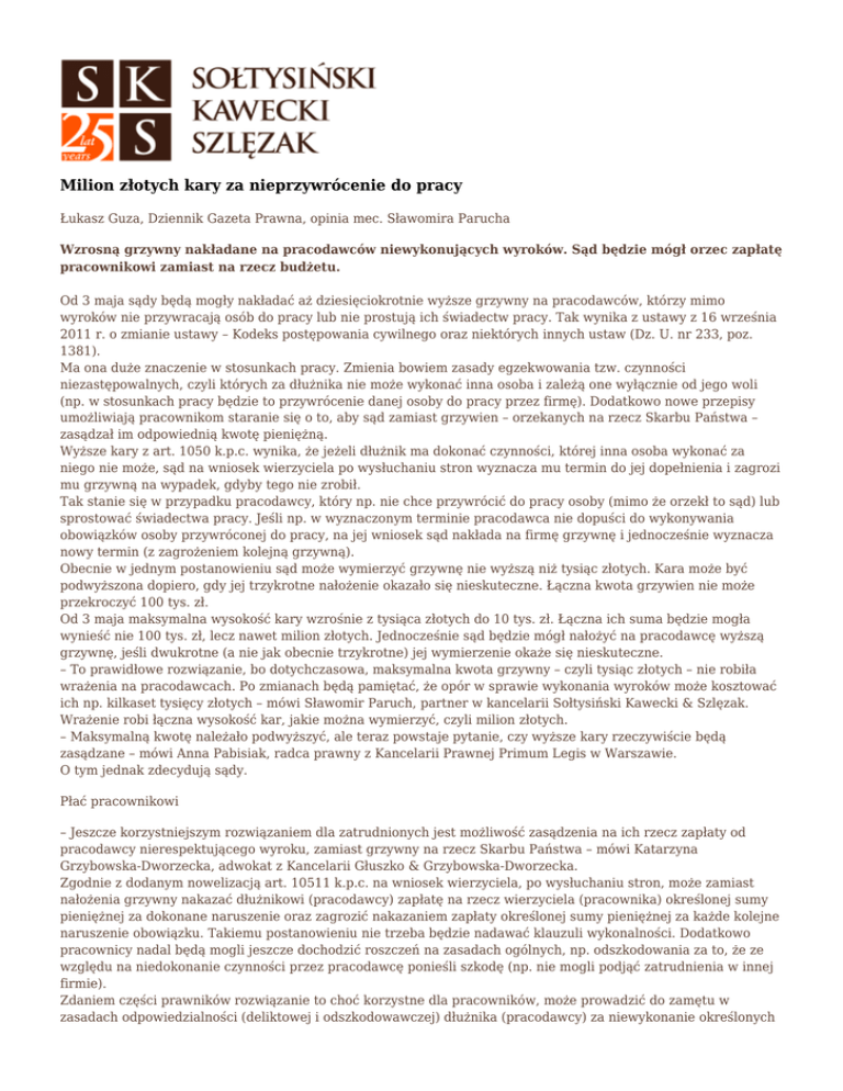 Milion złotych kary za nieprzywrócenie do pracy Łukasz Guza, Dziennik Gazeta Prawna, opinia mec. Sławomira Parucha Wzrosną grzywny nakładane na pracodawców niewykonujących wyroków. Sąd będzie mógł orzec zapłatę pracownikowi zamiast na rzecz budżetu. Od 3 maja sądy będą mogły nakładać aż dziesięciokrotnie wyższe grzywny na pracodawców, którzy mimo wyroków nie przywracają osób do pracy lub nie prostują ich świadectw pracy. Tak wynika z ustawy z 16 września 2011 r. o zmianie ustawy – Kodeks postępowania cywilnego oraz niektórych innych ustaw (Dz. U. nr 233, poz. 1381). Ma ona duże znaczenie w stosunkach pracy. Zmienia bowiem zasady egzekwowania tzw. czynności niezastępowalnych, czyli których za dłużnika nie może wykonać inna osoba i zależą one wyłącznie od jego woli (np. w stosunkach pracy będzie to przywrócenie danej osoby do pracy przez firmę). Dodatkowo nowe przepisy umożliwiają pracownikom staranie się o to, aby sąd zamiast grzywien – orzekanych na rzecz Skarbu Państwa – zasądzał im odpowiednią kwotę pieniężną. Wyższe kary z art. 1050 k.p.c. wynika, że jeżeli dłużnik ma dokonać czynności, której inna osoba wykonać za niego nie może, sąd na wniosek wierzyciela po wysłuchaniu stron wyznacza mu termin do jej dopełnienia i zagrozi mu grzywną na wypadek, gdyby tego nie zrobił. Tak stanie się w przypadku pracodawcy, który np. nie chce przywrócić do pracy osoby (mimo że orzekł to sąd) lub sprostować świadectwa pracy. Jeśli np. w wyznaczonym terminie pracodawca nie dopuści do wykonywania obowiązków osoby przywróconej do pracy, na jej wniosek sąd nakłada na firmę grzywnę i jednocześnie wyznacza nowy termin (z zagrożeniem kolejną grzywną). Obecnie w jednym postanowieniu sąd może wymierzyć grzywnę nie wyższą niż tysiąc złotych. Kara może być podwyższona dopiero, gdy jej trzykrotne nałożenie okazało się nieskuteczne. Łączna kwota grzywien nie może przekroczyć 100 tys. zł. Od 3 maja maksymalna wysokość kary wzrośnie z tysiąca złotych do 10 tys. zł. Łączna ich suma będzie mogła wynieść nie 100 tys. zł, lecz nawet milion złotych. Jednocześnie sąd będzie mógł nałożyć na pracodawcę wyższą grzywnę, jeśli dwukrotne (a nie jak obecnie trzykrotne) jej wymierzenie okaże się nieskuteczne. – To prawidłowe rozwiązanie, bo dotychczasowa, maksymalna kwota grzywny – czyli tysiąc złotych – nie robiła wrażenia na pracodawcach. Po zmianach będą pamiętać, że opór w sprawie wykonania wyroków może kosztować ich np. kilkaset tysięcy złotych – mówi Sławomir Paruch, partner w kancelarii Sołtysiński Kawecki & Szlęzak. Wrażenie robi łączna wysokość kar, jakie można wymierzyć, czyli milion złotych. – Maksymalną kwotę należało podwyższyć, ale teraz powstaje pytanie, czy wyższe kary rzeczywiście będą zasądzane – mówi Anna Pabisiak, radca prawny z Kancelarii Prawnej Primum Legis w Warszawie. O tym jednak zdecydują sądy. Płać pracownikowi – Jeszcze korzystniejszym rozwiązaniem dla zatrudnionych jest możliwość zasądzenia na ich rzecz zapłaty od pracodawcy nierespektującego wyroku, zamiast grzywny na rzecz Skarbu Państwa – mówi Katarzyna Grzybowska-Dworzecka, adwokat z Kancelarii Głuszko & Grzybowska-Dworzecka. Zgodnie z dodanym nowelizacją art. 10511 k.p.c. na wniosek wierzyciela, po wysłuchaniu stron, może zamiast nałożenia grzywny nakazać dłużnikowi (pracodawcy) zapłatę na rzecz wierzyciela (pracownika) określonej sumy pieniężnej za dokonane naruszenie oraz zagrozić nakazaniem zapłaty określonej sumy pieniężnej za każde kolejne naruszenie obowiązku. Takiemu postanowieniu nie trzeba będzie nadawać klauzuli wykonalności. Dodatkowo pracownicy nadal będą mogli jeszcze dochodzić roszczeń na zasadach ogólnych, np. odszkodowania za to, że ze względu na niedokonanie czynności przez pracodawcę ponieśli szkodę (np. nie mogli podjąć zatrudnienia w innej firmie). Zdaniem części prawników rozwiązanie to choć korzystne dla pracowników, może prowadzić do zamętu w zasadach odpowiedzialności (deliktowej i odszkodowawczej) dłużnika (pracodawcy) za niewykonanie określonych czynności. – Dobrze, że ustawodawca ustalił chociaż, że na wniosek wierzyciela sąd może podwyższyć wysokość należnej mu od dłużnika sumy pieniężnej – mówi Sławomir Paruch. Inni podkreślają jednak, że pracownik jest słabszą stroną stosunku pracy, więc gdy silniejszy pracodawca uchyla się od wykonania danej czynności (mimo że nie jest to wątpliwa kwestia, bo orzekł o tym sąd), zatrudniony powinien móc korzystać z rozwiązań, które ułatwią egzekwowanie takiego obowiązku. O tym jednak, czy w danej sprawie pracodawca zapłaci grzywnę, czy kwotę na rzecz pracownika zdecyduje sąd (wniosek pracownika nie będzie go wiązał). – Przy podejmowaniu takiej decyzji sędziowie będą mogli brać pod uwagę okoliczności konkretnej sprawy, np. to, czy pracodawca złośliwie nie wykonuje danego obowiązku, czy też istnieją obiektywne okoliczności, które mu to utrudniają – mówi Anna Pabisiak. Trudniejszy dowód. Nie wszystkie zmiany w k.p.c są jednak korzystne dla pracowników. Zgodnie ze zmienionym art. 207 k.p.c. sąd pominie spóźnione twierdzenia i dowody, chyba że strona uprawdopodobni, że nie zgłosiła ich w pozwie, odpowiedzi na pozew lub dalszym piśmie przygotowawczym bez swojej winy lub że uwzględnienie spóźnionych twierdzeń i dowodów nie spowoduje zwłoki w rozpoznaniu sprawy albo że występują inne wyjątkowe okoliczności. – Twierdzenia i dowody trzeba będzie więc zgłosić w pozwie. Dotychczasowa praktyka była taka, że pracownik, który np. odwoływał się od wypowiedzenia, luźno informował jedynie w pozwie, że nie zgadza się z decyzją pracodawcy, a dopiero w trakcie postępowania przedstawiano twierdzenia czy dowody – mówi Anna 