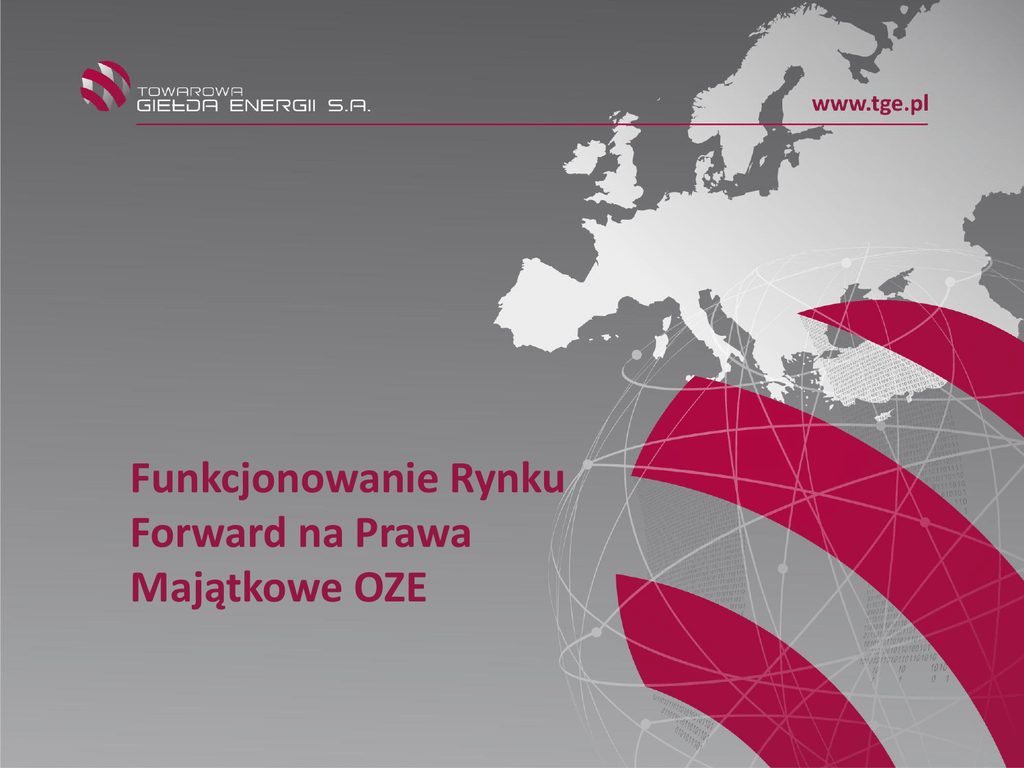 www.tge.pl Funkcjonowanie Rynku Forward na Prawa Majątkowe OZE www.tge.pl Rynek forward na prawa majątkowe OZE 1. Przedmiot obrotu: kontrakty terminowe typu forward na prawa majątkowe z OZE (PMOZE_A) 2. Nominał kontraktu: 1 kontrakt odpowiada dostawie 10 000 praw majątkowych (10 MWh wyprodukowanej energii) 3. Instrument bazowy: prawo majątkowe wynikające ze świadectwa pochodzenia dla energii elektrycznej wyprodukowanej w odnawialnych źródłach energii, której okres produkcji rozpoczął się od dnia 1 marca 2009 r., którego kurs jest określony na Rynku Praw Majątkowych (w ramach transakcji sesyjnych), wyrażony jako PLN/MWh z dokładnością do 1 grosza. 2 www.tge.pl Rynek forward na prawa majątkowe OZE Instrumenty: 1. PMOZE_A_Y (instrument roczny - 3 serie w notowaniu) 2. PMOZE_A_Q (instrument kwartalny – 4 serie w notowaniu) Sposób rozliczenia kontraktu terminowego - zmiana stanu posiadania praw majątkowych na koncie ewidencyjnym w Rejestrze w dniu rozliczenia kontraktu, rozliczenie finansowe przez Izbę Rozliczeniową (po zakończeniu notowania instrumentu) 3 www.tge.pl Rynek forward na prawa majątkowe OZE Zakończenie notowania instrumentu (propozycja 1): 1. dla instrumentu kwartalnego: ostatni dzień roboczy q 2. dla instrumentu rocznego: 2-gi piątek lutego yy+1, gdzie : – „yy” oznacza dwie ostatnie cyfry roku, w którym wypada termin wykonania kontraktu terminowego, – „q” oznacza numer kwartału roku, w którym wypada termin wykonania kontraktu. np.: kontrakt PMOZE_A-Y15 okres notowania: 15 luty 2013- 12 luty 2016 4 www.tge.pl Liczba serii instrumentów (propozycja 1) Y_13 Y_14 Y_15 Y_16 Q4_13 Q1_13 Q2_13 Q3_13 Q4_14 Q1_14 Grudzień Styczeń Luty Marzec 5 www.tge.pl Rynek forward na prawa majątkowe OZE Rozliczenie kontraktów (propozycja 1): – dla instrumentu kwartalnego: ostatni dzień roboczy q+1 – dla instrumentu rocznego: rozliczenie podzielone na cztery rozliczenia częściowe. Rozliczenie częściowe obejmuje ¼ kontaktu I rozliczenie częściowe - drugi poniedziałek kwietnia YY+1 II rozliczenie częściowe - drugi poniedziałek lipca YY+1 III rozliczenie częściowe- drugi poniedziałek października YY+1 IV rozliczenie częściowe- drugi poniedziałek lutego YY+2 6 www.tge.pl Rynek forward na prawa majątkowe OZE Zakończenie notowania instrumentu (propozycja 2): 1. dla instrumentu kwartalnego: ostatni dzień roboczy q 2. dla instrumentu rocznego: ostatni dzień roboczy YY, gdzie: – „yy” oznacza dwie ostatnie cyfry roku, w którym wypada termin wykonania kontraktu terminowego, – „q” oznacza numer kwartału roku, w którym wypada termin wykonania kontraktu. np.: kontrakt PMOZE_A-Y15 okres notowania: 1 styczeń 2013- 31 grudzień 2015 7 www.tge.pl Liczba serii instrumentów (propozycja 2) Y_13 Y_14 Y_15 Y_16 Q4_13 Q1_14 Q2_14 Q3_14 Q4_14 Q1_15 Listopad Grudzień Styczeń Luty Marzec 8 www.tge.pl Rynek forward na prawa majątkowe OZE Rozliczenie kontraktów (propozycja 2): – dla instrumentu kwartalnego: ostatni dzień roboczy q+1 – dla instrumentu rocznego: rozliczenie podzielone na cztery rozliczenia częściowe. Rozliczenie częściowe obejmuje ¼ kontaktu I rozliczenie częściowe – ostatni dzień roboczy marca YY+1 II rozliczenie częściowe - ostatni dzień roboczy czerwca YY+1 III rozliczenie częściowe- ostatni dzień roboczy września YY+1 IV rozliczenie częściowe- ostatni dzień roboczy grudnia YY+1 9 www.tge.pl Zmiana Harmonogramu W celu zapewnienia ciągłości ustalania kursu na instrumencie bazowym należy dostosować godziny notowań na rynku spot. Następny slajd przedstawia propozycję zmiany harmonogramu na Rynku Praw Majątkowych (rynek spot). 10 www.tge.pl Propozycja harmonogramu Sesja giełdowa – 5 dni w tygodniu (dni robocze) Rynek spot Rynek termin owy Składanie zleceń na Fixing 8:00 Transakcje pozasesyjne – 2 dni w tygodniu (poniedziałek i środa) Transakcje pozasesyjne Notowania ciągłe 9:00 10:00 11:30 13:15 14:00 Notowania ciągłe Notowania 5 dni w tygodniu (dni robocze) 11 www.tge.pl Zabezpieczenie Rynku Terminowego Praw Majątkowych (IRGIT) 12 czerwca 2013 Warszawa www.tge.pl Rekomendacje IRGIT (1) Cel: uruchomienie obrotu i rozliczeń rocznymi i kwartalnymi kontraktami forward na prawach majątkowych PMOZE_A przy zapewnieniu maksymalnej gwarancji rozliczeń. Izba rekomenduje: 1. Obrót na Rynku Terminowym Praw Majątkowych (RTPM) rocznymi i kwartalnymi kontraktami forward na prawa majątkowe PMOZE_A z fizyczną dostawą realizowaną w czterech równych partiach (jednorazowo) np. w okresach kwartalnych (okresach trzymiesięcznych). 2. Notowanie na RTPM kontraktów forward na prawa majątkowe PMOZE_A na sesjach w systemie notowań ciągłych (analogicznie do obecnie funkcjonujących rynków RTT, energii elektrycznej i gazu) jak również - w systemie aukcji. 13 www.tge.pl Rekomendacje IRGIT (2) 3. dopuszczenie do działania na RTPM podmiotów, które: - posiadają na koncie ewidencyjnym w Rejestrze Świadectw Pochodzenia (RŚP) prawa majątkowe PMOZE_A, - są uprawnione do otrzymania od URE stosownych potwierdzeń wyprodukowania energii elektrycznej z odnawialnych źródeł, - potrzebują praw majątkowych PMOZE_A do umorzenia, w celu realizowania obowiązku ustawowego. 4. monitorowanie w okresie notowania kontraktu analizy obrotu (otwieranych pozycji) na RTPM względem maksymalnej liczby potwierdzeń (praw majątkowych z OZE) wystawianych przez URE dla danego okresu dostawy oraz potencjalnej ilości praw majątkowych jakie mogą zostać w danym okresie rozliczeniowym wystawione. Możliwe rozszerzenie kręgu Członków RTPM w przypadku możliwości wykorzystania przez Izbę opłaty zastępczej jako formy rozrachunku dostawy. 14 www.tge.pl System Gwarantowania Rozliczeń IRGIT Depozyty Zabezpieczające Fundusz gwarancyjny zabezpieczenia dla RTPM 15 www.tge.pl Zabezpieczenie RTPM (IRGIT) Sposoby zabezpieczenia RTPM: 1. System Gwarantowania Rozliczeń: - Depozyt Zabezpieczający - Fund