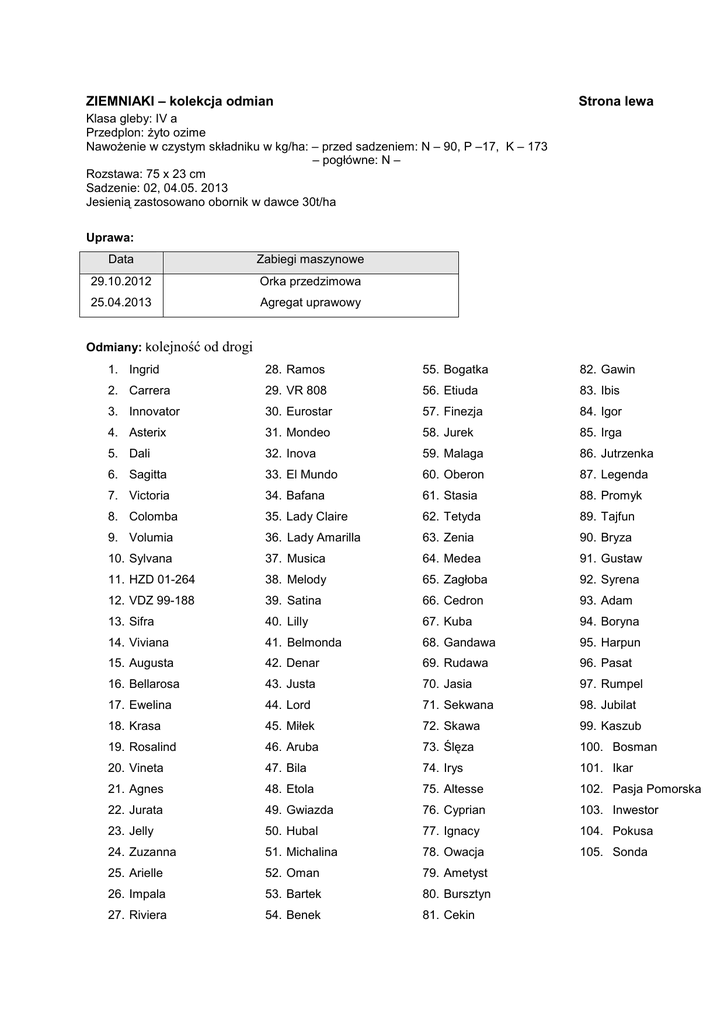 ZIEMNIAKI – kolekcja odmian Strona lewa Klasa gleby: IV a Przedplon: żyto ozime Nawożenie w czystym składniku w kg/ha: – przed sadzeniem: N – 90, P –17, K – 173 – pogłówne: N – Rozstawa: 75 x 23 cm Sadzenie: 02, 04.05. 2013 Jesienią zastosowano obornik w dawce 30t/ha Uprawa: Data Zabiegi maszynowe 29.10.2012 Orka przedzimowa 25.04.2013 Agregat uprawowy Odmiany: kolejność od drogi 1. Ingrid 28. Ramos 55. Bogatka 82. Gawin 2. Carrera 29. VR 808 56. Etiuda 83. Ibis 3. Innovator 30. Eurostar 57. Finezja 84. Igor 4. Asterix 31. Mondeo 58. Jurek 85. Irga 5. Dali 32. Inova 59. Malaga 86. Jutrzenka 6. Sagitta 33. El Mundo 60. Oberon 87. Legenda 7. Victoria 34. Bafana 61. Stasia 88. Promyk 8. Colomba 35. Lady Claire 62. Tetyda 89. Tajfun 9. Volumia 36. Lady Amarilla 63. Zenia 90. Bryza 10. Sylvana 37. Musica 64. Medea 91. Gustaw 11. HZD 01-264 38. Melody 65. Zagłoba 92. Syrena 12. VDZ 99-188 39. Satina 66. Cedron 93. Adam 13. Sifra 40. Lilly 67. Kuba 94. Boryna 14. Viviana 41. Belmonda 68. Gandawa 95. Harpun 15. Augusta 42. Denar 69. Rudawa 96. Pasat 16. Bellarosa 43. Justa 70. Jasia 97. Rumpel 17. Ewelina 44. Lord 71. Sekwana 98. Jubilat 18. Krasa 45. Miłek 72. Skawa 99. Kaszub 19. Rosalind 46. Aruba 73. Ślęza 100. Bosman 20. Vineta 47. Bila 74. Irys 101. Ikar 21. Agnes 48. Etola 75. Altesse 102. Pasja Pomorska 22. Jurata 49. Gwiazda 76. Cyprian 103. Inwestor 23. Jelly 50. Hubal 77. Ignacy 104. Pokusa 24. Zuzanna 51. Michalina 78. Owacja 105. Sonda 25. Arielle 52. Oman 79. Ametyst 26. Impala 53. Bartek 80. Bursztyn 27. Riviera 54. Benek 81. Cekin Zabiegi pielęgnacyjne: Data 24.10.2012 25.04.2013 14.05.2013 Nawożenie w kg/ha 17– (P) fosforan amonu 173 – (K) sól potasowa 45 – (N) mocznik 45 – (N) salmag Zwalczanie chwastów Sencor Liquid 600 SC – 0,5 l/ha Zwalczanie chorób Zwalczanie szkodników