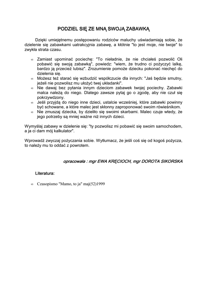 PODZIEL SIĘ ZE MNĄ SWOJĄ ZABAWKĄ Dzięki umiejętnemu postępowaniu rodziców maluchy uświadamiają sobie, że dzielenie się zabawkami uatrakcyjnia zabawę, a kłótnie "to jest moje, nie twoje" to zwykła strata czasu. • • • • • Zamiast upominać pociechę: "To nieładnie, że nie chciałeś pozwolić Oli pobawić się swoją zabawką", powiedz: "wiem, że trudno ci pożyczyć lalkę, bardzo ją przecież lubisz". Zrozumienie pomoże dziecku pokonać niechęć do dzielenia się. Możesz też starać się wzbudzić współczucie dla innych: "Jaś będzie smutny, jeżeli nie pozwolisz mu ułożyć twej układanki". Nie dawaj bez pytania innym dzieciom zabawek twojej pociechy. Zabawki malca należą do niego. Dlatego zawsze pytaj go o zgodę, aby nie czuł się pokrzywdzony. Jeśli przyjdą do niego inne dzieci, ustalcie wcześniej, które zabawki powinny być schowane, a które malec jest skłonny zaproponować swoim rówieśnikom. Nie zmuszaj dziecka, by dzieliło się swoimi skarbami. Malec czuje wtedy, że jego potrzeby są mniej ważne niż innych dzieci. Wymyślaj zabawy w dzielenie się: "ty pozwolisz mi pobawić się swoim samochodem, a ja ci dam mój kalkulator". Wprowadź zwyczaj pożyczania sobie. Wytłumacz, że jeśli coś się od kogoś pożycza, to należy mu to oddać z powrotem. opracowała : mgr EWA KRĘCIOCH, mgr DOROTA SIKORSKA Literatura: • Czasopismo "Mamo, to ja" maj(52)1999