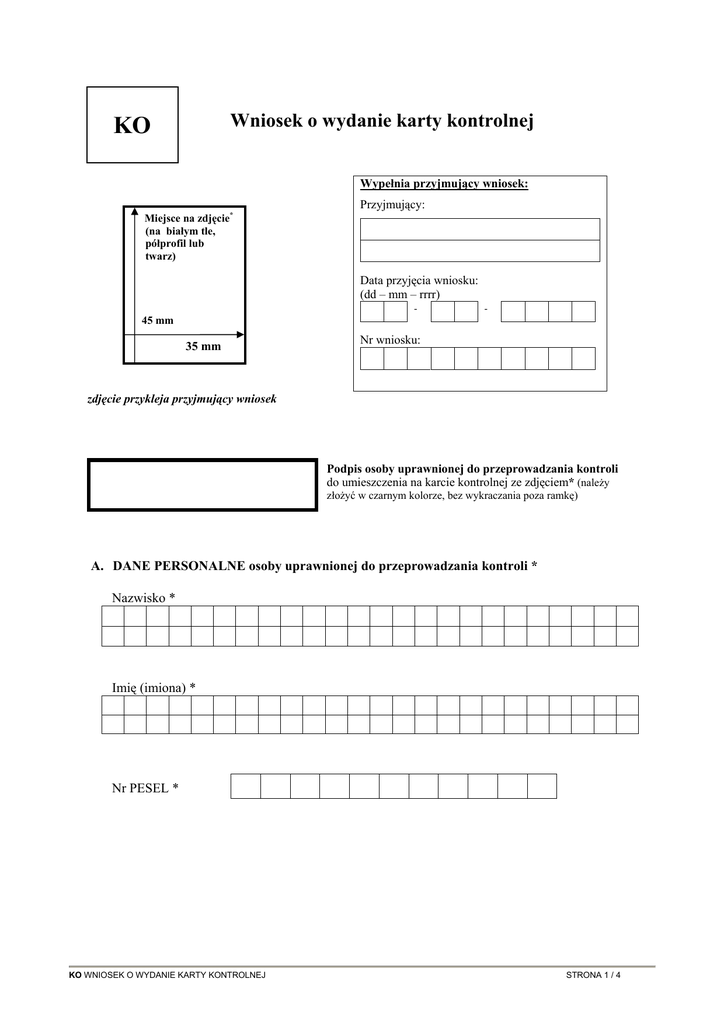 Wniosek o wydanie karty kontrolnej KO Wypełnia przyjmujący wniosek: Miejsce na zdjęcie* (na białym tle, półprofil lub twarz) Przyjmujący: Data przyjęcia wniosku: (dd – mm – rrrr) - - 45 mm 35 mm Nr wniosku: zdjęcie przykleja przyjmujący wniosek Podpis osoby uprawnionej do przeprowadzania kontroli do umieszczenia na karcie kontrolnej ze zdjęciem* (należy złożyć w czarnym kolorze, bez wykraczania poza ramkę) A. DANE PERSONALNE osoby uprawnionej do przeprowadzania kontroli * Nazwisko * Imię (imiona) * Nr PESEL * KO WNIOSEK O WYDANIE KARTY KONTROLNEJ STRONA 1 / 4 B. JEDNOSTKA cyfrowych ORGANIZACYJNA organu upoważnionego do kontroli tachografów Nazwa Numer NIP Adres siedziby i dla przesłania karty oraz korespondencji Miejscowość Ulica Nr budynku Nr lokalu Kod pocztowy Poczta Kraj Nr telefonu Nr faksu Adres e-mail KO WNIOSEK O WYDANIE KARTY KONTROLNEJ STRONA 2 / 4 C. NAZWA organu upoważnionego do kontroli - do umieszczenia na karcie (maksymalnie 35 znaków łącznie ze spacjami) D. Dane kierownika lub dowódcy jednostki organizacyjnej organu upoważnionego do kontroli tachografów cyfrowych – jako Wnioskodawcy Nazwisko Imię (imiona) E. WNOSZĘ O: ** 1. pierwsze wydanie karty na maksymalny okres 5 lat na okres wskazany datą ważności (dd-mm-rrrr) 2. - - wznowienie karty (nr posiadanej karty ……………………………..………………… ) na maksymalny okres 5 lat na okres wskazany datą ważności (dd-mm-rrrr) - - z powodu: zbliżającego się terminu upływu ważności zmiany danych osobowych lub administracyjnych 3. wymianę karty (nr posiadanej karty ………………………………..….…………… ) z powodu: utraty karty kradzieży karty uszkodzenia lub wadliwego działania karty KO WNIOSEK O WYDANIE KARTY KONTROLNEJ STRONA 3 / 4 4. w razie zwrotu opłaty za wydanie karty - o jej przekazanie do: nr rachunku bankowego W przypadku braku zaznaczenia dyspozycji i niepodania nr rachunku bankowego opłata zostanie zwrócona pod adresem siedziby Wnioskodawcy. .................................................................... Data ............................................................................................ Podpis Wnioskodawcy Wypełnić formularz drukowanymi literami. * Zdjęcie, podpis oraz dane personalne osoby uprawnionej do przeprowadzania kontroli - TYLKO w przypadku karty kontrolnej ze zdjęciem. ** Właściwe zakreślić znakiem „X”. KO WNIOSEK O WYDANIE KARTY KONTROLNEJ STRONA 4 / 4