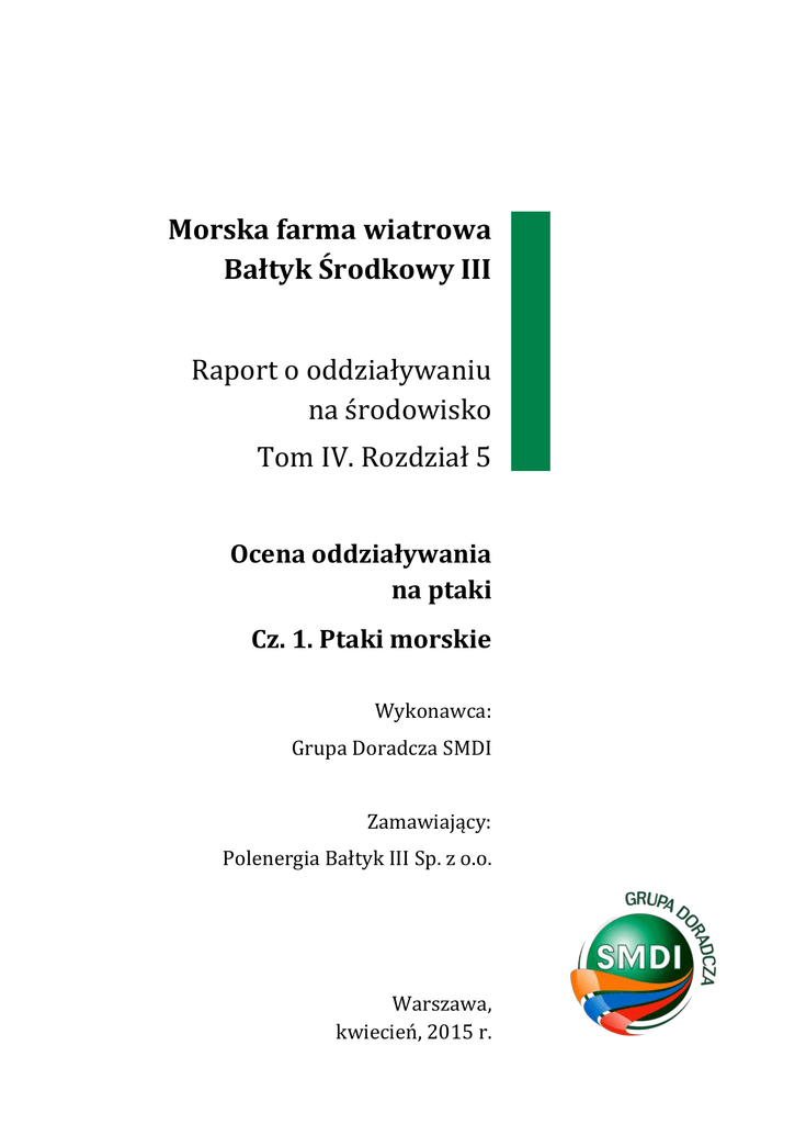 Morska farma wiatrowa Bałtyk Środkowy III Raport o oddziaływaniu na środowisko Tom IV. Rozdział 5 Ocena oddziaływania na ptaki Cz. 1. Ptaki morskie Wykonawca: Grupa Doradcza SMDI Zamawiający: Polenergia Bałtyk III Sp. z o.o. Warszawa, kwiecień, 2015 r. Raport o oddziaływaniu na środowisko MFW Bałtyk Środkowy III Tom IV. Rozdział 5 Ocena oddziaływania na ptaki. Cz. 1. Ptaki morskie Informacje o dokumencie Morska farma wiatrowa Bałtyk Środkowy III Raport o oddziaływaniu na środowisko Dokument: Tom IV. Rozdział 5 Ocena oddziaływania na ptaki Cz. 1. Ptaki morskie Wersja: Ostateczna Autorzy: Zespół autorski został wskazany w oddzielnej części raportu (Tom I Rozdział 1) Sprawdził: Krzysztof Mielniczuk Zatwierdził: Maciej Stryjecki Zamawiający: Polenergia Bałtyk III Sp. z o.o. ul. Krucza 24/26 00-526 Warszawa Wykonawca: SMDI Doradztwo Inwestycyjne Sp. z o.o. Al. Wilanowska 208/4 02-765 Warszawa Data umowy: 20.01.2015 r. 2 Raport o oddziaływaniu na środowisko MFW Bałtyk Środkowy III Tom IV. Rozdział 5 Ocena oddziaływania na ptaki. Cz. 1. Ptaki morskie Spis treści Skróty i definicje .......................................................................................................................... 7 1. Streszczenie niespecjalistyczne .............................................................................................. 9 2. Wprowadzenie ................................................................................................................... 13 3. Opis planowanego przedsięwzięcia ..................................................................................... 14 4. 3.1. Podstawowe parametry przedsięwzięcia ............................................................................................. 14 3.2. Inne przedsięwzięcia w rejonie inwestycji ........................................................................................... 16 Istniejące presje antropogeniczne ....................................................................................... 23 4.1. Rybołówstwo ........................................................................................................................................ 24 4.2. Eutrofizacja........................................................................................................................................... 24 4.3. Zanieczyszczenia .................................................................................................................................. 25 4.4. Ruch statków ........................................................................................................................................ 25 5. Opis przewidywanych skutków dla środowiska w przypadku niepodejmowania przedsięwzięcia .......................................................................................................................... 27 6. Metodyka oceny oddziaływania na środowisko ................................................................... 28 6.1. Ramowa metodyka oceny oddziaływania ............................................................................................ 28 6.2. Modyfikacje lub uszczegółowienia ramowej metodyki oceny ............................................................. 29 6.2.1. Określenie wrażliwości ptaków morskich na oddziaływania MFW............................................. 29 6.2.2. Wypieranie ptaków morskich z akwenu inwestycji .................................................................... 30 6.2.3. Modelowanie rozmieszczenia ptaków morskich ........................................................................ 32 6.2.4. Ocena ryzyka kolizji ptaków morskich ........................................................................................ 36 6.2.4.1. 6.3. 7. 8. Dane i obliczenia kolizyjności ................................................................................................. 37 Najdalej idący scenariusz przedsięwzięcia ........................................................................................... 40 Potencjalne oddziaływania morskich farm wiatrowych ........................................................ 40 7.1. Etap budowy ........................................................................................................................................ 40 7.2. Etap eksploatacji .................................................................................................................................. 43 7.3. Etap likwidacji ...................................................................................................................................... 46 Gatunki będące przedmiotem oceny oddziaływania na środowisko ..................................... 47 8.1. Podstawowa charakterystyka ptaków morskich przebywających w rejonie projektowanej farmy.... 47 8.1.1. Gatunki brane pod uwagę przy ocenie oddziaływania na środowisko ....................................... 48 8.1.1.1. Lodówka (Clangula hyemalis) ................................................................................................. 49 8.1.1.2. Mewa srebrzysta (Larus argentatus) ...................................................................................... 50 3 Raport o oddziaływaniu na środowisko MFW Bałtyk Środkowy III Tom IV. Rozdział 5 Ocena oddziaływania na ptaki. Cz. 1. Ptaki morskie 8.1.1.3. Markaczka (Melanitta nigra) .................................................................................................. 51 8.1.1.4. Uhla (Melanitta fusca) ............................................................................................................ 52 8.1.1.5. Alka (Alca torda) i nurzyk (Uria aalge).................................................................................... 53 8.1.1.6. Nur czarnoszyi (Gavia arctica) i nur rdzawoszyi (Gavia stellata)............................................ 54 8.1.1.7. Mewa mała (Hydrocoloeu