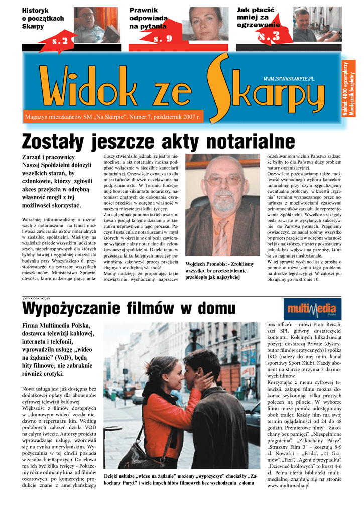 Historyk o początkach Skarpy s.2 Jak płacić mniej za ogrzewanie Prawnik odpowiada na pytania s.3 s. 9 Magazyn mieszkańców SM „Na Skarpie”. Numer 7, październik 2007 r. Zostały jeszcze akty notarialne Zarząd i pracownicy Naszej Spółdzielni dołożyli wszelkich starań, by członkowie, którzy zgłosili akces przejścia w odrębną własność mogli z tej możliwości skorzystać. Wcześniej informowaliśmy o rozmowach z notariuszami na temat możliwości zawierania aktów notarialnych w siedzibie spółdzielni. Mieliśmy na względzie przede wszystkim ludzi starszych, niepełnosprawnych dla których byłoby łatwiej i wygodniej dotrzeć do budynku przy Wyszyńskiego 6, przystosowanego na potrzeby wszystkich mieszkańców. Ministerstwo Sprawiedliwości, które nadzoruje pracę nota- riuszy stwierdziło jednak, że jest to niemożliwe, a akt notarialny można podpisać wyłącznie w siedzibie kancelarii notarialnej. Oczywiście oznacza to dla mieszkańców dłuższe oczekiwanie na podpisanie aktu. W Toruniu funkcjonuje bowiem kilkunastu notariuszy, natomiast chętnych do dokonania czynności przejścia w odrębną własność w naszym mieście jest kilka tysięcy. Zarząd jednak pomimo takich uwarunkowań podjął kolejne działania w kierunku usprawnienia tego procesu. Poczynił ustalenia z notariuszami w myśl których w określone dni będą zawierane wyłącznie akty notarialne dla członków naszej spółdzielni. Dzięki temu w przeciągu kilku kolejnych miesięcy powinniśmy zakończyć proces przejścia chętnych w odrębną własność. Mamy nadzieję, że proponując takie rozwiązanie wychodzimy naprzeciw Wojciech Pronobis: - Zrobiliśmy wszystko, by przekształcanie przebiegło jak najszybciej oczekiwaniom wielu z Państwa sądząc, że byłby to dla Państwa duży problem natury organizacyjnej. Oczywiście pozostawiamy także możliwość swobodnego wyboru kancelarii notarialnej przy czym sygnalizujemy ewentualne problemy w kwestii „zgrania” terminu wyznaczanego przez notariusza z możliwościami czasowymi pełnomocników zarządu do reprezentowania Spółdzielni. Wszelkie szczegóły będą zawarte w wysyłanych sukcesywnie do Państwa pismach. Pragniemy oświadczyć, że nadal robimy wszystko by proces przejścia w odrębną własność był jak najkrótszy, niestety pozostajemy jednak bez wpływu na przepisy, które są co najmniej niedoskonałe. W tej sprawie wysłano list z prośbą o pomoc w rozwiązaniu tego problemu na drodze legislacyjnej. W całości publikujemy go na stronie 10. promocja Wypożyczanie filmów w domu Firma Multimedia Polska, dostawca telewizji kablowej, internetu i telefonii, wprowadziła usługę „wideo na żądanie” (VoD), będą hity filmowe, nie zabraknie również erotyki. Nowa usługa jest już dostępna bez dodatkowej opłaty dla abonentów cyfrowej telewizji kablowej. Większość z filmów dostępnych w „domowym wideo” zeszła niedawno z repertuaru kin. Według podobnych założeń działa VOD na całym świecie. Autorzy projektu wprowadzając usługę, wzorowali się na rynku amerykańskim. Wypożyczalnia w tej chwili posiada w zasobach 600 pozycji. Docelowo ma ich być kilka tysięcy - Pokażemy różne odmiany kina, od filmów oscarowych, po komercyjne produkcje znane z amerykańskiego Dzięki usłudze „wideo na żądanie” możemy „wypożyczyć” chociażby „Zakochany Paryż” i wiele innych hitów filmowych bez wychodzenia z domu box office’u - mówi Piotr Reisch, szef SPI, główny dostarczyciel kontentu. Kolejnych kilkadziesiąt pozycji dostarczą Private (dystrybutor filmów erotycznych) i spółka IKO (należy do niej m.in. kanał sportowy Sport Klub). Każdy abonent na starcie otrzyma 7 darmowych filmów. Korzystając z menu cyfrowej telewizji, zakupu filmu można dokonać wykonując kilka prostych poleceń na pilocie. W wyborze filmu może pomóc udostępniony obok trailer. Każdy film ma swój termin oglądalności od 24 do 48 godzin. Premierowe filmy: „Zakochany bez pamięci”, „Niespełnione pragnienia”, „Zakochany Paryż”, „Straszny Film 3” - kosztują 8-9 zł. Nowości - „Frida”, „21 Gramów”, „Taxi”, „Agent z przypadku”, „Dziewięć królowych” to koszt 4-6 zł. Pełna oferta biblioteki multimedialnej znajduje się na stronie www.multimedia.pl