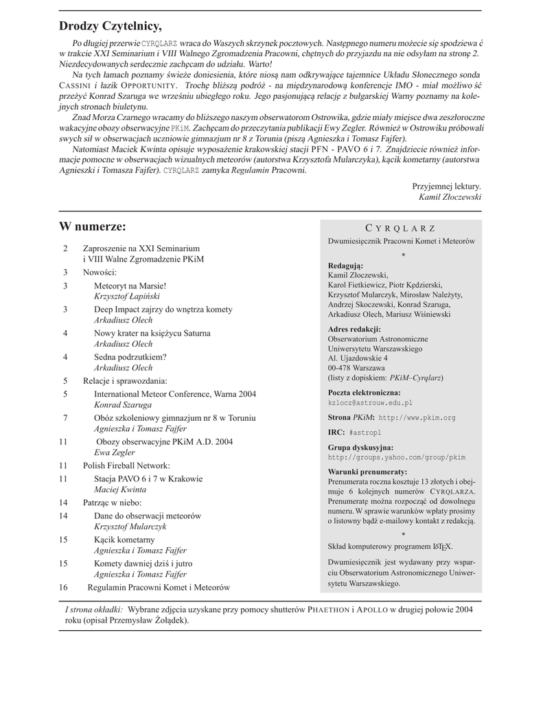 Drodzy Czytelnicy, Po długiej przerwie CYRQLARZ wraca do Waszych skrzynek pocztowych. Nast˛epnego numeru możecie si˛e spodziewa ć w trakcie XXI Seminarium i VIII Walnego Zgromadzenia Pracowni, ch˛etnych do przyjazdu na nie odsyłam na stron˛e 2. Niezdecydowanych serdecznie zach˛ecam do udziału. Warto! Na tych łamach poznamy świeże doniesienia, które niosa˛ nam odkrywajace ˛ tajemnice Układu Słonecznego sonda C ASSINI i łazik O PPORTUNITY. Troch˛e bliższa˛ podróż - na mi˛edzynarodowa˛ konferencje IMO - miał możliwo ść przeżyć Konrad Szaruga we wrześniu ubiegłego roku. Jego pasjonujac ˛ a˛ relacj˛e z bułgarskiej Warny poznamy na kolejnych stronach biuletynu. Znad Morza Czarnego wracamy do bliższego naszym obserwatorom Ostrowika, gdzie miały miejsce dwa zeszłoroczne wakacyjne obozy obserwacyjne PKiM. Zach˛ecam do przeczytania publikacji Ewy Zegler. Również w Ostrowiku próbowali swych sił w obserwacjach uczniowie gimnazjum nr 8 z Torunia (pisza˛ Agnieszka i Tomasz Fajfer). Natomiast Maciek Kwinta opisuje wyposażenie krakowskiej stacji PFN - PAVO 6 i 7. Znajdziecie również informacje pomocne w obserwacjach wizualnych meteorów (autorstwa Krzysztofa Mularczyka), kacik ˛ kometarny (autorstwa Agnieszki i Tomasza Fajfer). CYRQLARZ zamyka Regulamin Pracowni. Przyjemnej lektury. Kamil Złoczewski W numerze: C YRQLARZ Dwumiesi˛ecznik Pracowni Komet i Meteorów 2 3 3 3 4 4 5 5 7 11 11 11 14 14 15 15 16 Zaproszenie na XXI Seminarium i VIII Walne Zgromadzenie PKiM Nowości: Meteoryt na Marsie! Krzysztof Łapiński Deep Impact zajrzy do wn˛etrza komety Arkadiusz Olech Nowy krater na ksi˛eżycu Saturna Arkadiusz Olech Sedna podrzutkiem? Arkadiusz Olech Relacje i sprawozdania: International Meteor Conference, Warna 2004 Konrad Szaruga Obóz szkoleniowy gimnazjum nr 8 w Toruniu Agnieszka i Tomasz Fajfer Obozy obserwacyjne PKiM A.D. 2004 Ewa Zegler Polish Fireball Network: Stacja PAVO 6 i 7 w Krakowie Maciej Kwinta Patrzac ˛ w niebo: Dane do obserwacji meteorów Krzysztof Mularczyk Kacik ˛ kometarny Agnieszka i Tomasz Fajfer Komety dawniej dziś i jutro Agnieszka i Tomasz Fajfer Regulamin Pracowni Komet i Meteorów * Redaguja: ˛ Kamil Złoczewski, Karol Fietkiewicz, Piotr K˛edzierski, Krzysztof Mularczyk, Mirosław Należyty, Andrzej Skoczewski, Konrad Szaruga, Arkadiusz Olech, Mariusz Wiśniewski Adres redakcji: Obserwatorium Astronomiczne Uniwersytetu Warszawskiego Al. Ujazdowskie 4 00-478 Warszawa (listy z dopiskiem: PKiM–Cyrqlarz) Poczta elektroniczna: [email protected] Strona PKiM: http://www.pkim.org IRC: #astropl Grupa dyskusyjna: http://groups.yahoo.com/group/pkim Warunki prenumeraty: Prenumerata roczna kosztuje 13 złotych i obejmuje 6 kolejnych numerów C YRQLARZA. Prenumerat˛e można rozpoczać ˛ od dowolnegu numeru. W sprawie warunków wpłaty prosimy o listowny badź ˛ e-mailowy kontakt z redakcja.˛ * Skład komputerowy programem LATEX. Dwumiesi˛ecznik jest wydawany przy wsparciu Obserwatorium Astronomicznego Uniwersytetu Warszawskiego. I strona okładki: Wybrane zdj˛ecia uzyskane przy pomocy shutterów P HAETHON i A POLLO w drugiej połowie 2004 roku (opisał Przemysław Żoładek). ˛ ZAPROSZENIE Z APROSZENIE NA XXI S EMINARIUM I VIII WALNE Z GROMADZENIE PK I M Drodzy Obserwatorzy, W dniach 4 III – 7 III 2005 Pracownia Komet i Meteorów (PKiM) organizuje swoje kolejne Seminarium i Walne Zgromadzenie. W programie tego spotkania b˛eda˛ mi˛edzy innymi warsztaty astronomiczne, referaty zaproszonych gości, dyskusje panelowe oraz wybory nowych władz PKiM. Seminarium takie jest doskonała˛ okazja˛ do poznania wielu ciekawych ludzi zainteresowanych obserwacjami astronomicznymi, wymiany do świadczeń i wzbogacenia swojej astronomicznej wiedzy oraz umiej˛etno ści obserwacyjnych. Miejscem seminarium b˛edzie Centrum Astronomiczne PAN w Warszawie, które bezpłatnie udost˛epnia nam swoj hotel i sale wykładowe. Wyżywienie i dojazd uczestników we własnym zakresie. Nie planujemy zwrotów kosztów podróży. Uczniom wypisujemy zwolnienia z zaj˛e ć lekcyjnych w dniach 4 III (piatek) ˛ i 7 III (poniedziałek). Swoje zgłoszenia możecie przesyła ć na adres: Obserwatorium Astronomiczne Uniwersytetu Warszawskiego Al. Ujazdowskie 4 02-480 Warszawa z dopiskiem "PKiM" lub [email protected]. Ze wzgl˛edu na znaczne opoźnienia w terminie wydania CYRQLARZA przedłużamy termin zgłoszeń na Seminarium do dnia 13 lutego 2005 (pierwotnie termin zgłosze ń był do dnia 31 stycznia 2005). Serdecznie zapraszamy. Zarzad ˛ P OTWIERDZONE TEMATY REFERATÓW NA XXI S EMINARIUM PK I M W podzi˛ekowaniu za Wasz całoroczny wkład włożony w prace PKiM na każdym Seminarium zapraszamy Was na wykład o astronomii, nie tylko meteorowej! ¯ dr hab. Stanisaw Bajtlik: Kształt Wszechświata ¯ prof. Paweł Haensel: Supernowe i gwiazdy neutronowe ¯ dr hab. Paweł Moskalik: Teleskop globalny ¯ Krzysztof Mularczyk: Lirydy 2004 ¯ dr Arkadiusz Olech i mgr Mariusz Wiśniewski: Obecny stan Polish Fireball Network (PFN) ¯ mgr Grzegorz Stachowski: Obrazowanie nieba kamera̧ CCD ¯ Przemysław Żoładek: ˛ Perseidy 2004 w danych fotograficznych PFN Wszystkich zainteresowanych wygłoszniem referatu na Seminarium prosimy o jak najszybsze zgłaszanie si˛e pod adres [email protected]. NOWO ŚCI METEORYT NA MARSIE! Krzysztof Łapiński /20.01, Los Angeles (PAP/Reuters)/ Marsja ński łazik O PPORTUNITY, już prawie rok w˛edrujacy ˛ po bezdrożach Czerwonej Planety, natrafił na zbudowany z metalu meteoryt. Jest to pierwszy meteoryt odkryty na obcej planecie. Meteoryt wielkości piłki do koszykówki zbudowany jest z żelaza i niklu. Znajduje si˛e na równinie Meridiani Planum w pobliżu miejsca, gdzie prawie rok temu wyladował ˛ ameryka ński łazik. Metalowa˛ brył˛e zauważono już przed tygodniem. Dopiero jednak teraz, kiedy pojazd podjechał do niej na odległo ść metra, zeskrobał nieco opiłków i zbadał spektroskopem, potwierdzono, że jes