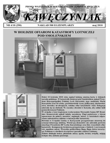 PISMO WSZYSTKICH MIESZKAŃCÓW GMINY KAWĘCZYN KAWĘCZYNIAK NR 4/10 (290) NAKŁAD 500 EGZEMPLARZY maj 2010 W HOŁDZIE OFIAROM KATASTROFY LOTNICZEJ POD SMOLEŃSKIEM Dzień 10 kwietnia 2010 roku zapisał kolejną smutną kartę w dziejach narodu polskiego. W katastrofie lotniczej pod Smoleńskiem zginął Prezydent Rzeczypospolitej Polskiej Lech Kaczyński, jego małŜonka Maria Kaczyńska oraz 94 osoby, przedstawiciele sceny politycznej, duchowieństwa, dowódcy sił zbrojnych, rodziny ofiar katyńskich i inni. Delegacja udawała się na obchody 70. rocznicy zbrodni w Katyniu, aby oddać hołd pomordowanym Polakom. W związku z tym tragicznym wydarzeniem Marszałek Sejmu RP Bronisław Komorowski ogłosił Ŝałobę narodową. Flagi państwowe z kirem opuszczono do połowy masztów, zapłonęły znicze, w kościołach odprawiano naboŜeństwa Ŝałobne w intencji ofiar katastrofy. RównieŜ w Urzędzie Gminy w Kawęczynie przygotowano stosowną do sytuacji dekorację Ŝałobną. Wśród jej elementów nie zabrakło portretu zmarłego Prezydenta RP Lecha Kaczyńskiego oraz listy wszystkich ofiar katastrofy. Kompozycję kwiatową przygotowano z białych i czerwonych róŜ, zapalono znicze. Wszystko podkreślono flagą, flagą, która towarzyszy Polakom w chwilach zwycięstwa i poraŜki, radości i zadumy. śałoba dobiegła końca, płomienie zniczy zgasły, kwiaty zwiędły, mijają kolejne dni, zaduma pozostaje. XL Sesja Rady Gminy odbyła się w śdŜarach KAWĘCZYNIAK Na zaproszenie sołectwa śdŜary, tegorocznym budŜecie szeregu o Anglię. Kierownik Posterunku Poczterdziesta w tej kadencji sesja Ra- zmian. Związane to było między licji w Kawęczynie z siedzibą w Kody Gminy Kawęczyn, odbyła się w innymi z podziałem ubiegłorocznej walach Pańskich, przedstawił analiśdŜarach. Oprócz radnych i sołty- nadwyŜki budŜetowej. Zdecydowa- zę bezpieczeństwa w gminie w oparsów do tamtejszej remizy OSP przy- no między innymi o przekazaniu ciu o ubiegłoroczne dane. Jednobyli takŜe dyrektorzy placówek pięciu tysięcy złotych na wymianę znacznie wynikało z niej, Ŝe gmina, oświatowych, prezes organizacji drzwi wejściowych w Zespole Szkół staje się jeszcze bezpieczniejsza. kombatanckiej, kierownik posterun- w Kowalach Pańskich, taką samą Kierownik Majcherek apelował, aby ku policji, prezes klubu sportowe- kwotę otrzymają parafie w Kowa- osoby, które są świadkami wandaligo ,,Orzeł ‘’ Kawęczyn oraz przed- lach Pańskich i Tokarach na ochronę zmu i przestępstw zgłaszały to pod stawiciele Urzędu Gminy z wójtem i zabytków. Kwotą dziesięciu tysięcy bezpłatny numerem 112. Zapewniał jego zastępcą na czele. Sesja rozpo- złotych dofinansowany zostanie za- o pełnej anonimowości. Stanisław częła się chwilą ciszy, dla uczczenia kup samochodu dla Ochotniczej Urbaniak – Komendant Gminny OSP mówił o stanie bezofiar katastrofy pod Smopieczeństwa poŜarowego. leńskiem. Sprawozdanie z wykonania budŜetu na Na terenie gminy jest dwa2009 rok przedstawił Ranaście samochodów gaśnifał Woźniak – Skarbnik czych i 225 ratowników. W Gminy Kawęczyn. Wójt ubiegłym roku ugasili oni Jan Nowak podpierając się 54 poŜary i uczestniczyli w prezentacją multimedialną, 34 miejscowych zagroŜeopowiedział o gminie i najniach. Były to głównie wywiększych dokonaniach padki drogowe oraz likwisamorządu w ubiegłym rodacje gniazd os i szerszeni. ku. Tadeusz Krupiński – Komendant poinformował, Ŝe po zmianie przepisów, Wiceprzewodniczący Rady Gminy poinformował o straŜacy likwidowali będą pozytywnej opinii komisji Po udzieleniu absolutorium wójta nagrodzono brawami gniazda owadów tylko w budŜetowej o wykonaniu i bukietem kwiatów obiektach uŜyteczności budŜetu za ubiegły rok. Popublicznych. Osoby pryzytywną opinię na ten temat, prze- StraŜy PoŜarnej w Kawęczynie. Na watne będą musiały za to płacić. słaną przez Regionalną Izbę Obra- wniosek Rady Pedagogicznej, Rady Wiceprzewodniczący Tadeusz Kruchunkową odczytał Grzegorz Dzi- Rodziców, Samorządu Uczniow- piński, odczytał pismo radnego kowski – Wiceprzewodniczący Ra- skiego i dyrekcji Szkoły Podstawo- Krzysztofa Deszcza, wzywające do dy Gminy. W imieniu Komisji Re- wej w SkarŜynie, nadała tej szkole usunięcia naruszenia prawa, a tym wizyjnej, Edmund Jacek – jej Prze- imię Stanisława Jakuba SkarŜyń- samym uchylenia uchwał w sprawie wodniczący, wnioskował o udziele- skiego, potomka rodziny będącej nadania Prezydentowi Lechowi Wanie Wójtowi absolutorium. Radni załoŜycielami tej wsi, znakomitego łęsie honorowego obywatelstwa przychylili się do tego jednogłośnie. pilota, światowego rekordzisty w gminy i nazwania jego imieniem Na wniosek Skarbnika, dokonano w długości przelotów, bohatera Bitwy ronda w Kowalach Pańskich. Wiceprzewodniczący Grzegorz DzikowMiesięcznik ,,Kawęczyniak’’ ski odczytał stanowisko Rady w tej Wydawca: Urząd Gminy Kawęczyn sprawie. Nie dopatrzyła się ona Ŝad62-704 Kawęczyn nych uchybień prawnych podczas tel. (063)2885910, fax (063)2885940 podejmowania tych uchwał. Rye-mail: [email protected] szard Jaśkiewicz – sołtys i radny, bezpłatny miesięcznik ,,Kawęczyniak’’ dostępny jest w placów- zaprezentował swoje sołectwo śdŜakach handlowych na terenie Gminy Kawęczyn oraz w Urzędzie ry. Jest ono jednym z czołowych Gminy i na stronie internetowej pod względem liczby ludności i obwww.kaweczyn.pl szaru w gminie Kawęczyn. (art.) 2 KAWĘCZYNIAK maj 2010 Oddział Gminny Związku Ochotniczych StraŜy PoŜarnych RP w Kawęcz ynie oraz Ochotnicza StraŜ PoŜarna w Kowalach Pańskich mają zaszczyt zaprosić wszystkich miłośników poŜarnictwa na uroczystości gminne Dnia StraŜaka '2010 połączone z jubileuszem 90-lecia OSP w Kowalach Pańskich Uroczystości odbędą się w dniu 9 maja 2010 roku w OSP w Kowalach Pańskich PROGRAM UROCZYSTOŚCI Godz. 13.30 - Zbiórka pododdziałów i zaproszonyc