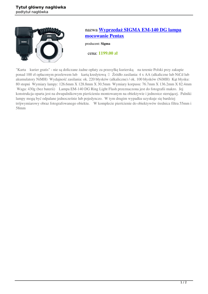 Tytuł główny nagłówka podtytuł nagłówka nazwa Wyprzedaż SIGMA EM-140 DG lampa mocowanie Pentax producent: Sigma cena: 1199.00 zł "Karta kurier gratis" - nie są doliczane żadne opłaty za przesyłkę kurierską na terenie Polski przy zakupie ponad 100 zł opłaconym przelewem lub kartą kredytową Źródło zasilania: 4 x AA (alkaliczne lub NiCd lub akumulatory NiMH) Wydajność zasilania: ok. 220 błysków (alkaliczne) / ok. 100 błysków (NiMH) Kąt błysku: 80 stopni Wymiary lampy: 126.6mm X 128.8mm X 30.5mm Wymiary korpusu: 76.7mm X 136.2mm X 82.4mm Waga: 430g (bez baterii) Lampa EM-140 DG Ring Light Flash przeznaczona jest do fotografii makro. Jej konstrukcja oparta jest na dwupalnikowym pierścieniu montowanym na obiektywie i jednostce sterującej. Palniki lampy mogą być odpalane jednocześnie lub pojedynczo. W tym drugim wypadku uzyskuje się bardziej trójwymiarowy obraz fotografowanego obiektu. W komplecie pierścienie do obiektywów średnica filtra 55mm i 58mm 1/2 Tytuł główny nagłówka podtytuł nagłówka EAN Kod producenta nazwa 0085126922627 F30926 wartość 2/2
