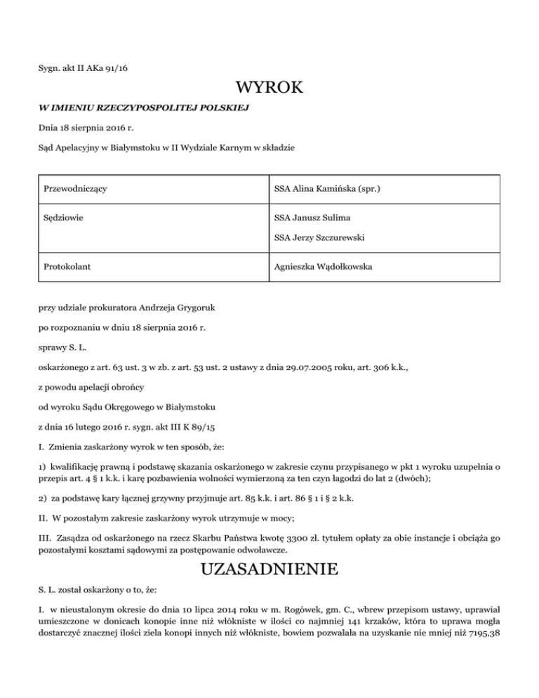Sygn. akt II AKa 91/16 WYROK W IMIENIU RZECZYPOSPOLITEJ POLSKIEJ Dnia 18 sierpnia 2016 r. Sąd Apelacyjny w Białymstoku w II Wydziale Karnym w składzie Przewodniczący SSA Alina Kamińska (spr.) Sędziowie SSA Janusz Sulima SSA Jerzy Szczurewski Protokolant Agnieszka Wądołkowska przy udziale prokuratora Andrzeja Grygoruk po rozpoznaniu w dniu 18 sierpnia 2016 r. sprawy S. L. oskarżonego z art. 63 ust. 3 w zb. z art. 53 ust. 2 ustawy z dnia 29.07.2005 roku, art. 306 k.k., z powodu apelacji obrońcy od wyroku Sądu Okręgowego w Białymstoku z dnia 16 lutego 2016 r. sygn. akt III K 89/15 I. Zmienia zaskarżony wyrok w ten sposób, że: 1) kwalifikację prawną i podstawę skazania oskarżonego w zakresie czynu przypisanego w pkt 1 wyroku uzupełnia o przepis art. 4 § 1 k.k. i karę pozbawienia wolności wymierzoną za ten czyn łagodzi do lat 2 (dwóch); 2) za podstawę kary łącznej grzywny przyjmuje art. 85 k.k. i art. 86 § 1 i § 2 k.k. II. W pozostałym zakresie zaskarżony wyrok utrzymuje w mocy; III. Zasądza od oskarżonego na rzecz Skarbu Państwa kwotę 3300 zł. tytułem opłaty za obie instancje i obciąża go pozostałymi kosztami sądowymi za postępowanie odwoławcze. UZASADNIENIE S. L. został oskarżony o to, że: I. w nieustalonym okresie do dnia 10 lipca 2014 roku w m. Rogówek, gm. C., wbrew przepisom ustawy, uprawiał umieszczone w donicach konopie inne niż włókniste w ilości co najmniej 141 krzaków, która to uprawa mogła dostarczyć znacznej ilości ziela konopi innych niż włókniste, bowiem pozwalała na uzyskanie nie mniej niż 7195,38 grama środka odurzającego a następnie z konopi tych wytwarzał środek odurzający w postaci marihuany podejmując czynności polegające na eliminacji i segregowaniu zbędnych fragmentów zebranych uprzednio roślin, suszeniu konopi i pochodzącego z nich ziela, to jest o czyn z art. 63 ust. 1, 2 i 3 w zb. z art. 53 ust. 2 Ustawy z dnia 29 lipca 2005 roku o przeciwdziałaniu narkomanii II. w nieustalonym okresie do dnia 10 lipca 2014 roku w nieustalonym miejscu usunął z pojazdu F. (...) o nr nadwozia (...) znak identyfikacyjny w postaci tabliczki z tzw. numerem VIN „publicznym” pojazdu i umieścił ją w pojeździe marki F. (...) o nr nadwozia (...), to jest o czyn z art. 306 k.k. Wyrokiem z dnia 16 lutego 2016 r. Sąd Okręgowy w Białymstoku w punkcie 1 wyroku uznał oskarżonego S. L. za winnego tego, że w okresie od nieustalonego dnia przed 10 lipca 2014 r. do 10 lipca 2014 r. w R., gm. C., wbrew przepisom ustawy, uprawiał umieszczone w donicach konopie inne niż włókniste w ilości 141 krzaków, która to uprawa mogła dostarczyć znacznej ilości ziela konopi innych niż włókniste, bowiem pozwalała na uzyskanie co najmniej 197,2 grama środka odurzającego w postaci marihuany a następnie z konopi tych wytwarzał marihuanę podejmując czynności polegające na eliminacji i segregowaniu zbędnych fragmentów zebranych uprzednio roślin oraz suszeniu pochodzącego z konopi ziela, przy czym wytworzył nieustaloną ilość środka odurzającego w postaci marihuany, tj. czynu z art. 63 ust. 3 w zb. z art. 53 ust. 1 ustawy z dnia 29 lipca 2005 roku o przeciwdziałaniu narkomanii i za to na podstawie art. 63 ust. 3 w zb. z art. 53 ust. 1 ustawy z dnia 29 lipca 2005 roku o przeciwdziałaniu narkomanii w zw. art. 11 § 2 k.k. skazał go, zaś na podstawie art. 63 ust. 3 ustawy z dnia 29 lipca 2005 roku o przeciwdziałaniu narkomanii w zw. z art. 11 § 3 k.k. w zw. z art. 33 § 2 k.k. wymierzył mu karę 4 lat pozbawienia wolności i karę 150 stawek dziennych grzywny ustalając, że wysokość jednej stawki dziennej jest równa kwocie 100 złotych. W punkcie 2 wyroku uznał oskarżonego S. L. za winnego popełnienia czynu opisanego w punkcie II i za to na podstawie art. 306 k.k. skazał go, zaś na podstawie na podstawie art. 306 k.k. w zw. z art. 37a k.k. wymierzył mu karę 50 stawek dziennych grzywny ustalając, że wysokość jednej stawki dziennej jest równa kwocie 100 złotych. Na podstawie art. 85 § 1 k.k. i art. 86 § 1 k.k. orzekł wobec niego karę łączną 150 stawek dziennych grzywny ustalając, że wysokość jednej stawki dziennej jest równa kwocie 100 złotych (pkt 3 wyroku). Za czyn przypisany w pkt. I wyroku na podstawie art. 70 ust. 1 ustawy z dnia 29 lipca 2005 r. o przeciwdziałaniu narkomanii orzekł wobec oskarżonego przepadek roślin i fragmentów roślin konopi innych niż włókniste szczegółowo opisanych w wykazie dowodów rzeczowych nr (...) znajdującym się na karcie 289 akt sprawy pod pozycją nr 1-6 przechowywanych w Magazynie (...) Komendy Wojewódzkiej Policji w B. oraz dowodów rzeczowych szczegółowo opisanych w wykazie dowodów rzeczowych nr(...) znajdującym się na kartach od 212 do 214 akt sprawy pod pozycją od 1 do 70 (pkt 4 wyroku). Zwrócił oskarżonemu dwa samochody osobowe, dokumenty w postaci polisy i wydruku potwierdzenia wpłaty oraz substancję sypką szczegółowo opisane w wykazie dowodów rzeczowych nr(...) znajdującym się na kartach od 212 do 214 akt sprawy pod pozycją od 71 do 74 (pkt 5 wyroku). Zasądził od oskarżonego kwotę 400 złotych tytułem opłaty i obciążył go pozostałymi kosztami sądowymi (pkt 6 wyroku). Apelację wniosła obrońca oskarżonego, zaskarżając powyższy wyrok w całości. W zakresie czynu z pkt 1 wyroku zarzuciła: I. błąd w ustaleniach faktycznych przyjętych za podstawę wyroku, który miał wpływ na treść orzeczenia, polegający na ustaleniu, że: 1. oskarżony uprawiał 141 krzaków marihuany, a prowadzona przez niego uprawa pozwalała na wytworzenie znacznej ilości środka odurzającego w sytuacji, gdy opinia uzupełniająca biegłego z KWP w B. potwierdziła, że nie można ustalić czy znaleziony u oskarżonego susz z konopi został wyprodukowany w donicach znajdujących się na posesji oskarżonego oraz nie da się ustalić w jakim stadium rozwoju mogły być rośliny, których łodygi znajdo