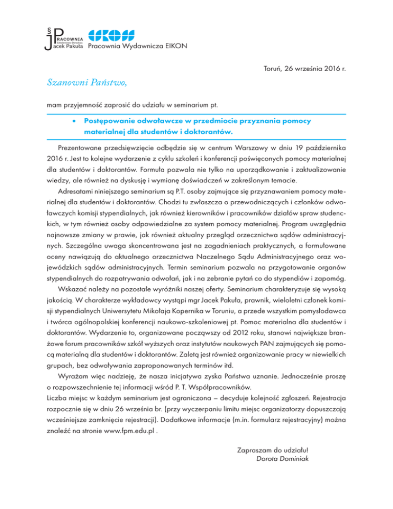 § racownia Szkoleniowo-Doradcza acek Pakuła Pracownia Wydawnicza EIKON Toruń, 26 września 2016 r. Szanowni Państwo, mam przyjemność zaprosić do udziału w seminarium pt. • Postępowanie odwoławcze w przedmiocie przyznania pomocy materialnej dla studentów i doktorantów. Prezentowane przedsięwzięcie odbędzie się w centrum Warszawy w dniu 19 października 2016 r. Jest to kolejne wydarzenie z cyklu szkoleń i konferencji poświęconych pomocy materialnej dla studentów i doktorantów. Formuła pozwala nie tylko na uporządkowanie i zaktualizowanie wiedzy, ale również na dyskusję i wymianę doświadczeń w zakreślonym temacie. Adresatami niniejszego seminarium są P.T. osoby zajmujące się przyznawaniem pomocy materialnej dla studentów i doktorantów. Chodzi tu zwłaszcza o przewodniczących i członków odwoławczych komisji stypendialnych, jak również kierowników i pracowników działów spraw studenckich, w tym również osoby odpowiedzialne za system pomocy materialnej. Program uwzględnia najnowsze zmiany w prawie, jak również aktualny przegląd orzecznictwa sądów administracyjnych. Szczególna uwaga skoncentrowana jest na zagadnieniach praktycznych, a formułowane oceny nawiązują do aktualnego orzecznictwa Naczelnego Sądu Administracyjnego oraz wojewódzkich sądów administracyjnych. Termin seminarium pozwala na przygotowanie organów stypendialnych do rozpatrywania odwołań, jak i na zebranie pytań co do stypendiów i zapomóg. Wskazać należy na pozostałe wyróżniki naszej oferty. Seminarium charakteryzuje się wysoką jakością. W charakterze wykładowcy wystąpi mgr Jacek Pakuła, prawnik, wieloletni członek komisji stypendialnych Uniwersytetu Mikołaja Kopernika w Toruniu, a przede wszystkim pomysłodawca i twórca ogólnopolskiej konferencji naukowo-szkoleniowej pt. Pomoc materialna dla studentów i doktorantów. Wydarzenie to, organizowane począwszy od 2012 roku, stanowi największe branżowe forum pracowników szkół wyższych oraz instytutów naukowych PAN zajmujących się pomocą materialną dla studentów i doktorantów. Zaletą jest również organizowanie pracy w niewielkich grupach, bez odwoływania zaproponowanych terminów itd. Wyrażam więc nadzieję, że nasza inicjatywa zyska Państwa uznanie. Jednocześnie proszę o rozpowszechnienie tej informacji wśród P. T. Współpracowników. Liczba miejsc w każdym seminarium jest ograniczona – decyduje kolejność zgłoszeń. Rejestracja rozpocznie się w dniu 26 września br. (przy wyczerpaniu limitu miejsc organizatorzy dopuszczają wcześniejsze zamknięcie rejestracji). Dodatkowe informacje (m.in. formularz rejestracyjny) można znaleźć na stronie www.fpm.edu.pl . Zapraszam do udziału! Dorota Dominiak Seminarium Postępowanie odwoławcze w przedmiocie przyznania pomocy materialnej dla studentów i doktorantów Data: 19 października 2016 r. (godz. 9.00-15.30) Miejsce: As-Bud Centrum Konferencyjno-Szkoleniowe, Al. Jerozolimskie 81, Warszawa (obok Dworca Centralnego PKP) Seminarium adresowane jest do P.T. Osób, które zajmują się przyznawaniem pomocy materialnej dla studentów i doktorantów: przewodniczących i członków odwoławczych komisji stypendialnych, kierowników i pracowników działów spraw studenckich itd. Program uwzględnia najnowsze zmiany w prawie, jak również aktualny przegląd orzecznictwa sądów administracyjnych. Jednodniowa formuła pozwala w sposób dogodny zaprezentować kwestie ważne przy procesie przyznawania pomocy materialnej, bez potrzeby generowania dłuższej nieobecności w pracy. Termin seminarium został zaś tak zakreślony, ażeby z jednej strony przygotować organy stypendialne do rozpatrywania odwołań, a przy tym rozwiązać aktualne wątpliwości, gdy idzie o stypendia i zapomogi. Program obejmuje m.in. takie zagadnienia jak: »» Autonomia szkolnictwa wyższego a orzekanie w sprawach z zakresu pomocy materialnej dla studentów i doktorantów; »» Odpowiednie stosowanie Kodeksu postępowania administracyjnego w sprawach z zakresu pomocy materialnej dla studentów i doktorantów; »» System organów przyznających pomoc materialną dla studentów i doktorantów; »» Zwyczajne środki odwoławcze; »» Kontrola formalna odwołania; »» Postępowanie dowodowe; »» Sposoby rozstrzygnięć organu odwoławczego; »» Wybrane problemy związanie z następującymi świadczeniami: • Stypendium socjalne i tzw. dopłata mieszkaniowa – z uwzględnieniem zasad obliczania dochodu w rodzinie oraz progów dochodowych obowiązujących od 1 listopada 2016 r., • Stypendium rektora dla najlepszych studentów i stypendium dla najlepszych doktorantów, • Stypendium specjalne dla osób niepełnosprawnych, • Zapomoga, • Stypendium doktoranckie i tzw. projakościowe. »» Tryby nadzwyczajne, w tym nadzór dziekana i rektora; »» Wybrane aspekty postępowania sądowoadministracyjnego. Wykładowca JACEK PAKUŁA — prawnik, absolwent Wydziału Prawa i Administracji UMK w Toruniu, pomysłodawca toruńskiej konferencji szkoleniowej pt. Pomoc materialna dla studentów i doktorantów. Autor opinii prawnych, artykułów prasowych (Dziennik Gazeta Prawna, Rzeczpospolita, Forum Akademickie) i publikacji naukowo-szkoleniowych z zakresu pomocy materialnej, m.in. Pomoc materialna dla studentów. Podręczny komentarz. Przegląd orzecznictwa. Wzory pism (Toruń 2014); redaktor naukowy i współautor publikacji pt. Prawo o szkolnictwie wyższym. Nowe prawo - aktualne problemy (Toruń 2012), Współczesne problemy nauki i szkolnictwa wyższego (Toruń 2013), Współczesne problemy nauki i szkolnictwa wyższego. Continuum (Toruń 2015). Udział w seminarium wiąże się z opłatnością w kwocie: »» rejestracja do dnia 5 października br. – 400 zł. (VAT zw.); »» rejestracja po 5 października br. – 500 zł. (VAT zw.); »» dla uczestników V Ogólnopolskiej Konferencji pt. Pomoc materialna dla studentów i doktorantów (Toruń, 6-8 czerwca 