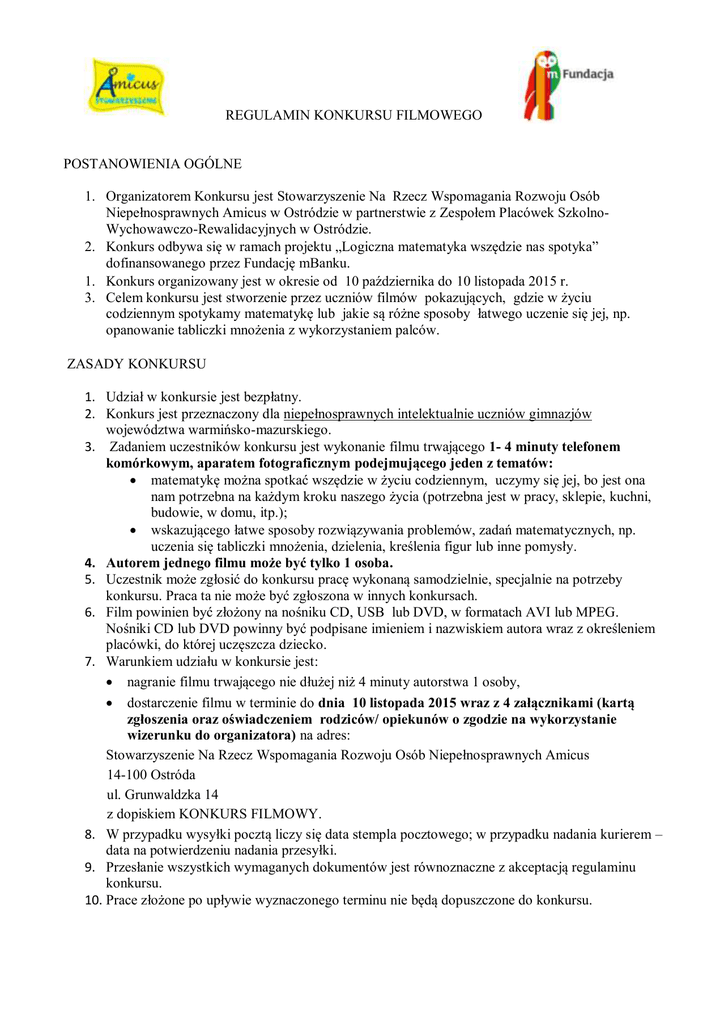 REGULAMIN KONKURSU FILMOWEGO POSTANOWIENIA OGÓLNE 1. Organizatorem Konkursu jest Stowarzyszenie Na Rzecz Wspomagania Rozwoju Osób Niepełnosprawnych Amicus w Ostródzie w partnerstwie z Zespołem Placówek SzkolnoWychowawczo-Rewalidacyjnych w Ostródzie. 2. Konkurs odbywa się w ramach projektu „Logiczna matematyka wszędzie nas spotyka” dofinansowanego przez Fundację mBanku. 1. Konkurs organizowany jest w okresie od 10 października do 10 listopada 2015 r. 3. Celem konkursu jest stworzenie przez uczniów filmów pokazujących, gdzie w życiu codziennym spotykamy matematykę lub jakie są różne sposoby łatwego uczenie się jej, np. opanowanie tabliczki mnożenia z wykorzystaniem palców. ZASADY KONKURSU 1. Udział w konkursie jest bezpłatny. 2. Konkurs jest przeznaczony dla niepełnosprawnych intelektualnie uczniów gimnazjów województwa warmińsko-mazurskiego. 3. Zadaniem uczestników konkursu jest wykonanie filmu trwającego 1- 4 minuty telefonem komórkowym, aparatem fotograficznym podejmującego jeden z tematów: matematykę można spotkać wszędzie w życiu codziennym, uczymy się jej, bo jest ona nam potrzebna na każdym kroku naszego życia (potrzebna jest w pracy, sklepie, kuchni, budowie, w domu, itp.); wskazującego łatwe sposoby rozwiązywania problemów, zadań matematycznych, np. uczenia się tabliczki mnożenia, dzielenia, kreślenia figur lub inne pomysły. 4. Autorem jednego filmu może być tylko 1 osoba. 5. Uczestnik może zgłosić do konkursu pracę wykonaną samodzielnie, specjalnie na potrzeby konkursu. Praca ta nie może być zgłoszona w innych konkursach. 6. Film powinien być złożony na nośniku CD, USB lub DVD, w formatach AVI lub MPEG. Nośniki CD lub DVD powinny być podpisane imieniem i nazwiskiem autora wraz z określeniem placówki, do której uczęszcza dziecko. 7. Warunkiem udziału w konkursie jest: nagranie filmu trwającego nie dłużej niż 4 minuty autorstwa 1 osoby, dostarczenie filmu w terminie do dnia 10 listopada 2015 wraz z 4 załącznikami (kartą zgłoszenia oraz oświadczeniem rodziców/ opiekunów o zgodzie na wykorzystanie wizerunku do organizatora) na adres: Stowarzyszenie Na Rzecz Wspomagania Rozwoju Osób Niepełnosprawnych Amicus 14-100 Ostróda ul. Grunwaldzka 14 z dopiskiem KONKURS FILMOWY. 8. W przypadku wysyłki pocztą liczy się data stempla pocztowego; w przypadku nadania kurierem – data na potwierdzeniu nadania przesyłki. 9. Przesłanie wszystkich wymaganych dokumentów jest równoznaczne z akceptacją regulaminu konkursu. 10. Prace złożone po upływie wyznaczonego terminu nie będą dopuszczone do konkursu. OCENA I NAGRODY 1. Komisja konkursowa dokona oceny prac konkursowych i wybierze pięć najlepszych prac. 2. Prace konkursowe będą podlegały według kryteriów: 3. – zgodność pracy z tematem konkursu, długość filmu – poprawność merytoryczna informacji zamieszczonych w pracy konkursowej – kreatywność i oryginalność w ujęciu tematu, – kompozycja i spójność pracy, – zrozumiały przekaz pracy, – ogólne wrażenie estetyczne. 4. Rozstrzygnięcie konkursu nastąpi w dniach 15 - 25 listopada 2015 podczas prezentacji filmów społeczności uczniowskiej ZPSWR w Ostródzie, która wybierze również najlepszy film nagrodzony przez publiczność. 5. W konkursie przewidziane są nagrody rzeczowe dla 5 laureatów w postaci tabletów, smartfonów lub innego sprzętu elektronicznego. 6. Organizator zastrzega sobie możliwość innego podziału nagród w zależności od liczby nadesłanych prac oraz ich poziomu merytorycznego i artystycznego. 7. Nagrody zostaną wysłane pocztą na koszt organizatora. 8. Komisja konkursowa ma prawo nie wyłonić laureatów w przypadku, gdy poziom prac nie będzie spełniał wymogów niniejszego regulaminu. Postanowienia końcowe 1. Przystąpienie do konkursu jest równoznaczne z akceptacją niniejszego regulaminu. 2. Organizator konkursu zastrzega sobie prawo do wykorzystania i publikacji prac w mediach i materiałach promujących konkurs oraz na stronach internetowych i mediach społecznościowych, np. Facebook oraz przekazania ich darczyńcy projektu Fundacji mBanku (w tym celu prosimy wypełnić stosowne oświadczenia- zał. 1-4) 3. W wyjątkowych sytuacjach Organizator konkursu zastrzega sobie prawo do zmian w regulaminie, nie naruszając ogólnych zasad konkursu. 4. Organizator konkursu nie ponosi odpowiedzialności za odwołanie konkursu bądź zmiany w harmonogramie, które wynikły z przyczyn od niego niezależnych. 5. Na działania komisji konkursowych i zasady konkursu nie przysługuje zażalenie. 6. Kwestie nieuregulowane w niniejszym regulaminie są rozstrzygane przez Organizatora. 7. Prace zgłoszone do konkursu pozostają u Organizatora. Załącznik nr 1 – Karta zgłoszenia Załącznik nr 2 – Oświadczenie uczestnika Załącznik nr 3 – Oświadczenie nauczyciela/opiekuna Załącznik nr 4 - Zgoda na rozpowszechnianie wizerunku dziecka przez Fundację mBanku Wszelkich informacji udziela koordynatorka konkursu- Grażyna Modrzewska -Tel. 507035222. Mile widziany telefoniczne zgłoszenie chęci udziału w konkursie ZAŁĄCZNIK NR 1 …………..…………………………………… Pieczątka szkoły z adresem Karta zgłoszenia do konkursu „Logiczna matematyka wszędzie nas spotyka” realizowanego przez Stowarzyszenie Amicus w Ostródzie z dotacji Fundacji mBanku KARTĘ ZGŁOSZENIA NALEŻY WYPEŁNIĆ CZYTELNIE, DRUKOWANYMI LITERAMI I ODRĘCZNIE PODPISAĆ Dane uczestnika konkursu Imię i nazwisko Klasa Dane szkoły zgłaszającej uczestnika Nazwa szkoły Adres szkoły (ulica, nr, kod pocztowy, miejscowość) Nr telefonu szkoły Adres e-mail szkoły Opiekun ucznia w konkursie, telefon kontaktowy Dane rodzica lub opiekuna prawnego Imię i nazwisko Nr telefonu Adres e-mail Tytuł zgłaszanej pracy: …………..…………………………………… (data i podpis dyrektora szkoły) Załącznik nr 2 miejscowość, data OŚWIADCZENIE