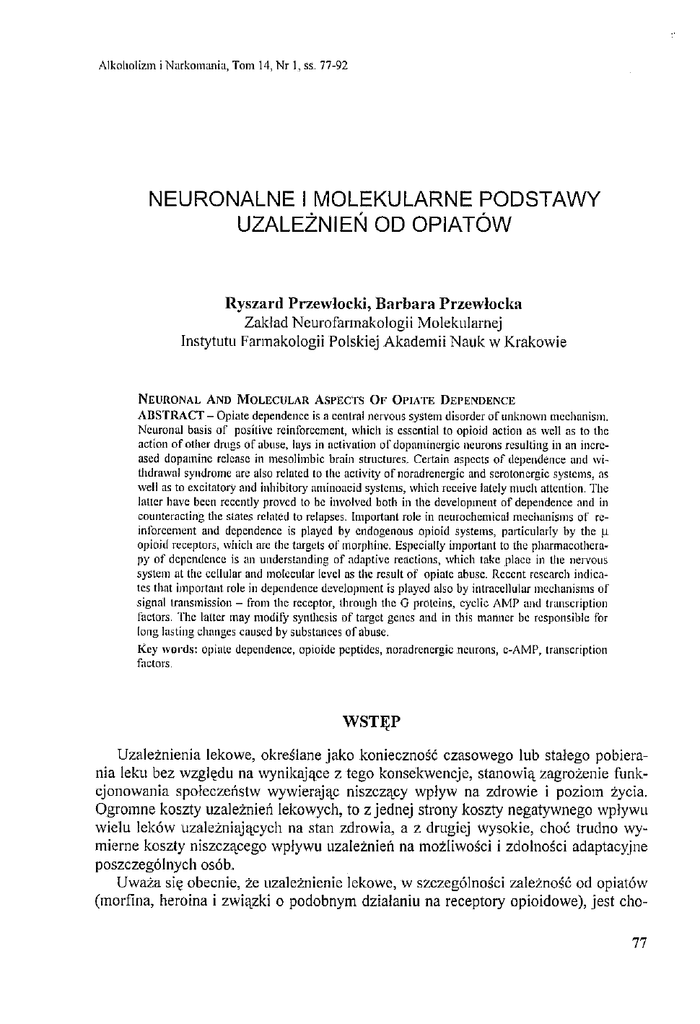Alkoholizm i Narkomania, Tom 14, Nr 1, ss. 77-92 NEURONALNE I MOLEKULARNE PODSTAWY UZALEŻNIEŃ OD OPIATÓW Ryszard Przewlocki, Barbara Przewlocka Zakład Neurofarmakologii Molekularnej Instytutu Farmakologii Polskiej Akademii Nauk w Krakowie NEURONAL AND MOLECULAR ASPECTS OF OPIATE DEPENDENCE ABSTRACT - Opiate dependence is a central ncrvous system disorder of unknown mechanism. Neuronal basis of positive reinforcement, which is essential to opioid action as we1l as to the action of other drugs of abuse, lays in activation ar dopmninergic neurons resulting in nn increased dopamine release in mcsolimbic brain structures. Certain aspects of dependence and withdrawal syndrome are also related to the activity ar Iloradrenergic and serotoncrgie systems, as well as to excitatory and inhibitory aminoacid systems, which receive lately much attention. The lauer have been recently proved to be involved both in the development of dependence and in countemcting the statcs rdated to relapses. Important role in neurochemicalmechanislllS of reinforcemcnt and dependence is playcd by endogenous opia id systems, particularly by the )l opioid rcceptors, which are the targcts morphine. Especially important to the pharmacothempy of depcndellce is an understanding of adaptive reactions, which take place in the nervolls system at the celllllar and molecular [evc! as the rcsult ot' opiate abuse. Recent rescarch indicatcs that important role in dependencc devclopmcnt Is played also by intracellu[ar lllcchanisms of signal transmissioll - from thc receptor, through the G proteins, cyclic AMP and transcription factors. The lattcr may modify synthesis of target gellcs and in this manner be responsiblc tor long lasting changes caused by substances ar abuse. ar Key words: opiate dependence, opioide peptidcs, noradrenergic neurons, c-AMP, tnillscription f<letors. WSTĘP Uzależnienia lekowe, określane jako konieczność czasowego lub stałego pobierania leku bez względu na wynikające z tego konsekwencje, stanowią zagrożenie funkcjonowania społeczeństw wywierając niszczący wpływ na zdrowie i poziom życia. Ogromne koszty uzależnień lekowych, to z jednej strony koszty negatywnego wpływu wielu leków uzależniających na stan zdrowia, a z drugiej wysokie, choć trudno wymierne koszty niszczącego wpływu uzależnień na możliwości i zdolności adaptacyjne poszczególnych osób. Uważa się obecnie, że uzależnienie lekowe, w szczególności zależność od opiatów (morfina, heroina i związki o podobnym działaniu na receptory opioidowe), jest cho- 77 Ryszard Przewłocki, Barbara Przewłocka robą ośrodkowego układu nerwowego o nieznanym mechanizmie. Ta choroba mózgu prowadzi do poważnych, często trudnych do przewidzenia konsekwencji społecznych. Skuteczne leki i metody zapobiegania rozwojowi uzależnień a również nawrotom choroby nie są jeszcze dostępne. Pomimo wielu lat badań nie udało się opracować zadowalającej terapii tego schorzenia. Współczesne postępowanie kliniczne pozwala bowiem na skuteczną detoksykację, to jest usunięcie Z organizmu chorego substancji uzależniającej oraz uwolnienie go od ujemnych objawów będących skutkiem pobierania leków uzależniających. Jednakże nie oznacza to wyleczenia, gdyż uzależnienie prowadzi do utrwalonych zmian psychologicznych i dramatycznych nawrotów choroby. W przypadku uzależnienia od opiatów dochodzi do nawrotów u 90% chorych, a w chorobie alkoholowej u 75-90%. Tak więc sytuacja w zakresie leczenia uzależnień lekowych jest niepokojąca i wymaga szybkiego i skutecznego działania. Głównym celem poszukiwań i badań prowadzonych przez wiele światowych zespołów naukowych jest nowoczesna, racjonalna fannakoterapia wpływająca na neuronalne i molekularne mechanizmy uzależnienia. Znaczenie szczególne ma poznanie reakcji adaptacyjnych w układzie nerwowym, rozwijających się w wyniku przyjmowania środków uzależniających. Te zmiany adaptacyjne warunkują skomplikowany zespół zachowań określany jako zależność. Leżą one również u podstawy takich przewlekłych aspektów uzależnienia, jak nieopanowane pragnienie zażycia narkotyku i niepokój związany z brakiem substancji uzależniającej (craving) i powrót do stosowania substancji uzależ niającej (re/apse). Warunkiem niezbędnym do stworzenia skutecznej terapii są intensywne badania neurobiologiczne i molekularne niewyjaśnionych dotychczas mechanizmów uzależnień. Liczną grupę badań stanowią prace na modelach zwierzęcych, co jest tym bardziej uzasadnione, że w porównaniu z modelami innych chorób układu nerwowego, dobrze odzwierciedlają one fazy rozwoju choroby u ludzi. Badania na zwierzętach w korelacji z badaniami klinicznymi, mają prowadzić do opracowania przesłanek do syntezy nowych związków o potencjalnym działaniu przeciwuzależnie niowym. Neuronalne podstawy uzależnień NeurO/ly dopami/lergicZ/le Podłożem neuronalnym zjawiska zwanego wzmocnieniem pozytywnym, które leży u podstaw działania leków uzależniających, jest układ dopaminowy (Davidson i Stamford 1993, Koob 1992, Kornetsky i Porrino 1992). Dopaminowy system mezolimbiczny składa się z neuronów dopaminowych znajdujących się w polu brzusznym nakrywki (VTA) i miejsc docelowych ich projekcji czyli jądra półleżącego (NAS), brzuszno przedniej części jądra ogoniastego, jądra migdałowatego czy kory przedczołowej. Podstawowym warunkiem wzmocnienia pozytywnego jest pobudzenie dopaminowych neuronów w VTA i wzrost wydzielania dopaminy w NAS. Wspólnym efektem działa nia należących do różnych farmakologicznych grup leków uzależniających - opioidów, jak i innych leków uzależniających, takich jak kokaina, amfetamina, etanol, nikotyna, tetrahydrokanabinol - jest wlaśnie wzrost wydzielania dopaminy w NAS. Efekt ten może wynikać zarówno z ich bezpośredniego dzialania na neurony dopami- 78 Neuronalne i molekularne podstawy uzależniell od opiatów