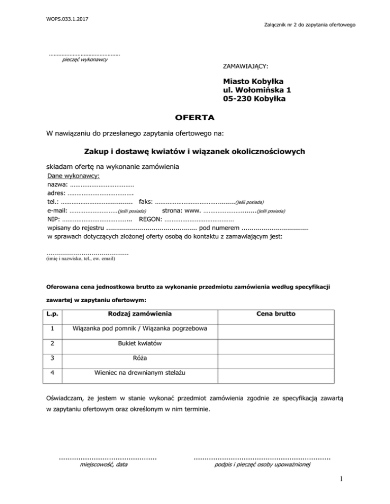 WOPS.033.1.2017 Załącznik nr 2 do zapytania ofertowego ............................................. pieczęć wykonawcy ZAMAWIAJĄCY: Miasto Kobyłka ul. Wołomińska 1 05-230 Kobyłka OFERTA W nawiązaniu do przesłanego zapytania ofertowego na: Zakup i dostawę kwiatów i wiązanek okolicznościowych składam ofertę na wykonanie zamówienia Dane wykonawcy: nazwa: ……………………………… adres: ………………………………. tel.: ………………………............ faks: ………………………………........(jeśli posiada) e-mail: ………………………(jeśli posiada) strona: www. …………………........(jeśli posiada) NIP: ………………………………... REGON: ………………………………… wpisany do rejestru .............................................. pod numerem .................................. w sprawach dotyczących złożonej oferty osobą do kontaktu z zamawiającym jest: …………………………………… (imię i nazwisko, tel., ew. email) Oferowana cena jednostkowa brutto za wykonanie przedmiotu zamówienia według specyfikacji zawartej w zapytaniu ofertowym: L.p. Rodzaj zamówienia Cena brutto 1 Wiązanka pod pomnik / Wiązanka pogrzebowa 2 Bukiet kwiatów 3 Róża 4 Wieniec na drewnianym stelażu Oświadczam, że jestem w stanie wykonać przedmiot zamówienia zgodnie ze specyfikacją zawartą w zapytaniu ofertowym oraz określonym w nim terminie. ............................................. miejscowość, data ............................................................... podpis i pieczęć osoby upoważnionej 1