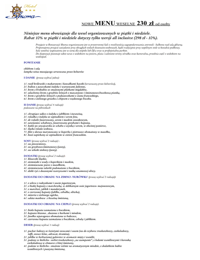 NOWE MENU WESELNE 230 zł od osoby Niniejsze menu obowiązuje dla wesel organizowanych w piątki i niedziele. Rabat 10% w piątki i niedziele dotyczy tylko wersji all inclusive (298 zł - 10%). Przyjęcie w Restauracji Shuma organizowane jest w przestronnej Sali z możliwością zagospodarowania antresoli - balkonu nad salą główną. Proponujemy przyjcie zasiadanie przy okrągłych stołach dwunasto-osobowych, bądź tradycyjnie przy wspólnym stole w kształcie podkowy. Sala weselna wyposażona jest w scenę dla zespołu lub DJ-a oraz w profesjonalny parkiet. Do dyspozycji pozostaje także taras z widokiem na jezioro, plaża i zalesione tereny ośrodka oraz kameralna, przednia część z widokiem na wodospad. POWITANIE chlebem i solą lampka wina musującego serwowana przez kelnerów I DANIE (proszę wybrać jedno): 1/. rosół królewski z makaronem i kawałkami kaczki (serwowany przez kelnerów), 2/. bulion z paseczkami indyka i warzywami Julienne, 3/. krem z brokułów ze smażonymi płatkami migdałów, 4/. szlachetny krem z grzybów leśnych z mascarpone i śmietanowo-boczkową pianką, 5/. krem z grzybów leśnych z poduszeczkami z ciasta francuskiego, 6/. krem z zielonego groszku z chipsem z wędzonego boczku. II DANIE (proszę wybrać 4 rodzaje): podawane na półmiskach 1/. chrupiące udźce z indyka z jabłkiem i żurawiną, 2/. roladka z indyka ze szpinakiem i serem feta, 3/. de volaile faszerowany, serem i masłem czosnkowym, 4/. zawijaniec schabowy, faszerowany grzybami i kapustą, 5/. kotlet po szwajcarsku ze schabu z szynką i serem, w złocistej panierce, 6/. śląska rolada wołowa, 7/. filet z dorsza marynowany w koperku i pietruszce obsmażony w masełku, 8/. łosoś zapiekany ze szpinakiem w cieście francuskim. SOSY (proszę wybrać 2 rodzaje) : 1/. sos pieczeniowy, 2/. sos grzybowo-śmietanowy (jasny), 3/. sos włoski ziołowy (jasny). DODATKI (proszę wybrać 2 rodzaje): 1/. kluseczki śląskie, 2/. ziemniaki z wody z koperkiem i masłem, 3/. ziemniaczane puree z masełkiem, 4/. ziemniaczane talarki podsmażane z boczkiem, 5/. dziki ryż z duszonymi warzywami i nutką sezamowej oliwy. DODATKI DO OBIADU NA ZIMNO /SURÓWKI/ (proszę wybrać 2 rodzaje): 1/. z selera z rodzynkami i sosem jogurtowym, 2/. z białej kapusty z marchewką, w delikatnym sosie jogurtowo- majonezowym, 3/. z marchwi, jabłek i mandarynek, 4/. z czerwonej kapusty (jabłko, cebulka, oliwka), 5/. mizeria z zielonego ogórka, 6/. sałata masłowa z kwaśną śmietaną, DODATKI DO OBIADU NA CIEPŁO (proszę wybrać 2 rodzaje): 1/. biała kapusta zasmażana z boczkiem, 2/. kapusta kiszona , duszona z kurkami i miodem, 3/. fasolka szparagowa obsmażana w bułeczce, 4/. czerwona kapusta zasmażana z boczkiem, cebulą i jabłkiem. DESER (proszę wybrać 1 rodzaj): 1/. puchar lodowy ze świeżymi owocami i sosem (sos do wyboru: truskawkowy, czekoladowy, toffi, owoce leśne, advocat, tiramisu), 2/. jabłka w herbacianej galaretce w aromacie mięty i wanilii, 3/. podany w kielichu - sorbet truskawkowy „na szampanie”, z lodami waniliowymi i koronką czekoladową w chmurce z bitej śmietany, 4/. podane w kielichu - smażone wiśnie na aromatycznym miodzie, z dodatkiem lodów waniliowych i puszystą śmietaną, 5/. rożek musu pomarańczowego z biszkoptem czekoladowym na sosie malinowym, z listkiem mięty. ZIMNE ZAKĄSKI wszystkie wymienione poniżej znajdują się na stołach weselników 1/. kurczak po kurpiowsku faszerowany wątróbką i ziołami, 2/. półmisek tradycyjnych zimnych mięs pieczonych i wędlin, 3/. pasztety z suszonymi owocami w otoczce słoniny i ziół, 4/. deski serów różnych, z bakaliami, 5/. galaretki warzywno – mięsne, 6/. „Koszyczki” śledzi z zielonym groszkiem na musie śmietanowo – musztardowym, 7/. śledzie wiejskie z marynowanym imbirem i korniszonami 8/. sos tatarski, sos chrzanowy, musztarda, chrzan, marynaty, masełko ziołowe, pieczywo jasne i ciemne. SAŁATKI (proszę wybrać 3 rodzaje): 1/. sałatka włoska Caprese z mozzarelą i pomidorami, 2/. sałatka grecka z serem feta i oliwkami, 3/. sałatka jarzynowa, 4/. sałatka z brokuł z szynką, serem pleśniowym, papryką oraz sosem jogurtowo-majonezowym, 5/. sałatka Casablanca z kurczakiem w kurkumie z sałatą lodową, pomidorami, papryką, ogórkiem, 6/. sałatka z Rostbefu z sosem gruszkowym, 7/. sałatka zielona „Niewiast” z makaronem ryżowym, zielonym ogórkiem i ananasem I GORĄCA KOLACJA serwowana przez kelnerów (proszę wybrać 1 rodzaj): 1/. pierś z kurczaka zawijana boczkiem z sakiewką ziemniaczaną z ciasta francuskiego i bukietem jarzyn, 2/. kieszonka z piersi z kurczaka z warzywami pod sosem Dor blue, z kopytkami i surówką, 3/. karczek z grilla przeplatany boczkiem, z zapiekanką warzywną i ziołowo – czosnkowym dipem, z sałatką z korniszonów i czerwonej cebuli, 4/. łosoś duszony w pomidorach na szpinakowym tagliatelle, II i III GORĄCA KOLACJA (proszę wybrać odpowiednio 2 dania): serwowana przez kelnerów 1/. ragu z maślakami i suszonymi pomidorami 2/. bogracz na wieprzowinie 3/. Boeuf Strogonow 4/. meksykańska zupa Chilli con carne 5/. barszczyk czerwony z pasztecikiem w cieście drożdżowym 6/. żurek na maślance z wędzonką DODATKOWO bez ograniczeń: napoje gorące: kawa ze śmietanką herbata z cytryną PATERY OWOCÓW DEKORACJA Żywe kwiaty w dużych „ikebanach” na świecznikach CZAS PRZYJĘCIA Przyjęcie w n/w cenie trwa do godziny 5:00 rano. Każda kolejna rozpoczęta godzina to koszt 1000 zł. PAŃSTWO MŁODZI otrzymują GRATIS Pokój hotelowy ze śniadaniem KOSZT 230 ZŁ / OSOBA DOROSŁA (cena na sezon 2016) 230 ZŁ /OSOBA Z OBSŁUGI (CZŁONEK ZESPOŁU/DJ, FOTOGRAF , KAMERZYSTA) 115 ZŁ/DZIECI W WIEKU 4-14 LAT 0 ZŁ / DZIECI DO 3 ROKU ŻYCA Za własne napoje i alkohol doliczamy 8 zł/od osoby Obniżamy ceny napojów na przyjęcia weselne, płatne wg spożycia (cena zawiera tzw. opłatę korkową ): Napoje bezalkoholowe systemu Pepsi – butelka szklana 0,