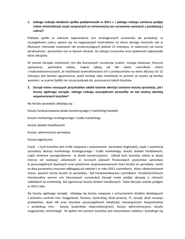 1. Jakiego rodzaju działania spółka podejmowała w 2011 r. i jakiego rodzaju zamierza podjąć celem minimalizacji ryzyk związanych ze zmiennością cen surowców zwianych z produkcją ( cukru)? Polityka spółki w zakresie zapewnienia cen strategicznych surowców do produkcji, w szczególności cukru, opiera się na negocjacjach kontraktów na okres danego kwartału lub w dłuższym interwale czasowym nie przekraczającym jednak 12 miesięcy, w zależności od oceny atrakcyjności poziomów cen w danym okresie. Za zakupy surowców oraz opakowań odpowiada dział zakupów. W ocenie Zarządu zmienność cen dla kluczowych surowców (cukier, miazga kakaowa, tłuszcze spożywcze, pochodne mleka, mąka) zależą od tak wielu czynników mikro i makroekonomicznych, że możliwość kontraktowania ich u producentów na okres dłuższy niż 12 miesięcy jest bardzo ograniczona, jeżeli istnieje taka możliwość to premie za ryzyko są bardzo wysokie i w ocenie Spółki nie ma przesłanek do ponoszenia takich kosztów. 2. Zarząd mimo rosnących przychodów zdołał istotnie obniżyć zarówno koszty sprzedaży, jak i koszty ogólnego zarządu. Jakiego rodzaju oszczędności pozwoliły na tak istotną obniżkę wspomnianych kosztów? Na koszty sprzedaży składają się : Koszty funkcjonowania działu komercyjnego ( marketing+handel) Koszty marketingu strategicznego i trade marketingu Koszty działań handlowych Koszty administracji sprzedaży Koszty logistyczne Część z tych kosztów jest ściśle związana z wolumenem sprzedaży (logistyka), część z wartością sprzedaży (koszty marketingu strategicznego i trade marketingu, koszty działań handlowych, część zmienna wynagrodzenia w dziale komercyjnym). Udział tych kosztów zależy w dużej mierze od realizacji założonych w rocznych planach finansowych poziomów sprzedaży w poszczególnych dywizjach oraz poziomem wypracowywanych marż brutto ze sprzedaży. Jeżeli te dwa parametry znacznie odbiegają od założeń ( w roku 2011 czynnikiem, który zdeterminował niższy poziom marży brutto ze sprzedaży, był niespowodowany czynnikami fundamentalnymi nienaturalny wzrost cen kluczowych surowców) Zarząd może podjąć decyzję o niższych nakładach na marketing lub ograniczyć koszty działań handlowych. Takie decyzje zostały podjęte w 2011 roku. Na koszty ogólnego zarządu składają się koszty związane z utrzymaniem działów działających z poziomu centrali min: księgowość, finanse, controling, dział prawny, IT, zarząd, dział rozwoju produktów, dział HR oraz kosztów poszczególnych lokalizacji niezwiązanych bezpośrednio z produkcją min: koszty budynków nieprodukcyjnych, koszty administracyjne, koszty magazynów, technologii. W spółce ten poziom kosztów jest stosunkowo stabilny i kształtuje się na poziomie 7% przychodów, przy każdym procesie budżetowania prowadzone są inicjatywy mające na celu optymalizację tych kosztów. 3. Czego dotyczą patenty i licencje wykazane w bilansie o wartości 12 mln zł ? Wykazana w bilansie skonsolidowanymwartość 12 201 tys. PLN, w pozycji „patenty i licencje,” obejmujewykorzystywane w działalności operacyjnej,przede wszystkim przez spółkę Jutrzenka Colian Sp. z o.o.,patenty, prawa autorskie, pozwolenia na użytkowanie a także licencje na używanie programów komputerowych: Wyszczególnienie Wartość bilansowa brutto na dzień 01.01.2011 Zwiększenia, z tytułu: - nabycia Zmniejszenia, z tytułu: - inne Wartość bilansowa brutto na dzień 31.12.2011 Umorzenie na dzień 01.01.2011 Zwiększenia, z tytułu: - amortyzacji Zmniejszenia Umorzenie na dzień 31.12.2011 Odpisy aktualizujące na dzień 01.01.2011 Zwiększenia, z tytułu: - utrata wartości Zmniejszenia Odpisy aktualizujące na dzień 31.12.2011 Wartość bilansowa netto na dzień 31.12.2011 Koszty prac Znaki rozwojowych1 towarowe2 0 0 256 624 0 0 Patenty Wartości Oprogramowanie i Inne2 niematerialne Ogółem 2 komputerowe licencje2 w budowie 220 11 11 0 238 0 0 20 532 91 91 0 0 256 624 20 623 231 238 0 0 0 0 0 0 6 502 1 920 1 920 0 155 34 34 0 149 41 41 0 0 0 8 422 189 190 0 0 0 0 0 0 0 0 0 190 1 083 1 083 0 0 0 0 0 1 273 0 0 0 0 255 351 12 201 42 48 0 0 277 614 263 263 98 98 365 365 98 98 165 277 881 0 6 806 0 0 1 995 1 995 0 0 8 801 0 190 0 0 1 083 1 083 0 0 1 273 165 267 807 4. Spółka na koniec 2011 r. posiadała blisko 43 mln zł gotówki. Czy zarząd ma pomysł na jej wykorzystanie? Wykazana w bilansie skonsolidowanym wartość 43 100 tys. PLN w pozycji „Środki pieniężne i ich ekwiwalenty” obejmuje wartość krótkoterminowej lokaty środków pieniężnych w wysokości 40 000 tys. PLN. Lokata, po dacie jej zapadalności, została wykorzystana na spłatę kredytu obrotowego. 5. Z czym związany był wzrost kredytów oprocentowanych w 2011 z20 mln zł w 2010 r. do 64 mln zł w 2011 r.? Wykazany w bilansie skonsolidowanym wzrost kredytów krótkoterminowych ( z 20 252 tys. PLN na dzień 31.12.2010 do wysokości 64 269 tys. PLN na dzień 31.12.2011) wynika ze złożenia kwoty 40 000 tys. PLN na krótkoterminowej lokacie bankowej. 6. Dlaczego w prognozach przy teście na utratę wartości znaków towarowych przyjęto stopę wzrostu po okresie projekcji na poziomie aż 5%. Pytanie wynika z tego, że ten współczynnik ma olbrzymi wpływ na poziom wartości rezydualne, a więc wyceny po okresie szczegółowej prognozy, która w bardzo istotnym stopniu wpływa na końcową wartość znaków towarowych. Ponadto w praktyce rzadko spotyka się tak wysoką stopę wzrostu po okresie szczegółowej prognozy? Stopa wzrostu przychodów po okresie szczegółowej projekcji została przyjęta zgodnie z wytycznymi MSR 36, zgodnie z którymi: - "prognozy dotyczące przepływów pieniężnych okresu wykraczającego poza okres objęty planem finansowym powinny być przeprowadzone jako ekstrapolacja prognoz opartych na budżecie / planie finansowym, przy zastosowaniu stałej lub malejącej stopy wzros