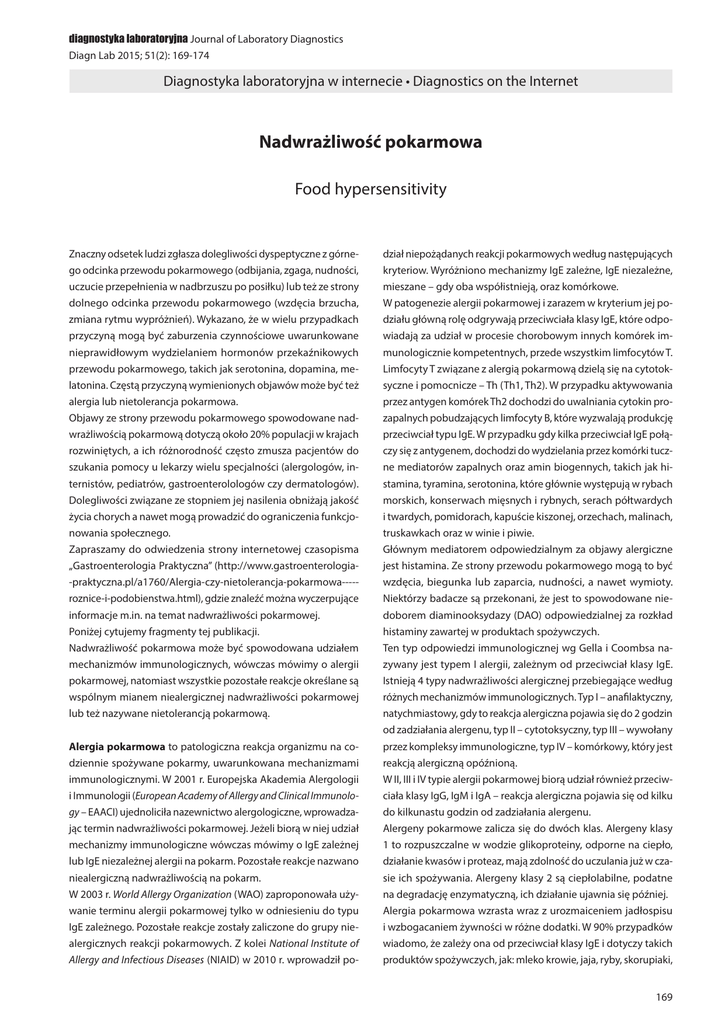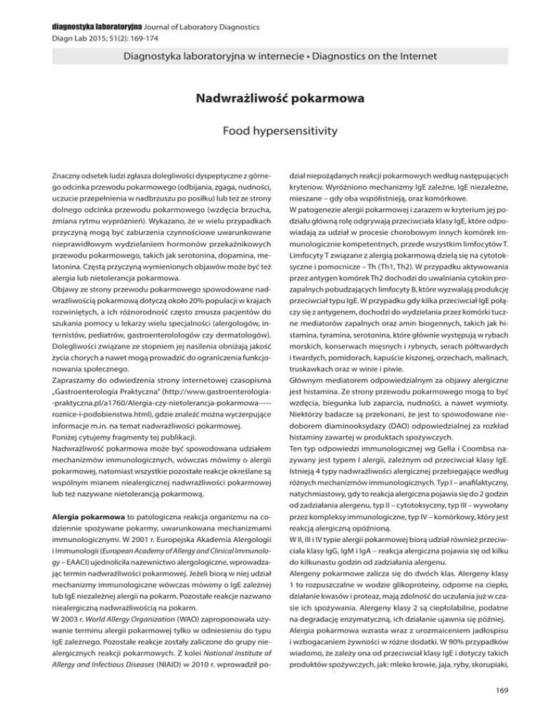 diagnostyka laboratoryjna Journal of Laboratory Diagnostics Diagn Lab 2015; 51(2): 169-174 Diagnostyka laboratoryjna w internecie • Diagnostics on the Internet Nadwrażliwość pokarmowa Food hypersensitivity Znaczny odsetek ludzi zgłasza dolegliwości dyspeptyczne z górnego odcinka przewodu pokarmowego (odbijania, zgaga, nudności, uczucie przepełnienia w nadbrzuszu po posiłku) lub też ze strony dolnego odcinka przewodu pokarmowego (wzdęcia brzucha, zmiana rytmu wypróżnień). Wykazano, że w wielu przypadkach przyczyną mogą być zaburzenia czynnościowe uwarunkowane nieprawidłowym wydzielaniem hormonów przekaźnikowych przewodu pokarmowego, takich jak serotonina, dopamina, melatonina. Częstą przyczyną wymienionych objawów może być też alergia lub nietolerancja pokarmowa. Objawy ze strony przewodu pokarmowego spowodowane nadwrażliwością pokarmową dotyczą około 20% populacji w krajach rozwiniętych, a ich różnorodność często zmusza pacjentów do szukania pomocy u lekarzy wielu specjalności (alergologów, internistów, pediatrów, gastroenterolologów czy dermatologów). Dolegliwości związane ze stopniem jej nasilenia obniżają jakość życia chorych a nawet mogą prowadzić do ograniczenia funkcjonowania społecznego. Zapraszamy do odwiedzenia strony internetowej czasopisma „Gastroenterologia Praktyczna” (http://www.gastroenterologia-praktyczna.pl/a1760/Alergia-czy-nietolerancja-pokarmowa----roznice-i-podobienstwa.html), gdzie znaleźć można wyczerpujące informacje m.in. na temat nadwrażliwości pokarmowej. Poniżej cytujemy fragmenty tej publikacji. Nadwrażliwość pokarmowa może być spowodowana udziałem mechanizmów immunologicznych, wówczas mówimy o alergii pokarmowej, natomiast wszystkie pozostałe reakcje określane są wspólnym mianem niealergicznej nadwrażliwości pokarmowej lub też nazywane nietolerancją pokarmową. Alergia pokarmowa to patologiczna reakcja organizmu na codziennie spożywane pokarmy, uwarunkowana mechanizmami immunologicznymi. W 2001 r. Europejska Akademia Alergologii i Immunologii (European Academy of Allergy and Clinical Immunology – EAACI) ujednoliciła nazewnictwo alergologiczne, wprowadzając termin nadwrażliwości pokarmowej. Jeżeli biorą w niej udział mechanizmy immunologiczne wówczas mówimy o IgE zależnej lub IgE niezależnej alergii na pokarm. Pozostałe reakcje nazwano niealergiczną nadwrażliwością na pokarm. W 2003 r. World Allergy Organization (WAO) zaproponowała używanie terminu alergii pokarmowej tylko w odniesieniu do typu IgE zależnego. Pozostałe reakcje zostały zaliczone do grupy niealergicznych reakcji pokarmowych. Z kolei National Institute of Allergy and Infectious Diseases (NIAID) w 2010 r. wprowadził po- dział niepożądanych reakcji pokarmowych według następujących kryteriow. Wyróżniono mechanizmy IgE zależne, IgE niezależne, mieszane – gdy oba współistnieją, oraz komórkowe. W patogenezie alergii pokarmowej i zarazem w kryterium jej podziału główną rolę odgrywają przeciwciała klasy IgE, które odpowiadają za udział w procesie chorobowym innych komórek immunologicznie kompetentnych, przede wszystkim limfocytów T. Limfocyty T związane z alergią pokarmową dzielą się na cytotoksyczne i pomocnicze – Th (Th1, Th2). W przypadku aktywowania przez antygen komórek Th2 dochodzi do uwalniania cytokin prozapalnych pobudzających limfocyty B, które wyzwalają produkcję przeciwciał typu IgE. W przypadku gdy kilka przeciwciał IgE połączy się z antygenem, dochodzi do wydzielania przez komórki tuczne mediatorów zapalnych oraz amin biogennych, takich jak histamina, tyramina, serotonina, które głównie występują w rybach morskich, konserwach mięsnych i rybnych, serach półtwardych i twardych, pomidorach, kapuście kiszonej, orzechach, malinach, truskawkach oraz w winie i piwie. Głównym mediatorem odpowiedzialnym za objawy alergiczne jest histamina. Ze strony przewodu pokarmowego mogą to być wzdęcia, biegunka lub zaparcia, nudności, a nawet wymioty. Niektórzy badacze są przekonani, że jest to spowodowane niedoborem diaminooksydazy (DAO) odpowiedzialnej za rozkład histaminy zawartej w produktach spożywczych. Ten typ odpowiedzi immunologicznej wg Gella i Coombsa nazywany jest typem I alergii, zależnym od przeciwciał klasy IgE. Istnieją 4 typy nadwrażliwości alergicznej przebiegające według różnych mechanizmów immunologicznych. Typ I – anafilaktyczny, natychmiastowy, gdy to reakcja alergiczna pojawia się do 2 godzin od zadziałania alergenu, typ II – cytotoksyczny, typ III – wywołany przez kompleksy immunologiczne, typ IV – komórkowy, który jest reakcją alergiczną opóźnioną. W II, III i IV typie alergii pokarmowej biorą udział również przeciwciała klasy IgG, IgM i IgA – reakcja alergiczna pojawia się od kilku do kilkunastu godzin od zadziałania alergenu. Alergeny pokarmowe zalicza się do dwóch klas. Alergeny klasy 1 to rozpuszczalne w wodzie glikoproteiny, odporne na ciepło, działanie kwasów i proteaz, mają zdolność do uczulania już w czasie ich spożywania. Alergeny klasy 2 są ciepłolabilne, podatne na degradację enzymatyczną, ich działanie ujawnia się później. Alergia pokarmowa wzrasta wraz z urozmaiceniem jadłospisu i wzbogacaniem żywności w różne dodatki. W 90% przypadków wiadomo, że zależy ona od przeciwciał klasy IgE i dotyczy takich produktów spożywczych, jak: mleko krowie, jaja, ryby, skorupiaki, 169 www.diagnostykalaboratoryjna.eu soja, pszenica, orzeszki ziemne, orzechy, nasiona. Alergie pokarmowe wydają się odgrywać znaczącą rolę także w takich schorzeniach jak eozynofilowe zapalenia żołądka i choroba trzewna. Eozynofilowe zapalenie żołądka jest bardzo rzadką chorobą, charakteryzującą się naciekami zapalnymi z komórek kwasochłonnych w ścianie żołądka i jelit. Tego typu zapalenie w 50-70% przypadków współistnieje z chorobami atopowymi 