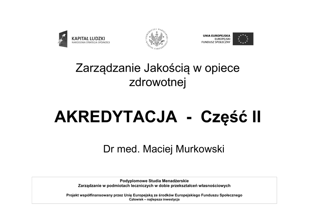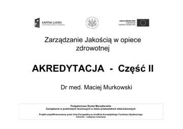 Zarządzanie Jakością w opiece zdrowotnej AKREDYTACJA - Część II Dr med. Maciej Murkowski Podyplomowe Studia Menadżerskie Zarządzanie w podmiotach leczniczych w dobie przekształceń własnościowych Projekt współfinansowany przez Unię Europejską ze środków Europejskiego Funduszu Społecznego Człowiek – najlepsza inwestycja AKREDYTACJA Definicja zgodna z zapisami Ustawy z dnia 6 listopada 2008r. o akredytacji w ochronie zdrowia (Dz. U. Nr 52 , poz. 418 z dnia 31 marca 2009r.): „Akredytacja ma na celu potwierdzenie spełnienia przez podmiot udzielający świadczeń zdrowotnych.. standardów akredytacyjnych w zakresie udzielania świadczeń zdrowotnych oraz funkcjonowania tego podmiotu”. I dalej:.. „Opracowane przez Ośrodek Akredytacyjny i przyjęte przez Radę Akredytacyjną standardy przedstawiane są do zatwierdzenia Ministrowi Zdrowia a następnie publikowane są w Dzienniku Urzędowym Ministra Zdrowia” I dalej:.. ”Akredytacji na okres 3 lat udziela Minister Zdrowia w formie certyfikatu akredytacyjnego, na podstawie rekomendacji Rady, po przeprowadzeniu procedury oceniającej podmiot udzielający świadczeń zdrowotnych”. Podmiot udzielający świadczeń zdrowotnych wnosi opłatę za przeprowadzenie procedury oceniającej na rachunek bankowy Ośrodka Akredytacji. Opłata (w przypadku szpitala powyżej 800 łóżek) nie może przekraczać piętnastokrotności przeciętnego miesięcznego wynagrodzenia w sektorze przedsiębiorstw, włącznie z wypłatami z zysku, w pierwszym kwartale poprzedniego roku. Wg. Niżankowskiego: akredytacja to system dobrowolnej, zewnętrznej i bezpośredniej oceny, mający na celu zapewnienie dobrego poziomu świadczeń i wskazanie, które placówki taki poziom gwarantują. I dalej: „ polega on na udzielaniu przez odpowiednią, najczęściej niezależną instytucję tzw. „akredytacji” tym szpitalom, które spełniają wcześniej określone kryteria i które wystąpią o nią dobrowolnie. Decyzja akredytacyjna administracyjnej”. nie ma charakteru decyzji Podstawowe założenia programu akredytacji: - cel edukacyjny, • oparcie o standardy, • postępowanie zgodne z procedurą, • jawność i równość zasad oceniania i podejmowania decyzji • dobrowolność Wybrane zalety i korzyści akredytacji: •stymulacja poprawy jakości opieki medycznej, •zwiększenie zaufania społeczeństwa do szpitala, •wspieranie edukacji personelu, •pomoc w pozyskaniu dodatkowych źródeł finansowania, •identyfikacja szpitali najlepszych w celu popularyzacji dobrych wzorów, •redukcja kosztów, zwiększenie efektywności, * aktywizacja działania personelu i rozwijanie inicjatyw, Struktura Programu Akredytacji: * Rada Akredytacyjna - organ opracowujący kierunki polityki akredytacyjnej, opiniujący projekty standardów i przygotowujący projekty decyzji akredytacyjnych (w tym warunkowych). Rada składa się z 12 osób powoływanych i odwoływanych przez Ministra Zdrowia. Samorządy zawodowe i organizacje społeczne (których działalność dotyczy poprawy jakości w opiece zdrowotnej) delegują 8 osób, po jednym kandydacie deleguje MON i MSWiA. Kadencja członków Rady trwa 4 lata. * Ośrodek Akredytacyjny - bezpośrednio zajmujący się prowadzeniem i koordynowaniem wizyt akredytacyjnych, przygotowuje projekty standardów i decyzji akredytacyjnej. Każdy standard, (podstawa: Rozporządzenie Ministra Zdrowia z 31 sierpnia 2009r w sprawie procedury oceniającej spełnianie przez podmiot udzielający świadczeń zdrowotnych standardów akredytacyjnych oraz wysokości opłat za jej przeprowadzenie (Dz. Ustaw z 2009, nr 150, poz. 1216) - posiada wagę w postaci przypisanej mu liczby, która kwalifikuje go do określonej grupy ze względu na jego wpływ na bezpieczeństwo pacjenta i personelu. Ustalone zostały następujące wagi: -1,0 dla standardów akredytacyjnych istotnych dla bezpieczeństwa pacjenta i personelu, -0,75 dla standardów istotnych dla bezpieczeństwa ale trudnych aktualnie do wprowadzenia -0,5 dla standardów związanych z opisem procedur i postępowania -0,25 dla standardów nie mających istotnego wpływu na bezpieczeństwo pacjenta i personelu. Każdy standard akredytacyjny następującej skali punktowej: oceniany jest wg. - 1pkt. – nie spełnia wymagań, - 3 pkt. - spełnia wymagania częściowo, - 5 pkt. - spełnia wymagania Ocena punktowa standardu akredytacyjnego polega na pomnożeniu wagi standardu akredytacyjnego przez ocenę uzyskaną w skali punktowej. Do uzyskania akredytacji niezbędne jest uzyskanie co najmniej 75% możliwej do uzyskania oceny punktów. Zgodnie z zapisami art.3 pkt. 1 „Ustawy o akredytacji w ochronie zdrowia „ podmiot udzielający świadczeń zdrowotnych może wystąpić do ministra zdrowia (za pośrednictwem ośrodka akredytacyjnego), z wnioskiem o udzielenie akredytacji. Wniosek zawiera: •nazwę podmiotu udzielającego świadczeń zdrowotnych, ubiegającego się o udzielenie akredytacji •siedzibę albo adres podmiotu, o którym mowa w pkt.1 •informacje o rodzaju i zakresie udzielanych świadczeń zdrowotnych •informację o strukturze świadczeń zdrowotnych organizacyjnej podmiotu udzielającego •imię i nazwisko osoby odpowiedzialnej za przygotowanie podmiotu udzielającego świadczeń zdrowotnych do procedury oceniającej Narzędzia, przy pomocy których jest być mierzona jakość, określane są jako "kryteria". Kryteria muszą być konkretne i wymierne, tj. dające się wyrazić liczbowo, istotne (dla analizowanej dziedziny i celu), oraz zrozumiałe (dla osób trzecich). Przykładowe kryteria: * * * * * * * * * * czas przebywania pacjenta w szpitalu w dniach, rodzaj i ilość badań laboratoryjnych, ilość i rodzaj czynności przedoperacyjnych, procentowy wskaźnik pacjentów z odleżynami, procent infekcji wewnątrzszpitalnych, czas oczekiwania pacjenta na przyjęcie w poradni przyszpitalnej, zgodność diagnozy w momencie przyjęcia i wypisania, ilość skarg 