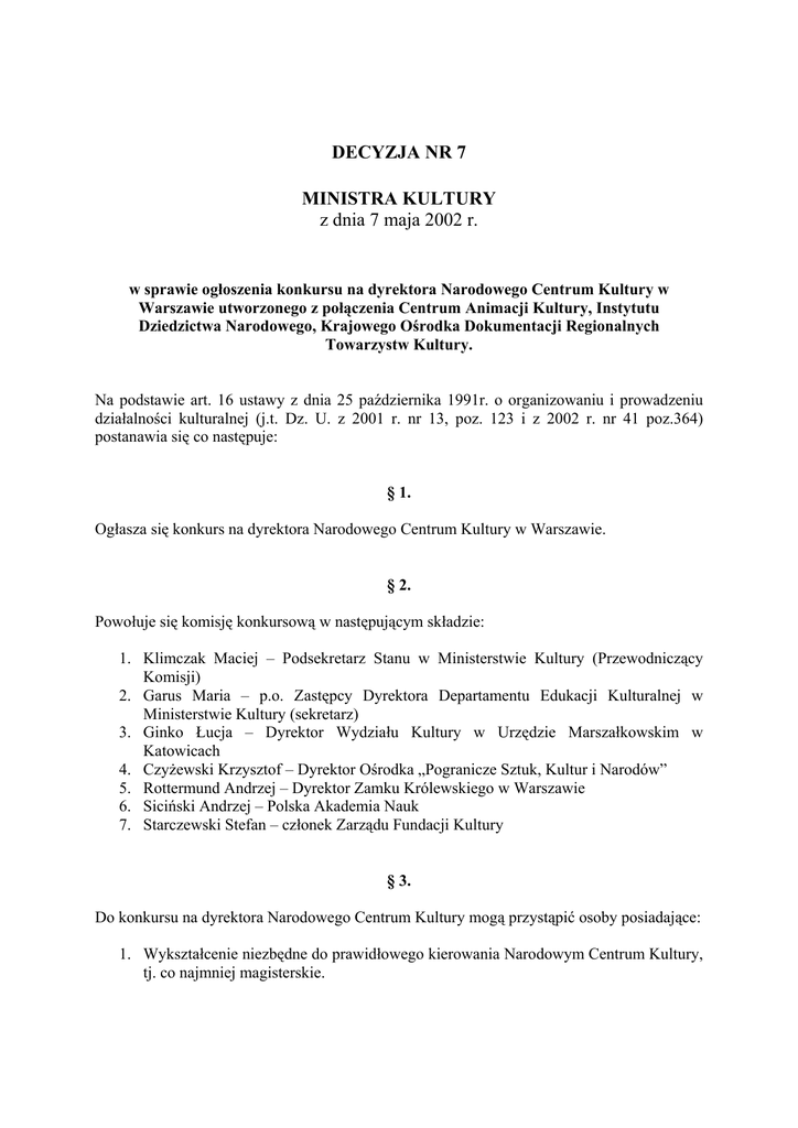 DECYZJA NR 7 MINISTRA KULTURY z dnia 7 maja 2002 r. w sprawie ogłoszenia konkursu na dyrektora Narodowego Centrum Kultury w Warszawie utworzonego z połączenia Centrum Animacji Kultury, Instytutu Dziedzictwa Narodowego, Krajowego Ośrodka Dokumentacji Regionalnych Towarzystw Kultury. Na podstawie art. 16 ustawy z dnia 25 października 1991r. o organizowaniu i prowadzeniu działalności kulturalnej (j.t. Dz. U. z 2001 r. nr 13, poz. 123 i z 2002 r. nr 41 poz.364) postanawia się co następuje: § 1. Ogłasza się konkurs na dyrektora Narodowego Centrum Kultury w Warszawie. § 2. Powołuje się komisję konkursową w następującym składzie: 1. Klimczak Maciej – Podsekretarz Stanu w Ministerstwie Kultury (Przewodniczący Komisji) 2. Garus Maria – p.o. Zastępcy Dyrektora Departamentu Edukacji Kulturalnej w Ministerstwie Kultury (sekretarz) 3. Ginko Łucja – Dyrektor Wydziału Kultury w Urzędzie Marszałkowskim w Katowicach 4. Czyżewski Krzysztof – Dyrektor Ośrodka „Pogranicze Sztuk, Kultur i Narodów” 5. Rottermund Andrzej – Dyrektor Zamku Królewskiego w Warszawie 6. Siciński Andrzej – Polska Akademia Nauk 7. Starczewski Stefan – członek Zarządu Fundacji Kultury § 3. Do konkursu na dyrektora Narodowego Centrum Kultury mogą przystąpić osoby posiadające: 1. Wykształcenie niezbędne do prawidłowego kierowania Narodowym Centrum Kultury, tj. co najmniej magisterskie. 2. Udokumentowany co najmniej trzyletni staż na stanowiskach kierowniczych, ze szczególnym uwzględnieniem instytucji kultury. 3. Udokumentowane doświadczenie w opracowywaniu lub realizacji projektów kulturalnych, finansowanych ze źródeł pozabudżetowych, w tym funduszy Unii Europejskiej. 4. Biegła znajomość co najmniej jednego języka obcego. 5. Dobry stan zdrowia, poświadczony zaświadczeniem lekarskim. § 4. 1. Komisja konkursowa działa w następującym trybie: 1/ na podstawie dokumentów komisja stwierdza, czy kandydat spełnia warunki, oraz decyduje o dopuszczeniu go do konkursu, 2/ w razie odmowy przez komisję dopuszczenia kandydata do konkursu, kandydat może w terminie 3 dni zwrócić się do Ministra Kultury o rozstrzygnięcie zasadności odmowy; do czasu rozstrzygnięcia zasadności odmowy komisja zawiesza postępowanie konkursowe, 3/ po zakończeniu konkursu komisja w tajnym głosowaniu wyłania kandydata lub kandydatów na dyrektora, 4/ w razie stwierdzenia przydatności więcej niż jednego kandydata na dyrektora, komisja ustala kolejność kandydatów , 5/ z czynności komisji sporządza się protokół, 6/ komisja przekazuje wyniki konkursu wraz z jego dokumentacją Ministrowi Kultury, 7/ w razie stwierdzenia nieprzydatności na stanowisko dyrektora wszystkich kandydatów, komisja może zwrócić się do Ministra Kultury o ponowne ogłoszenie konkursu. 2. Komisja działa na podstawie ustalonego przez siebie na pierwszym posiedzeniu regulaminu. § 5. Postępowanie konkursowe rozpoczyna się z dniem wejścia w życie niniejszej decyzji. § 6. Tekst ogłoszenia o konkursie, stanowiący załącznik do decyzji, przekazuje się do publikacji w dwóch dziennikach o zasięgu ogólnokrajowym. § 7. Obsługę komisji konkursowej, niezbędne warunki i środki finansowe związane z postępowaniem konkursowym oraz działalnością komisji konkursowej zapewnia Departament Edukacji Kulturalnej w Ministerstwie Kultury. § 8. Komisja konkursowa ulega rozwiązaniu, a postępowanie konkursowe zostaje zamknięte z dniem powołania dyrektora Narodowego Centrum Kultury. § 9. Decyzja wchodzi w życie z dniem podpisania. MINISTER KULTURY Andrzej Celiński Załącznik do decyzji nr 7 Ministra Kultury z dnia 7 maja 2002 r. OGŁOSZENIE Minister Kultury na podstawie Decyzji nr 7 z dnia 7 maja 2002 roku ogłasza konkurs na dyrektora Narodowego Centrum Kultury w Warszawie utworzonego z połączenia Centrum Animacji Kultury, Instytutu Dziedzictwa Narodowego, Krajowego Ośrodka Dokumentacji Regionalnych Towarzystw Kultury. Kandydaci przystępujący do konkursu powinni posiadać: 1. Wykształcenie niezbędne do prawidłowego kierowania Narodowym Centrum Kultury, tj. co najmniej magisterskie. 2. Udokumentowany co najmniej trzyletni staż na stanowiskach kierowniczych, ze szczególnym uwzględnieniem instytucji kultury. 3. Udokumentowane doświadczenie w opracowywaniu lub realizacji projektów kulturalnych, finansowanych ze źródeł pozabudżetowych, w tym funduszy Unii Europejskiej. 4. Biegła znajomość co najmniej jednego języka obcego. 5. Dobry stan zdrowia, poświadczony zaświadczeniem lekarskim. Wnioski kandydatów powinny zawierać: 1. Podpisaną deklarację przystąpienia do konkursu. 2. Pisemną koncepcję funkcjonowania Narodowego Centrum Kultury, opracowana przez osobę przystępującą do konkursu. 3. Kopię dyplomu potwierdzającą uzyskanie wykształcenia na poziomie, co najmniej wyższym magisterskim oraz kopie dokumentów świadczących o dodatkowych kwalifikacjach jak np. ukończone studia podyplomowe, odbyte staże zagraniczne oraz praktyki administracyjne. 4. Oświadczenie o spełnianiu wymogów udziału w konkursie z podaniem informacji o dotychczasowym przebiegu pracy zawodowej, w tym o zakresie obowiązków związanych z zajmowanymi stanowiskami i pełnionymi funkcjami. 5. Aktualne świadectwo zdrowia. 6. Kwestionariusz osobowy. Powyższe dokumenty należy składać w Ministerstwie Kultury – Departament Edukacji Kulturalnej ul. Krakowskie Przedmieście15/17, 00-071 Warszawa pokój 101 w terminie do 30 maja 2002 roku do godziny 14:00 w zaklejonej kopercie z napisem „Konkurs na stanowisko Dyrektora Narodowego Centrum Kultury”. Informację o konkursie udziela Departament Edukacji Kulturalnej tel: 826-23-26, 826-17-62 Rozstrzygnięcie konkursu nastąpi w dniu 16 czerwca 2002 roku.