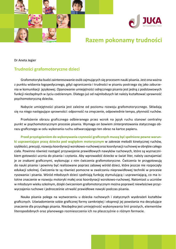 Razem pokonamy trudności Dr Aneta Jegier Trudności grafomotoryczne dzieci Grafomotoryka budzi zainteresowanie osób zajmujących się procesem nauki pisania. Jest ona ważna z punktu widzenia logopedycznego, gdyż ograniczenia i trudności w pisaniu postrzega się jako zaburzenia w komunikacji językowej. Opanowanie umiejętności odręcznego pisania jest jedną z podstawowych funkcji niezbędnych w życiu codziennym. Dlatego już od najmłodszych lat należy kształtować sprawność psychomotoryczną dziecka. Nabycie umiejętności pisania jest zależne od poziomu rozwoju grafomotorycznego. Składają się na niego następujące sprawności: odporność na zmęczenie, odpowiednie tempo, płynność ruchów. Przełożenie obrazu graficznego odbieranego przez wzrok na język ruchu stanowi centralny punkt w psychomotorycznym procesie pisania. Wymaga on bowiem zinterpretowania statycznego obrazu graficznego w celu wykonania ruchu odtwarzającego ten obraz na kartce papieru. Przed przystąpieniem do wykonywania czynności graficznych muszą być spełnione pewne warunki usprawniające pracę dziecka pod względem motorycznym w zakresie melodii kinetycznej ruchów, szybkości, precyzji, rozwoju koordynacji wzrokowo-ruchowej oraz koordynacji ruchowej w obrębie całego ciała. Powinno również nastąpić przyswojenie prawidłowych nawyków ruchowych, które są wyznacznikiem gotowości ucznia do pisania i czytania. Aby wprowadzić dziecko w świat liter, należy zaznajamiać je ze znakami graficznymi, wykonując z nim ćwiczenia grafomotoryczne. Ćwiczenia te przygotowują do nauki pisania i powinny być realizowane poprzez zabawę wśród dzieci, które jeszcze nie rozpoczęły edukacji szkolnej. Ćwiczenia te są również pomocne w zwalczaniu nieprawidłowej techniki w procesie rysowania i pisania. Wśród młodszych dzieci spełniają funkcję stymulującą i usprawniającą, co ma istotne znaczenie w rozwoju motoryki małej oraz koordynacji wzrokowo-ruchowej. Natomiast u uczniów w młodszym wieku szkolnym, dzięki ćwiczeniom grafomotorycznym można poprawić niewłaściwe przyzwyczajenia ruchowe i jednocześnie utrwalić prawidłowe nawyki podczas pisania. Nauka pisania polega na wytworzeniu u dziecka ruchowych i statycznych wyobrażeń kształtów graficznych. Uświadomienie sobie graficznej formy zamkniętej i ekspresji jej powstania ma decydujące znaczenie dla przyszłego pisania. Niezbędna jest umiejętność wykonywania linii prostych, elementów literopodobnych oraz planowego rozmieszczenia ich na płaszczyźnie o różnym formacie. Razem pokonamy trudności Przy zaburzeniach technicznej strony wykonywania czynności graficznych może dojść do zniekształcenia pisma lub rysunku. W konsekwencji dziecko może się zniechęcić do wykonywania czynności graficznych takich, jak pisanie, rysowanie czy malowanie. Wtórnym objawem tej sytuacji będzie brak motywacji i słaba odporność emocjonalna, natomiast pierwotnymi objawami będą zaburzenia motoryczne oraz nieprawidłowe współdziałanie oka i ręki. Aby zapobiegać takim trudnościom, wskazane jest wykonywanie przez dziecko szeregu ćwiczeń grafomotorycznych usprawniających czynności ruchowe rąk oraz koordynację wzrokowo-ruchową. Prekursorką większości ćwiczeń grafomotorycznych przeznaczonych dla dzieci rozpoczynających naukę pisania była Hana Tymichova. Zaproponowane przez nią ćwiczenia są szczególnie polecane dla uczniów, którzy przyjmują nieprawidłową postawę podczas wykonywania czynności graficznych (np. zbyt niskie ułożenie głowy, skrzywione plecy) i u których występuje niepoprawny sposób trzymania przyrządu pisarskiego. Ćwiczenia poprawiające stan graficzny pisma powinny wykonywać także dzieci, które podczas rysowania i pisania mają nieprawidłowe ułożenie ręki i palców oraz ci uczniowie, którzy piszą w wolnym tempie lub są leworęczni. Będą również wskazane dla tych dzieci, które szybko się męczą podczas pisania i rysowania, a jakość ich rysunków jest nieadekwatna do ich wieku. Podstawą metody zaproponowanej przez H. Tymichovą jest założenie, które polega na uświadomieniu sobie, że ucisk, dotyk, ból, temperatura, zmiana położenia ciała (ruch rąk, nóg, skręt szyi, tułowia) wynika z funkcji, jaką pełnią analizatory znajdujące się w skórze, mięśniach, stawach i ścięgnach człowieka. Czynność pisania jest możliwa dzięki odpowiedniej koordynacji analizatorów ruchu, wzroku i dotyku. Rozwój tej współzależności odbywa się już we wczesnym dzieciństwie i ma podłoże biologiczne oraz środowiskowo-społeczne. Głównym celem ćwiczeń grafomotorycznych jest poprawa sprawności manualnej, natomiast do celów pośrednich należą: kształtowanie orientacji wzrokowo-ruchowej, eliminacja nadmiernego pobudzenia ruchowego oraz usprawnienie koncentracji uwagi. Opracowane przez H. Tymichovą ćwiczenia sprawności manualnej zostały podzielone na trzy zestawy. Autorka zaleca, aby ćwiczenia grafomotorycz-ne wykonywać w czterech pozycjach. W postawie stojącej, gdzie wzór zawieszony jest w płaszczyźnie pionowej, w pozycji stojącej przy wzorze ułożonym w płaszczyźnie poziomej, siedząc z łokciem uniesionym do góry oraz w pozycji siedzącej, gdzie przedramię opiera się o blat stołu. Razem pokonamy trudności Dzieci ze słabo rozwiniętą sprawnością manualną mogą mieć problemy z prawidłowym utrzymaniem ołówka czy długopisu. Zbyt mocne napięcie mięśniowe jest powodem usztywnienia palców rąk, przez co dziecko nie jest w stanie prawidłowo utrzymać narzędzia. W przypadku, kiedy napięcie mięśni jest za słabe, palce nie mogą utrzymać ołówka i często wypada on z rąk. Podobna sytuacja ma miejsce, gdy dziecko chce wykonać czynności wymagające użycia palca wskazującego i kciuka, np. przy nawlekaniu korali. Dlatego początkowo należy stosować ćwiczenia bez wykorzystania przyborów, a następnie przejść 