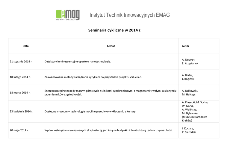 Instytut Technik Innowacyjnych EMAG Seminaria cykliczne w 2014 r. Data Temat Autor 21 stycznia 2014 r. Detektory luminescencyjne oparte o nanotechnologie. A. Nowrot, Z. Krzystanek 18 lutego 2014 r. Zaawansowane metody zarządzania ryzykiem na przykładzie projektu ValueSec. A. Białas, J. Bagiński 18 marca 2014 r. Energooszczędne napędy maszyn górniczych z silnikami synchronicznymi z magnesami trwałymi zasilanymi z przemienników częstotliwości. A. Dzikowski, M. Hefczyc 23 kwietnia 2014 r. Dostępne muzeum – technologie mobilne przeciwko wykluczeniu z kultury. A. Piasecki, M. Socha, W. Górka, A. Wolińska, M. Dylewska (Muzeum Narodowe Kraków) 20 maja 2014 r. Wpływ wstrząsów wywoływanych eksploatacją górniczą na budynki i infrastrukturę techniczną oraz ludzi. I. Kuciara, P. Sierodzki 26 czerwca 2014 r. Nowe rozwiązania w dziedzinie sterowania napędów górniczych wentylatorów lutniowych. A. Kozłowski, J. Brol, T. Gąsior 23 września 2014 r. Fluorescencja rentgenowska – nowe możliwości pomiarowe. W. Sobierajski, M. Kryca 21 października 2014 r. Nowe rozwiązanie pyłomierza stacjonarnego Pł-3 i czujnika parametrów odmetanowania ZCO. M. Małachowski, A. Broja, D. Felka System radiowego sterowania RSKID dla kombajnu chodnikowego typu KID-220MP. A. Halama, J. Jagła, P. Loska, P. Szymała 18 listopada 2014 r. Seminaria dedykowane w 2014 r. Data Temat 15 kwietnia 2014 r. Fałszywi przyjaciele i inne pułapki pisania po angielsku. Organizatorzy: Instytut Technik Innowacyjnych EMAG 30 maja 2014 r. Działalność Instytutu Technik Innowacyjnych EMAG na rzecz bezpieczeństwa pracy w zakładach górniczych. Organizatorzy: Instytut Technik Innowacyjnych EMAG, Politechnika Śląska Monitorowanie zagrożeń naturalnych – historia i czasy współczesne. Pomiary parametrów fizycznych powietrza. Pył węglowy: definicja – zagrożenia – pomiary. Systemy monitoringu zagrożeń sejsmicznych w kopalniach węgla kamiennego. Autor B. Filsiuk A. Dylong A. Broja D. Felka, M. Małachowski M. Mokrosz 4 marca 2014 r. Wybrane zagadnienia z zakresu możliwości współpracy Instytutu EMAG z Ministerstwem Nauki i Technologii w Wietnamie oraz Akademią Nauki i Technologii w Hanoi”. Organizatorzy: Instytut Technik Innowacyjnych EMAG 5 lutego 2014 r. Spotkanie informacyjne w sprawie segmentu projektowanej platformy informacyjnej Śląskiego Klastra ICT dotyczącego rozwoju regionalnego systemu transportowego oraz powiązanej z nią konferencji. Organizatorzy: Instytut Technik Innowacyjnych EMAG, Śląski Klaster ICT 20 listopada 2014 r. P. Wojtas Seminarium EMC – kompatybilność elektromagnetyczna. Organizatorzy: Instytut Technik Innowacyjnych EMAG, Würth Elektronik Laboratorium Badań Kompatybilności Elektromagnetycznej. S. Robak, L. Heliosz, T. Woźnica Laboratorium Wzorcujące. M. Mitas Requirements in EMC Magnetic & Material Basics Transmission Modes & Filter Topologies EMI noise sources. L. Foelkel Filter Design PCB layout recommendations Shielded vs Unshielded Inductor Live EMC demonstration with spectrum analyzer. L. Foelkel AC/DC converter EMI Measurement techniques Design tools. L. Foelkel