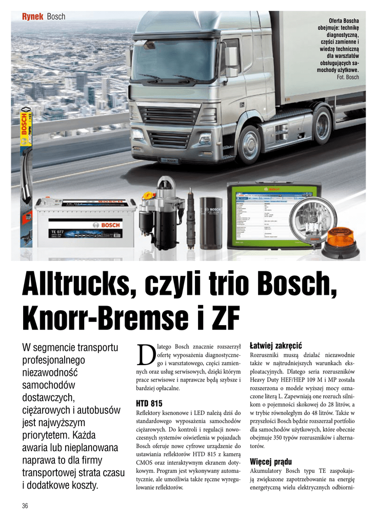 Rynek Bosch Oferta Boscha obejmuje: technikę diagnostyczną, części zamienne i wiedzę techniczną dla warsztatów obsługujących samochody użytkowe. Fot. Bosch Alltrucks, czyli trio Bosch, Knorr-Bremse i ZF W segmencie transportu profesjonalnego niezawodność samochodów dostawczych, ciężarowych i autobusów jest najwyższym priorytetem. Każda awaria lub nieplanowana naprawa to dla firmy transportowej strata czasu i dodatkowe koszty. 36 D latego Bosch znacznie rozszerzył ofertę wyposażenia diagnostycznego i warsztatowego, części zamiennych oraz usług serwisowych, dzięki którym prace serwisowe i naprawcze będą szybsze i bardziej opłacalne. HTD 815 Reflektory ksenonowe i LED należą dziś do standardowego wyposażenia samochodów ciężarowych. Do kontroli i regulacji nowoczesnych systemów oświetlenia w pojazdach Bosch oferuje nowe cyfrowe urządzenie do ustawiania reflektorów HTD 815 z kamerą CMOS oraz interaktywnym ekranem dotykowym. Program jest wykonywany automatycznie, ale umożliwia także ręczne wyregulowanie reflektorów. Łatwiej zakręcić Rozruszniki muszą działać niezawodnie także w najtrudniejszych warunkach eksploatacyjnych. Dlatego seria rozruszników Heavy Duty HEF/HEP 109 M i MP została rozszerzona o modele wyższej mocy oznaczone literą L. Zapewniają one rozruch silnikom o pojemności skokowej do 28 litrów, a w trybie równoległym do 48 litrów. Także w przyszłości Bosch będzie rozszerzał portfolio dla samochodów użytkowych, które obecnie obejmuje 350 typów rozruszników i alternatorów. Więcej prądu Akumulatory Bosch typu TE zaspokajają zwiększone zapotrzebowanie na energię energetyczną wielu elektrycznych odbiorni- ków prądu w samochodach użytkowych, zapewniają energię w czasie długich postojów oraz dobrze znoszą ekstremalne temperatury i drgania. Takie właściwości gwarantuje technologia EFB (Enhanced Flooded Battery). Płyty dodatnie akumulatorów wykonanych w tej technologii są powlekane poliestrem (Polyester Scrim). Dodatkowo stabilizuje to masę czynną płyt, dzięki czemu akumulatory TE są wysoce odporne na cykle ładowania i rozładowania, a także na wstrząsy. Opatentowana metoda wykonania kratki PowerFrame® chroni przed korozją i zapewnia optymalny przepływ prądu oraz długą żywotność. Gwarantuje także stałą, wysoką moc rozruchową i wyraźnie niższy stopień samorozładowania. Akumulatory Bosch TE są bezobsługowe i szczelne. Bosch Light-Star Reflektory świateł drogowych Light-Star są przeznaczone także do stosowania w trudnych warunkach oraz w segmencie off–road. Projektowany komputerowo odbłyśnik FF (Free Shape) kieruje silny strumień światła w przód przy minimalnym stopniu rozpraszania. Nowy reflektor jest dostępny w trzech wersjach: Light-Star Halogen, Light-Star z światłem postojowym w formie pierścienia LED z białą lub niebieską szybą oraz LightStar Xenon. Profesjonalny serwis Bosch zoptymalizował tester do diagnostyki sterowników KTS Truck oraz jego oprogramowanie serwisowe Esitronic 2.0 Truck do wymagań warsztatów obsługujących samochody użytkowe. Szerokie pokrycie Akumulatory Bosch typu TE zaspokajają zwiększone zapotrzebowanie na energię energetyczną wielu elektrycznych odbiorników prądu w samochodach użytkowych, zapewniają energię w czasie długich postojów oraz dobrze znoszą ekstremalne temperatury i drgania rynku gwarantują dane z ponad 90 proc. samochodów dostawczych, ciężarowych, przyczep oraz autokarów dostępnych na rynku europejskim. Asortyment nowoczesnych urządzeń diagnostycznych uzupełniają urządzenia do diagnostyki geometrii zawieszenia, testery spalin i diagnoskopy, urządzenia do serwisu klimatyzacji, wyważarki i montażownice kół oraz stanowiska rolkowe do diagnostyki hamulców, także dla dużych samochodów ciężarowych. Szeroka oferta szkoleń serwisowych w zakresie techniki do samochodów użytkowych została jeszcze bardziej rozbudowana. Dodatkową pomoc w razie pytań lub problemów oferują eksperci infolinii technicznej Bosch. Wtryski z oryginalną jakością Bosch projektuje i dostarcza układy wtryskowe do silników Diesla wszystkim liczącym się producentom samochodów użytkowych. Obszerny program części zamiennych zawiera wszystkie ważne komponenty do aktualnie produkowanych układów Common Rail i pompowtryskiwaczy, ale także do klasycznych układów wtryskowych. Niższa emisja Redukcja emisji tlenków azotu (NOx) w silnikach Diesla to główny wymóg normy Bosch zoptymalizował tester do diagnostyki sterowników KTS Truck oraz jego oprogramowanie serwisowe Esitronic 2.0 Truck do wymagań warsztatów obsługujących samochody użytkowe. Szerokie pokrycie rynku gwarantują dane z ponad 90% samochodów dostawczych, ciężarowych, przyczep oraz autokarów dostępnych na rynku europejskim emisyjnej Euro 5. Dla potrzeb montażu fabrycznego Bosch stworzył system oczyszczania spalin Denoxtronic. W zakresie serwisowania i napraw systemów Denoxtronic Bosch oferuje części zamienne, urządzenia diagnostyczne, oprogramowanie serwisowe wraz z instrukcjami napraw oraz szkolenia serwisowe. Opłacalne naprawy Program części regenerowanych Bosch eXchange to niedroga alternatywa w razie konieczności naprawy starszych pojazdów. Części regenerowane są tańsze od nowych produktów. Do samych układów wtryskowych Diesla Bosch oferuje ponad 1000 regenerowanych fabrycznie produktów do wielu samochodów użytkowych, w tym do nowoczesnych, wysokociśnieniowych układów wtryskowych. Nowe koncepcje serwisowe Od początku roku w Niemczech działa nowa koncepcja serwisowa typu Full Service o nazwie „Alltrucks”, firmowana wspólnie przez Bosch, Knorr-Bremse i ZF. Do końca tej dekady planowane jest wprowadzenie koncepcji na terenie całej Europy. Celem jest koncentracja kompetencji oraz oferowanie rozwiązań i usług w segmencie napraw samochodów użytkowych wszystkich marek. Koncepcja skierowana je