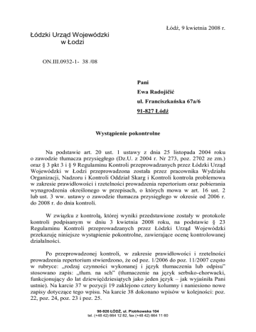 Łódź, 9 kwietnia 2008 r. Łódzki Urząd Wojewódzki w Łodzi ON.III.0932-1- 38 /08 Pani Ewa Radojičić ul. Franciszkańska 67a/6 91-827 Łódź Wystąpienie pokontrolne Na podstawie art. 20 ust. 1 ustawy z dnia 25 listopada 2004 roku o zawodzie tłumacza przysięgłego (Dz.U. z 2004 r. Nr 273, poz. 2702 ze zm.) oraz § 3 pkt 3 i § 9 Regulaminu Kontroli przeprowadzanych przez Łódzki Urząd Wojewódzki w Łodzi przeprowadzona została przez pracownika Wydziału Organizacji, Nadzoru i Kontroli Oddział Skarg i Kontroli kontrola problemowa w zakresie prawidłowości i rzetelności prowadzenia repertorium oraz pobierania wynagrodzenia określonego w przepisach, o których mowa w art. 16 ust. 2 lub ust. 3 ww. ustawy o zawodzie tłumacza przysięgłego w okresie od 2006 r. do 2008 r. do dnia kontroli. W związku z kontrolą, której wyniki przedstawione zostały w protokole kontroli podpisanym w dniu 3 kwietnia 2008 roku, na podstawie § 23 Regulaminu Kontroli przeprowadzanych przez Łódzki Urząd Wojewódzki przekazuję niniejsze wystąpienie pokontrolne, zawierające ocenę kontrolowanej działalności. Po przeprowadzonej kontroli, w zakresie prawidłowości i rzetelności prowadzenia repertorium stwierdzono, że od poz. 1/2006 do poz. 11/2007 często w rubryce: „rodzaj czynności wykonanej i język tłumaczenia lub odpisu” stosowano zapis: „tłum. na sch” (tłumaczenie na język serbsko-chorwacki, funkcjonujący do lat dziewięćdziesiątych jako jeden język – jak wyjaśniła Pani ustnie). Na karcie 37 w pozycji 19 zaklejono cztery kolumny i naniesiono nowe zapisy dotyczące tego wpisu. Na karcie 38 dokonano wpisów w kolejności: poz. 22, poz. 24, poz. 23 i poz. 25. 90-926 ŁÓDŹ, ul. Piotrkowska 104 tel. (+48 42) 664 12 82, fax (+48 42) 664 11 60 Na okazanej kopii poświadczonego tłumaczenia z poz. 45/2007 wymieniona została pozycja, pod którą tłumaczenie jest odnotowane w repertorium, a także zapisano: „stwierdzam zgodność powyższego tłumaczenia z przedstawionym oryginałem (kserokopia) w j. chorwackim”. Na podstawie takiego zapisu nie można jednoznacznie stwierdzić, czy tłumaczenie sporządzono z oryginału, czy z kopii. W przypadku wykonania tłumaczenia z kopii należy stwierdzić, czy kopia jest poświadczona i przez kogo. W zakresie pobierania wynagrodzenia za czynności tłumacza przysięgłego wykonane na żądanie sądu, prokuratora, Policji oraz organów administracji publicznej stwierdzono: w poz. 12 z dnia 25.03.07 r. język, w którym dokument sporządzono: „chorw.”, oznaczenie czynności: „na pl”, 5 stron, 1 egzemplarz, pobrane wynagrodzenie: 112,25, rozporządzenie Ministra Sprawiedliwości z dnia 24 stycznia 2005 r. w sprawie wynagrodzenia za czynności tłumacza przysięgłego (Dz. U. z 2005 r. Nr 15, poz. 131 ze zm.) przewiduje: 24,77 zł x 5 stron = 123,85 zł, w poz. 13 z dnia 25.03.07 r. język, w którym dokument sporządzono: „chorw.”, oznaczenie czynności: „na pl”, 3 strony, 1 egzemplarz, pobrane wynagrodzenie: 68,31, ww. rozporządzenie Ministra Sprawiedliwości przewiduje: 24,77 zł x 3 strony = 74,71 zł, w poz. 45 z dnia 08.11.07 r. język, w którym dokument sporządzono: „chorw.”, oznaczenie czynności: „na polski”, 2 strony, 1 egzemplarz, pobrane wynagrodzenie: 70,76. ww. rozporządzenie Ministra Sprawiedliwości przewiduje: 24,77 zł x 2 strony = 49,54 zł. Mając na względzie dokonane ustalenia proszę Panią: - o dokonywanie jednoznacznych wpisów w repertorium wymaganych przepisem art. 17 ust. 1 ww. ustawy o zawodzie tłumacza przysięgłego, adekwatnie do wykonanej czynności oraz uwzględnienie prawidłowego określenia języków obcych, do których tłumacz przysięgły posiada uprawnienia, - o stosowanie na poświadczonych tłumaczeniach oraz poświadczonych odpisach pism wpisów wynikających z art. 18 ust. 2 ustawy o zawodzie tłumacza przysięgłego, adekwatnie do rodzaju tłumaczonego dokumentu, - o pobieranie wynagrodzenia za czynności tłumacza przysięgłego, wykonane na żądanie sądu, prokuratora, Policji oraz organów administracji publicznej zgodnie z ww. rozporządzeniem Ministra Sprawiedliwości. Jednocześnie oczekuję w terminie 30 dni od daty otrzymania niniejszego wystąpienia pokontrolnego informacji o sposobie wykonania powyższych uwag i wniosków, bądź o podjętych działaniach lub o przyczynach niepodjęcia działań mających na celu eliminację stwierdzonych w toku kontroli uchybień. Z up. Wojewody Łódzkiego /-/ Elżbieta Staszyńska Dyrektor Wydziału Organizacji, Nadzoru i Kontroli