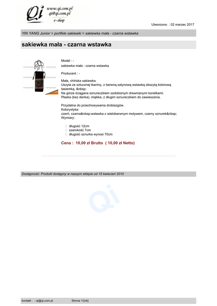 Utworzono : 02 marzec 2017 YIN YANG Junior > portfele sakiewki > sakiewka mała - czarna wstawka sakiewka mała - czarna wstawka Model : sakiewka mała - czarna wstawka Producent : Mała, chińska sakiewka. Uszyta ze sztucznej tkaniny, z barwną satynową wstawką obszytą kolorową tasiemką. Na górze ściągana sznureczkiem ozdobionym drewnianymi koralikami. Płaska (bez denka), miękka, z długim sznureczkiem do zawieszania. Przydatna do przechowywania drobiazgów. Kolorystyka: czerń, czarna wstawka z wielobarwnym motywem, czarny sznurek Wymiary: � długość 12cm � szerokość 7cm � długość sznurka wynosi 70cm Cena : 10,00 zł Brutto ( 10,00 zł Netto) Dostępność: Produkt dostępny w naszym sklepie od 15 kwiecień 2010 i Q kontakt : - [email protected] Strona 1/{nb}