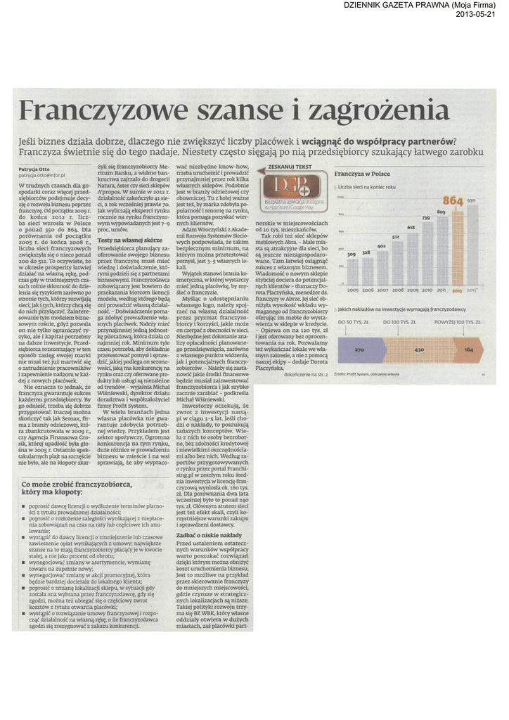 DZIENNIK GAZETA PRAWNA (Moja Firma) 2013-05-21 Franczyzowe szanse i zagrożenia Jeśli biznes działa dobrze, dlaczego nie zwiększyć liczby placówek i wciągnąć do współpracy partnerów? Franczyza świetnie się do tego nadaje. Niestety często sięgają po nią przedsiębiorcy szukający łatwego zarobku Patrycja Otto [email protected] żyli się franczyzobiorcy Me ritum Banku, a widmo ban kructwa zajrzało do drogerii Natura, Aster czy sieci sklepów A'propos. W sumie w 2012 r. działalność zakończyło 41 sie ci, a rok wcześniej prawie 70. Jak wyliczają eksperci rynku rocznie na rynku franczyzowym wypowiadanych jest 7-9 proc. umów. W trudnych czasach dla go spodarki coraz więcej przed siębiorców podejmuje decy zję o rozwoju biznesu poprzez franczyzę. Od początku 2009 r. do końca 2012 r. licz ba sieci wzrosła w Polsce o ponad 350 do 864. Dla porównania od początku 2005 r. do końca 2008 r., Testy na własnej skórze liczba sieci franczyzowych Przedsiębiorca planujący za zwiększyła się o nieco ponad oferowanie swojego biznesu 200 do 512. To oczywiste, że przez franczyzę musi mieć w okresie prosperity łatwiej wiedzę i doświadczenie, któ działać na własną rękę, pod rymi podzieli się z partnerami czas gdy w trudniejszych cza biznesowymi. Franczyzodawca sach rośnie skłonność do dzie zobowiązany jest bowiem do lenia się ryzykiem zarówno po przekazania biorcom licencji stronie tych, którzy rozwijają modelu, według którego będą sieci, jak i tych, którzy chcą się oni prowadzić własną działal do nich przyłączyć. Zaintere ność. - Doświadczenie poma sowanie tym modelem bizne ga zdobyć prowadzenie wła sowym rośnie, gdyż pozwala snych placówek. Należy mieć on nie tylko ograniczyć ry przynajmniej jedną jednost zyko, ale i kapitał potrzebny kę pilotażową, która działa co na dalsze inwestycje. Przed najmniej rok. Minimum tyle siębiorca rozszerzający w ten czasu potrzeba, aby dokładnie sposób zasięg swojej marki przetestować pomysł i spraw nie musi też już martwić się dzić, jakiej podlega on sezono o zatrudnienie pracowników wości, jaką ma konkurengę na i zapewnienie nadzoru w każ rynku oraz czy oferowane pro dej z nowych placówek. dukty lub usługi są niezależne Nie oznacza to jednak, że od trendów - wyjaśnia Michał franczyza gwarantuje sukces Wiśniewski, dyrektor działu każdemu przedsiębiorcy. By doradztwa i współzałożyciel go odnieść, trzeba się dobrze firmy Profit System. przygotować. Inaczej można skończyć tak jak Semax, fir ma z branży odzieżowej, któ ra zbankrutowała w 2009 r., czy Agenga Finansowa Crosik, której upadłość była gło śna w 2005 r. Ostatnio spek takularnych plajt na szczęście nie było, ale na kłopoty skar W wielu branżach jedna własna placówka nie gwa rantuje zdobycia potrzeb nej wiedzy. Przykładem jest sektor spożywczy. Ogromna konkurencja na tym rynku, duże różnice w prowadzeniu biznesu w mieście i na wsi sprawiają, że aby wypraco- Co może zrobić franczyzobiorca, który ma kłopoty: • poprosić dawcę licencji o wydłużenie terminów płatno ści z tytułu prowadzonej działalności; • poprosić o rozłożenie zaległości wynikającej z niepłace nia zobowiązań na czas na raty lub częściowe ich anu lowanie; • wystąpić do dawcy licencji o zmniejszenie lub czasowe zawieszenie opłat wynikających z umowy; największe szanse na to mają franczyzobiorcy płacący je w kwocie stałej, a nie jako procent od obrotu; • wynegocjować zmiany w asortymencie, wymianę towaru na zupełnie nowy; • wynegocjować zmiany w akcji promocyjnej, która będzie bardziej docierała do lokalnego klienta; • poprosić o zmianę lokalizacji sklepu, w sytuacji gdy została ona wybrana przez franczyzodawcę, gdy się zgodzi, można też ubiegać się o częściowy zwrot kosztów z tytułu otwarcia placówki; • wystąpić o rozwiązanie umowy franczyzowej i rozpo cząć działalność na własną rękę, o ile franczyzodawca zgodzi się zrezygnować z zakazu konkurencji. wać niezbędne know-how, trzeba uruchomić i prowadzić przynajmniej przez rok kilka własnych sklepów. Podobnie jest w branży odzieżowej czy obuwniczej. Tu z kolej ważne jest też, by marka zdobyła po pularność i renomę na rynku, która pomaga pozyskać wier nych klientów. Adam Wroczyński z Akade mii Rozwoju Systemów Siecio wych podpowiada, że takim bezpiecznym minimum, na którym można przetestować pomysł, jest 3-5 własnych lo kali. Wyjątek stanowi branża ko smetyczna, w której wystarczy mieć jedną placówkę, by my śleć o franczyzie. Myśląc o udostępnianiu własnego logo, należy spoj rzeć na własną działalność przez pryzmat franczyzo biorcy i korzyści, jakie może on czerpać z obecności w sieci. Niezbędne jest dokonanie ana lizy opłacalności planowane go przedsięwzięcia, zarówno z własnego punktu widzenia, jak i potengalnych franczyzobiorców. - Należy się zasta nowić jakie środki finansowe będzie musiał zainwestować franczyzobiorca i jak szybko zacznie zarabiać - podkreśla Michał Wiśniewski. Inwestorzy oczekują, że zwrot z inwestycji nastą pi w ciągu 3-5 lat. Jeśli cho dzi o nakłady, to poszukują tańszych konceptów. Wie lu z nich to osoby bezrobot ne, bez zdolności kredytowej i niewielkimi oszczędnościa mi albo bez nich. Według ra portów przygotowywanych o rynku przez portal Franchising.pl w zeszłym roku śred nia inwestycja w licencję franczyzową wyniosła ok. 160 tys. zŁ Dla porównania dwa lata wcześniej było to ponad 240 tys. zł. Głównym atutem sieci jest też efekt skali, czyli ko rzystniejsze warunki zakupu i sprawdzeni dostawcy. Zadbać o niskie nakłady Przed ustaleniem ostatecz nych warunków współpracy warto poszukać rozwiązań dzięki którym można obniżyć koszt uruchomienia biznesu. Jest to możliwe na przykład przez skierowanie franczyzy do mniejszych miejscowości, gdzie czy