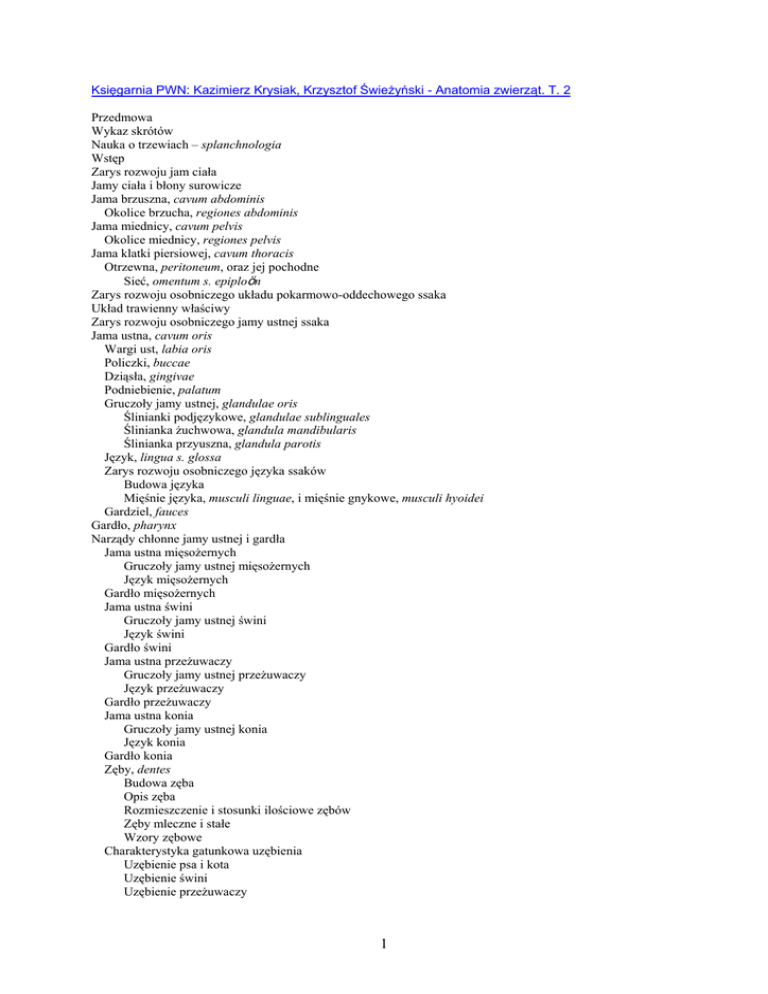 Księgarnia PWN: Kazimierz Krysiak, Krzysztof Świeżyński - Anatomia zwierząt. T. 2 Przedmowa Wykaz skrótów Nauka o trzewiach – splanchnologia Wstęp Zarys rozwoju jam ciała Jamy ciała i błony surowicze Jama brzuszna, cavum abdominis Okolice brzucha, regiones abdominis Jama miednicy, cavum pelvis Okolice miednicy, regiones pelvis Jama klatki piersiowej, cavum thoracis Otrzewna, peritoneum, oraz jej pochodne Sieć, omentum s. epiploön Zarys rozwoju osobniczego układu pokarmowo-oddechowego ssaka Układ trawienny właściwy Zarys rozwoju osobniczego jamy ustnej ssaka Jama ustna, cavum oris Wargi ust, labia oris Policzki, buccae Dziąsła, gingivae Podniebienie, palatum Gruczoły jamy ustnej, glandulae oris Ślinianki podjęzykowe, glandulae sublinguales Ślinianka żuchwowa, glandula mandibularis Ślinianka przyuszna, glandula parotis Język, lingua s. glossa Zarys rozwoju osobniczego języka ssaków Budowa języka Mięśnie języka, musculi linguae, i mięśnie gnykowe, musculi hyoidei Gardziel, fauces Gardło, pharynx Narządy chłonne jamy ustnej i gardła Jama ustna mięsożernych Gruczoły jamy ustnej mięsożernych Język mięsożernych Gardło mięsożernych Jama ustna świni Gruczoły jamy ustnej świni Język świni Gardło świni Jama ustna przeżuwaczy Gruczoły jamy ustnej przeżuwaczy Język przeżuwaczy Gardło przeżuwaczy Jama ustna konia Gruczoły jamy ustnej konia Język konia Gardło konia Zęby, dentes Budowa zęba Opis zęba Rozmieszczenie i stosunki ilościowe zębów Zęby mleczne i stałe Wzory zębowe Charakterystyka gatunkowa uzębienia Uzębienie psa i kota Uzębienie świni Uzębienie przeżuwaczy 1 Uzębienie konia Przewód pokarmowy, canalis alimentarius Przełyk, esophagus Żołądek, ventriculus s. gaster Budowa ściany żołądka Jelito, intestinum Jelito cienkie, intestinum tenue Dwunastnica, duodenum Jelito czcze, jejunum Jelito kręte, ileum Jelito grube, intestinum crassum Jelito ślepe, cecum Okrężnica, colon Odbytnica, rectum Kanał odbytowy, canalis analis Wątroba, hepar s. jecur Pęcherzyk żółciowy, vesica fellea Stosunki otrzewnowe i więzadła wątroby Unaczynienie i unerwienie wątroby Trzustka, pancreas Unaczynienie i unerwienie trzustki Przewód pokarmowy właściwy mięsożernych Przełyk mięsożernych Żołądek mięsożernych Jelito cienkie mięsożernych Dwunastnica mięsożernych Jelito czcze mięsożernych Jelito kręte mięsożernych Jelito grube mięsożernych Jelito ślepe mięsożernych Okrężnica mięsożernych Odbytnica mięsożernych Kanał odbytowy mięsożernych Wątroba mięsożernych Pęcherzyk żółciowy mięsożernych Trzustka mięsożernych Sieć mniejsza mięsożernych Sieć większa mięsożernych Przewód pokarmowy właściwy świni Przełyk świni Żołądek świni Jelito cienkie świni Dwunastnica świni Jelito czcze świni Jelito kręte świni Jelito grube świni Jelito ślepe świni Okrężnica i odbytnica świni Kanał odbytowy świni Skupiska tkanki limfatycznej w jelitach świni Wątroba świni Trzustka świni Przewód pokarmowy właściwy przeżuwaczy Przełyk przeżuwaczy Żołądek przeżuwaczy Żwacz, rumen Czepiec, reticulum Księgi, omasum Trawieniec, abomasum Żołądek przeżuwaczy jako całość 2 Sieć mniejsza i sieć większa przeżuwaczy Jelito cienkie przeżuwaczy Dwunastnica przeżuwaczy Jelito czcze przeżuwaczy Jelito kręte przeżuwaczy Jelito grube przeżuwaczy Jelito ślepe przeżuwaczy Okrężnica przeżuwaczy Odbytnica przeżuwaczy Kanał odbytowy przeżuwaczy Skupiska tkanki limfatycznej w jelitach przeżuwaczy Wątroba przeżuwaczy Trzustka przeżuwaczy Przewód pokarmowy właściwy konia Przełyk konia Żołądek konia Jelito cienkie konia Dwunastnica konia Jelito czcze konia Jelito kręte konia Jelito grube konia Jelito ślepe konia Okrężnica konia Odbytnica konia Kanał odbytowy konia Skupiska tkanki limfatycznej w jelitach konia Wątroba konia Trzustka konia Układ oddechowy Nos, nasus, oraz jama nosowa, cavum nasi Małżowiny nosowe, conchae nasales Zatoki przynosowe, sinus paranasales Zatoka szczękowa, sinus maxillaris Zatoka czołowa, sinus frontalis Zatoka łzowa, sinus lacrimalis Zatoka podniebienna, sinus palatinus Zatoka klinowa, sinus sphenoidalis Krtań, larynx Chrząstki krtani, cartilagines laryngis Chrząstka tarczowata, cartilago thyroidea Chrząstka pierścieniowa, cartilago cricoidea Chrząstki nalewkowate, cartilagines arytaenoideae Chrząstka nagłośniowa, cartilago epiglottica Połączenia chrząstek krtani Mięśnie krtani, musculi laryngis Jama krtani, cavum laryngis Tchawica, trachea, i oskrzela, bronchi Płuca, pulmones Układ oddechowy mięsożernych Nos oraz jama nosowa mięsożernych Małżowiny nosowe mięsożernych Zatoki przynosowe mięsożernych Krtań mięsożernych Połączenie chrząstek, mięśnie oraz jama krtani mięsożernych Tchawica i oskrzela mięsożernych Płuca mięsożernych Układ oddechowy świni Nos oraz jama nosowa świni Małżowiny nosowe świni Zatoki przynosowe świni 3 Krtań świni Połączenia chrząstek, mięśnie oraz jama krtani świni Tchawica i oskrzela świni Płuca świni Układ oddechowy przeżuwaczy Nos oraz jama nosowa przeżuwaczy Małżowiny nosowe przeżuwaczy Zatoki przynosowe przeżuwaczy Krtań przeżuwaczy Połączenia chrząstek, mięśnie oraz jama krtani przeżuwaczy Tchawica i oskrzela przeżuwaczy Płuca przeżuwaczy Układ oddechowy konia Nos oraz jama nosowa konia Małżowiny nosowe konia Zatoki przynosowe konia Krtań konia Połączenia chrząstek, mięśnie oraz jama krtani konia Tchawica i oskrzela konia Płuca konia Układ moczowo-płciowy Narządy moczotwórcze, Organa urinaria Zarys rozwoju narządów moczotwórczych Nerka, ren Naczynia i nerwy nerki Drogi odprowadzające mocz Miedniczka nerkowa, pelvis renalis Moczowód, ureter Pęcherz moczowy, vesica urinaria Cewka moczowa, urethra Narządy moczotwórcze mięsożernych Narządy moczotwórcze świni Narządy moczotwórcze przeżu