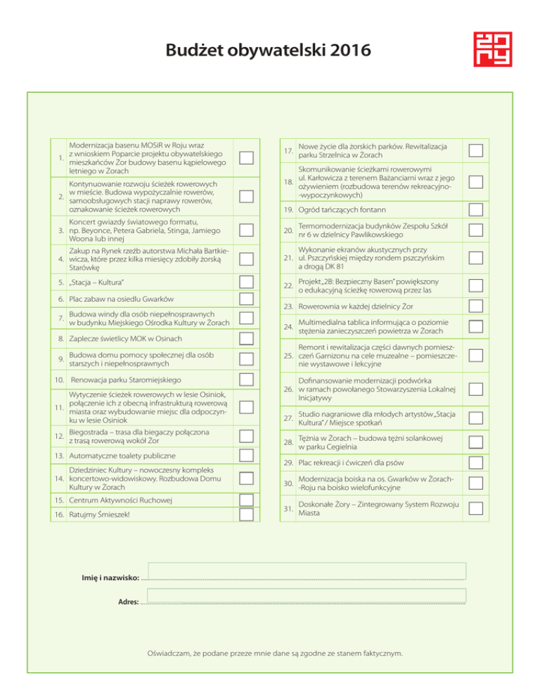 Budżet obywatelski 2016 Modernizacja basenu MOSiR w Roju wraz z wnioskiem Poparcie projektu obywatelskiego 1. mieszkańców Żor budowy basenu kąpielowego letniego w Żorach Kontynuowanie rozwoju ścieżek rowerowych w mieście. Budowa wypożyczalnie rowerów, 2. samoobsługowych stacji naprawy rowerów, oznakowanie ścieżek rowerowych 17. Nowe życie dla żorskich parków. Rewitalizacja parku Strzelnica w Żorach Skomunikowanie ścieżkami rowerowymi ul. Karłowicza z terenem Bażanciarni wraz z jego 18. ożywieniem (rozbudowa terenów rekreacyjno-wypoczynkowych) 19. Ogród tańczących fontann Koncert gwiazdy światowego formatu, 3. np. Beyonce, Petera Gabriela, Stinga, Jamiego Woona lub innej 20. Zakup na Rynek rzeźb autorstwa Michała Bartkie4. wicza, które przez kilka miesięcy zdobiły żorską Starówkę Wykonanie ekranów akustycznych przy 21. ul. Pszczyńskiej między rondem pszczyńskim a drogą DK 81 5. „Stacja – Kultura” 22. 6. Plac zabaw na osiedlu Gwarków Budowa windy dla osób niepełnosprawnych 7. w budynku Miejskiego Ośrodka Kultury w Żorach 8. Zaplecze świetlicy MOK w Osinach Budowa domu pomocy społecznej dla osób 9. starszych i niepełnosprawnych 10. Renowacja parku Staromiejskiego Wytyczenie ścieżek rowerowych w lesie Osiniok, połączenie ich z obecną infrastrukturą rowerową 11. miasta oraz wybudowanie miejsc dla odpoczynku w lesie Osiniok 12. Biegostrada – trasa dla biegaczy połączona z trasą rowerową wokół Żor 13. Automatyczne toalety publiczne Dziedziniec Kultury – nowoczesny kompleks 14. koncertowo-widowiskowy. Rozbudowa Domu Kultury w Żorach 15. Centrum Aktywności Ruchowej 16. Ratujmy Śmieszek! Termomodernizacja budynków Zespołu Szkół nr 6 w dzielnicy Pawlikowskiego Projekt „2B: Bezpieczny Basen” powiększony o edukacyjną ścieżkę rowerową przez las 23. Rowerownia w każdej dzielnicy Żor 24. Multimedialna tablica informująca o poziomie stężenia zanieczyszczeń powietrza w Żorach Remont i rewitalizacja części dawnych pomiesz25. czeń Garnizonu na cele muzealne – pomieszczenie wystawowe i lekcyjne Dofinansowanie modernizacji podwórka 26. w ramach powołanego Stowarzyszenia Lokalnej Inicjatywy 27. Studio nagraniowe dla młodych artystów „Stacja Kultura” / Miejsce spotkań 28. Tężnia w Żorach – budowa tężni solankowej w parku Cegielnia 29. Plac rekreacji i ćwiczeń dla psów 30. Modernizacja boiska na os. Gwarków w Żorach-Roju na boisko wielofunkcyjne 31. Doskonałe Żory – Zintegrowany System Rozwoju Miasta Imię i nazwisko: ................................................................................................................................................................... Adres: ....................................................................................................................................................................................... Oświadczam, że podane przeze mnie dane są zgodne ze stanem faktycznym.