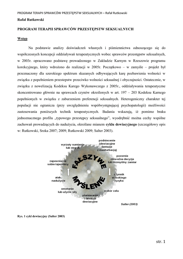 PROGRAM TERAPII SPRAWCÓW PRZESTĘPSTW SEKSUALNYCH – Rafał Rutkowski Rafał Rutkowski PROGRAM TERAPII SPRAWCÓW PRZESTĘPSTW SEKSUALNYCH Wstęp Na podstawie analizy doświadczeń własnych i piśmiennictwa odnoszącego się do współczesnych koncepcji oddziaływań terapeutycznych wobec sprawców przestępstw seksualnych, w 2003r. opracowano podstawę prowadzonego w Zakładzie Karnym w Rzeszowie programu korekcyjnego, który wdrożono do realizacji w 2005r. Początkowo – w zamyśle – projekt był przeznaczony dla szerokiego spektrum skazanych odbywających karę pozbawienia wolności w związku z popełnieniem przestepstw przeciwko wolności seksualnej i obyczajności. Ostatecznie, w związku z nowelizacją Kodeksu Karego Wykonawczego z 2005r., oddziaływania terapeutyczne skoncentrowano głównie na sprawcach czynów określonych w art. 197 – 203 Kodeksu Karnego popełnionych w związku z zaburzeniem preferencji seksualnych. Heterogeniczny charakter tej populacji nie ogranicza (przy uwzględnieniu współwystępującej psychopatologii) możliwości zastosowania poniższych technik terapeutycznych. Badania wskazują, iż pomimo braku jednoznacznego profilu „typowego przestępcy seksualnego”, wyodrębnić można cechy wspólne zachowań prowadzących do nadużycia, określane mianem cyklu dewiacyjnego (szczegółowy opis w: Rutkowski, Sroka 2007; 2009; Rutkowski 2009; Salter 2003). Rys. 1 cykl dewiacyjny (Salter 2003) str. 1 PROGRAM TERAPII SPRAWCÓW PRZESTĘPSTW SEKSUALNYCH – Rafał Rutkowski Elementy składowe cyklu tj.: myśli, błędne przekonania i stereotypy, dewiacyjne fantazje seksualne oraz nastawienia emocjonalne to te aspekty funkcjonowania sprawców, które poddajemy gruntownej analizie i korekcie w trakcie pracy terapeutycznej Koncepcja teoretyczna programu opiera się na teorii społecznego uczenia się (kognitywno – behawioralnej). W myśl tego podejścia oddziaływania korekcyjne koncentrują się głównie na demaskowaniu zniekształceń myślowych (stereotypów i dysfunkcjonalnych przekonań) (Alford, Beck 2005; Beck 2005; Pospiszyl 2005), rozumianych jako: normalny proces psychologiczny, który występuje u wszystkich ludzi, niezależnie od wieku, płci, orientacji seksualnej, rasy czy warstwy społecznej, uruchamiany w celu: zaprzeczenia odpowiedzialności za własne zachowanie; zaprzeczenia negatywnym konsekwencjom własnego zachowania; pozwolenia sobie na kontynuację postępowania, w sposób niewłaściwy; uniknięcie konfrontowania się z bolesnymi emocjami; uniknięcie zmiany (za: Cognitive Distortions; A Practitioner’s Portfolio 1999). W ramach pracy terapeutycznej poddaje się analizie m.in. etapy procesu motywacyjnego prowadzącego do nadużyć, co ma umożliwić sprawcy odpowiednio wczesną interwencję i powstrzymanie się od zachowań dewiacyjnych. To z kolei wypełnia nadrzędny cel realizowanych oddziaływań, którym jest zmniejszenie stopnia wiktymizacji seksualnej poprzez redukcję zjawiska recydywy wśród skazanych z art. 197 – 203 kk. Program Terapii Sprawców Przestępstw Seksualnych składa się z trzech faz podzielonych na moduły, zawierające po kilka sesji grupowych. Zajęcia najczęściej prowadzone są według określonego scenariusza. Podczas sesji uczestnicy określają swoje zachowania przestępcze, biorą udział w treningu empatii względem ofiar i opracowują alternatywne dla dewiacyjnych sposoby zachowań zapobiegających powrotności. W celu zredukowania zaburzeń wynikających z niewłaściwego zrozumienia sytuacji lub jej niewłaściwej oceny, stosuje się techniki poznawczej restrukturyzacji dotychczasowej postaci zachowania. Zajęcia odbywają się dwa razy w tygodniu. Grupa terapeutyczna ma charakter zamknięty, prowadzi ją dwóch terapeutów, a jej liczebność nie przekracza 8 osób. W ramach programu przewidziane są również spotkania indywidualne z psychologiem. Podstawowy cykl terapeutyczny trwa 10 miesięcy (Rutkowski, Sroka 2007; 2008; 2009). str. 2 PROGRAM TERAPII SPRAWCÓW PRZESTĘPSTW SEKSUALNYCH – Rafał Rutkowski Uczestnikami programu realizowanego w niniejszej postaci powinni być sprawcy dorośli, którzy przyznali się do popełnienia przestępstwa seksualnego, wykazujący motywację do terapii, bez masywnych zaburzeń psychicznych, upośledzenia umysłowego, nie uzależnieni od alkoholu lub narkotyków (lub po odbyciu terapii odwykowej). Objęcie oddziaływaniami terapeutycznymi pacjentów młodocianych (Sroka 2009) lub też wykazujących zaburzenia intelektualne, osobowości itp. wymaga przeformułowania założeń i zmiany struktury pracy. Poniżej zaprezentuję najważniejsze metody pracy terapeutycznej wykorzystywane w trakcie dziesięciomiesięcznego cyklu oddziaływań. FAZA I – charakterystyczne wzorce zachowań przestępczych Wprowadzenie i kontrakt terapeutyczny Początkowe sesje programu poświęcone są opracowaniu kontraktu, czyli podstawowych zasad komunikowania się i współpracy w grupie. Z uwagi na wzmożony poziom napięć emocjonalnych towarzyszących uczestnikom, jest to bardzo ważny etap. Pacjenci początkowo obawiają się, że prowadzący będą wymagać od nich wypowiedzi na temat ich życia seksualnego, w tym także opisu zachowań odnoszących się do popełnionych przestępstw. Naturalna reakcja wstydu związana z perspektywą wyjawiania w grupie treści intymnych, często dodatkowo stymulowana jest przez obawy przed oceną ze strony pozostałych pacjentów i ewentualną represją. Wskutek ustalenia jasnych, obowiązujących wszystkich norm i reguł, początkowe silne lęki i opór pacjentów zmniejszają się. Z perspektywy zawiązującej się grupy oraz konieczności stymulowania początkowo niewielkiej otwartości i spójności, istotne jest aby uczestnicy w ramach swobodnej dyskusji uzyskali zgodność co do praw i obowiązków, których decydują się przestrzegać. Zadaniem prowadzących jest moderowanie pracy w taki sposób aby pacjenci brali pod uwag