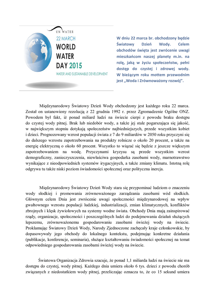 W dniu 22 marca br. obchodzony będzie Światowy Dzień Wody. Celem obchodów święta jest zwrócenie uwagi mieszkańcom naszej planety m.in. na rolę, jaką w życiu społeczeństw, pełni dostęp do czystej i zdrowej wody. W bieżącym roku mottem przewodnim jest „Woda i Zrównoważony rozwój”. Międzynarodowy Światowy Dzień Wody obchodzony jest każdego roku 22 marca. Został on ustanowiony rezolucją z 22 grudnia 1992 r. przez Zgromadzenie Ogólne ONZ. Powodem był fakt, iż ponad miliard ludzi na świecie cierpi z powodu braku dostępu do czystej wody pitnej. Brak lub niedobór wody, a także jej stale pogarszająca się jakość, w największym stopniu dotykają społeczeństw najbiedniejszych, przede wszystkim kobiet i dzieci. Prognozowany wzrost populacji świata z 7 do 9 miliardów w 2050 roku przyczyni się do dalszego wzrostu zapotrzebowania na produkty rolnicze o około 20 procent, a także na energię elektryczną o około 60 procent. Wszystko to wiązać się będzie z jeszcze większym zapotrzebowaniem na wodę. Przyczynami kryzysu są przede wszystkim wzrost demograficzny, zanieczyszczenia, niewłaściwa gospodarka zasobami wody, marnotrawstwo wynikające z nieodpowiednich systemów irygacyjnych, a także zmiany klimatu. Istotną rolę odgrywa tu także niski poziom świadomości społecznej oraz polityczna inercja. Międzynarodowy Światowy Dzień Wody stara się przypominać ludziom o znaczeniu wody słodkiej i promowania zrównoważonego zarządzania zasobami wód słodkich. Głównym celem Dnia jest zwrócenie uwagi społeczności międzynarodowej na wpływ gwałtownego wzrostu populacji ludzkiej, industrializacji, zmian klimatycznych, konfliktów zbrojnych i klęsk żywiołowych na systemy wodne świata. Obchody Dnia mają zainspirować rządy, organizacje, społeczności i poszczególnych ludzi do podejmowania działań służących lepszemu, zrównoważonemu gospodarowaniu zasobami świeżej wody na świecie. Proklamując Światowy Dzień Wody, Narody Zjednoczone zachęcały kraje członkowskie, by dopasowywały jego obchody do lokalnego kontekstu, podejmując konkretne działania (publikacje, konferencje, seminaria), służące kształtowaniu świadomości społecznej na temat odpowiedniego gospodarowania zasobami świeżej wody na świecie. Światowa Organizacja Zdrowia szacuje, że ponad 1,1 miliarda ludzi na świecie nie ma dostępu do czystej, wody pitnej. Każdego dnia umiera około 6 tys. dzieci z powodu chorób związanych z niedostatkiem wody pitnej, przeliczając oznacza to, że co 15 sekund umiera jedno dziecko. Nie uświadamiamy sobie tego, ponieważ brak wody pitnej nie uśmierca w sposób tak spektakularny i czytelny dla opinii publicznej jak powodzie, trzęsienia ziemi i wojny. Jego ofiary odchodzą w ciszy – są to przede wszystkim noworodki i dzieci zamieszkujące zarówno obszary rolnicze, jak i slumsy wielkich miast. Padają ofiarą chorób takich jak cholera, dur brzuszny, polio oraz biegunka, która co roku zabija 2,2 miliona dzieci. Dostęp do wody pitnej jest niezbędnym warunkiem dla rozwoju społeczeństw i walki z ubóstwem – bez zaspokojenia tej potrzeby rozwój edukacji i opieki zdrowotnej nie jest możliwy. Właśnie, dlatego brak wody pitnej można uznać za czynnik powiększający przepaść pomiędzy krajami rozwiniętymi a rozwijającymi się.