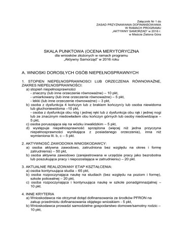 Załącznik Nr 1 do ZASAD PRZYZNAWANIA DOFINANSOWANIA W RAMACH PROGRAMU „AKTYWNY SAMORZAD” w 2016 r. w Mieście Zielona Góra SKALA PUNKTOWA (OCENA MERYTORYCZNA dla wniosków złożonych w ramach programu „Aktywny Samorząd” w 2016 roku A. WNIOSKI DOROSŁYCH OSÓB NIEPEŁNOSPRAWNYCH 1. STOPIEN NIEPEŁNOSPRAWNOSCI LUB ORZECZENIA RÓWNOWAŻNE, ZAKRES NIEPEŁNOSPRAWNOŚCI: a) stopień niepełnosprawności - znaczny (lub inne orzeczenie równoważne) – 10 pkt, - umiarkowany (lub inne orzeczenie równoważne) – 5 pkt, - lekki (lub inne orzeczenie równoważne) – 3 pkt, b) osoba z dysfunkcja 4 kończyn lub z brakiem kończyn/y lub osoba niewidoma lub głuchoniewidoma –10 pkt, - osoba z dysfunkcja obu nóg i jednej ręki lub z dysfunkcja obu rąk i jednej nogi lub ze znacznym niedowładem obu kończyn górnych lub osoby niedowidzące – 5 pkt, c) osoba poruszająca się na wózku inwalidzkim – 5 pkt, d) występuje niepełnosprawność sprzężona (więcej niż jedna przyczyna niepełnosprawności wynikająca z posiadanego orzeczenia), inna niż wymieniona lit. b, c – 5 pkt. 2. AKTYWNOSĆ ZAWODOWA WNIOSKODAWCY: a) osoba aktywna zawodowo, zatrudniona bez względu na okres i formę zatrudnienia) – 50 pkt, b) osoba aktywna zawodowo (zarejestrowana w urzędzie pracy jako bezrobotna lub poszukująca pracy i niepozostająca w zatrudnieniu) – 20 pkt. 3. AKTUALNIE REALIZOWANY ETAP KSZTAŁCENIA: a) osoba kontynuująca studia – 65 pkt, b) osoba rozpoczynająca naukę na studiach (bez względu na poziom i formę), szkole policealnej – 20 pkt, c) osoba rozpoczynająca i kontynuująca naukę w szkole ponadgimnazjalnej – 10 pkt. 4. INNE KRYTERIA a) Wnioskodawca nie otrzymał dotąd dofinansowania ze środków PFRON na zakup przedmiotu dofinansowania objętego wnioskiem - 5 pkt, b) Wnioskodawca prowadzi samodzielne gospodarstwo domowe/samotny rodzic – 10 pkt, c) dodatkowe osoby niepełnosprawne w gospodarstwie domowym Wnioskodawcy (jeden przypadek do wyboru): - w przypadku jednej osoby - 5 pkt, - w przypadku więcej niż jedna osoba – 10 pkt, d) szczególne utrudnienia Wnioskodawcy – 5 pkt, e) uzasadnienie wyboru danego przedmiotu dofinansowania w odniesieniu do posiadanych zasobów; uzasadnienie wniosku wskazujące, że wnioskowany przedmiot dofinansowania podniesie jakość wykonywanej pracy lub poziom wykształcenia – 10 pkt, f) osoby aplikujące w Obszarze C Zadanie nr 3 – 40 pkt, g) wniosek był kompletny w dniu przyjęcia – 5 pkt. W 2016 r. wyznacza się minimalny próg punktowy dla Wnioskodawców pełnoletnich, umożliwiający bieżące udzielenie dofinansowania na poziomie: wydatki bieżące – 40, wydatki inwestycyjne – 60 pkt.. Udzielenie dofinansowania wnioskodawcom, których wnioski uzyskały ocenę poniżej ustalonego minimalnego progu punktowego, uzależnione będzie od możliwości wynikających z ostatecznej puli przekazanych środków PFRON. B. WNIOSKI NIEPEŁNOLETNICH OSÓB NIEPEŁNOSPRAWNYCH 1. ZAKRES NIEPEŁNOSPRAWNOSCI PODOPIECZNEGO WNIOSKODAWCY: a) znaczny stopień niepełnosprawności ( w przypadku osoby powyżej 16 roku życia, osoba z dysfunkcja czterech kończyn lub z brakiem obu kończyn górnych lub osoba niewidoma – 10 pkt, b) osoba z dysfunkcja obu nóg i jednej ręki lub dysfunkcją obu rąk i jednej nogi lub znacznym niedowładem obu kończyn górnych, osoba niedowidząca – 5 pkt, c) osoba porusza się na wózku inwalidzkim – 5 pkt, d) niepełnosprawność podopiecznego jest sprzężona (więcej niż jedna przyczyna niepełnosprawności wynikająca z posiadanego orzeczenia) inna niż wymieniona w pkt 1 a, b – 5 pkt. 2. AKTUALNIE REALIZOWANY ETAP KSZTAŁCENIA: a) podopieczny pobiera naukę w szkole ponadgimnazjalnej – 50 pkt, b) podopieczny pobiera naukę w gimnazjum – 30 pkt, c) podopieczny pobiera naukę w szkole podstawowej – 25 pkt, d) podopieczny pobiera naukę w szkole specjalnej – 15 pkt. 3. INNE KRYTERIA a) Wnioskodawca, w tym jego podopieczny nie otrzymał dotąd dofinansowania ze środków PFRON na zakup przedmiotu dofinansowania objętego wnioskiem – 5 pkt, c) dodatkowe osoby niepełnosprawne w gospodarstwie domowym Wnioskodawcy (jeden przypadek do wyboru): - w przypadku jednej osoby -5 pkt, - w przypadku więcej niż jedna osoba – 10 pkt, d) szczególne utrudnienia Wnioskodawcy i podopiecznego – 5 pkt, e) wyboru danego przedmiotu dofinansowania w odniesieniu do posiadanych zasobów, uzasadnienie wniosku wskazujące, że wnioskowany przedmiot dofinansowania podniesie jakość wykonywanej pracy lub poziom wykształcenia lub podopieczny jest osobą aktywną zawodowo – 10 pkt, f) wniosek był kompletny w dniu przyjęcia – 5 pkt. W 2016 r. wyznacza się minimalny próg punktowy dla Wnioskodawców składających wniosek na rzecz swojego podopiecznego, umożliwiający bieżące udzielenie dofinansowania na poziomie: wydatki bieżące – 40 pkt, wydatki inwestycyjne – 60 pkt. Udzielenie dofinansowania wnioskodawcom, których wnioski przeszły pozytywną ocenę merytoryczną i uzyskały ocenę poniżej ustalonego minimalnego progu punktowego, uzależnione będzie od możliwości wynikających z ostatecznej puli przekazanych środków PFRON. Sporządziły: 1. Grażyna Węgrzyn 2. Dorota Bidołach