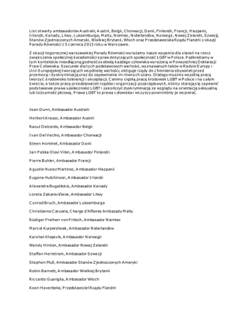 L is t otwarty ambasadorów A ustralii, A ustrii, Belgii, Chorwacji, D anii, Finlandii, Francji, H iszpanii, I rlandii, Kanady, L itwy, L uksemburga, M alty, N iemiec, N iderlandów, N orwegii, N owej Zelandii, Szwecji, Stanów Zjednoczonych Ameryki, Wielkiej Brytanii, Włoch oraz P rzedstawiciela Rządu Flandrii z okazji P arady Równości 1 5 c zerwca 2 013 roku w Wars zawie. Z okazji tegorocznej warszawskiej Parady Równości wyrażamy nasze ws parcie dla s tarań na rzecz zwięks zenia społecznej ś wiadomości s praw dotyczących społeczność L GBT w P olsce. P odkreślamy w tym kontekście nieodłączną godność os obistą każdego człowieka wyrażoną w P owszechnej D eklaracji P raw C złowieka. Szacunek dla tych podstawowych wartości, wyznawanych także w Radzie E uropy i U nii E uropejskiej tworzących ws pólnotę wartości, obliguje rządy do c hronienia obywateli przed przemocą i dyskryminacją oraz do zapewnienia im równych szans. D latego musimy ws pólną pracą tworzyć ś rodowisko tolerancji i akceptacji. C enimy ciężką pracę środowisk L GBT w P olsce i na c ałym ś wiec ie, a także pracę przedstawicieli rządów i organizacji pozarządowych, którzy starają s ię zapewnić pods tawowe prawa s połeczności L GBT i zakończyć dyskryminację ze względu na orientację s eksualną lub tożs amość płciową. P rawa L GBT to prawa c złowieka i ws zyscy powinniśmy je ws pierać. J ean D unn, Ambasador Australii H erbert Krauss, A mbasador Austrii Raoul D elcorde, A mbasador Belgii I van D el Vechio, A mbasador Chorwacji Steen H ommel, Ambasador D anii J ari P ekka O lavi Vilen, A mbasador Finlandii P ierre Buhler, Ambasador Francji A gustin N unez M artinez, A mbasador Hiszpanii E ugene Hutchinson, A mbasador I rlandii A lexandra Bugailiskis, Ambasador Kanady L oreta Zakarevičiene, Ambasador L itwy C onrad Bruch, Ambasador L uksemburga C hristianne C aruana, C harge d’Affaires Ambasady M alty Rüdiger Freiherr von Fritsch, Ambasador N iemiec M arc el Kurpershoek, Ambasador N iderlandów Kars ten Klepsvik, A mbasador N orwegii Wendy H inton, Ambasador N owej Zelandii Staffan H errstrom, Ambasador Szwecji Stephen Mull, Ambasador Stanów Zjednoczonych Ameryki Robin Barnett, A mbasador Wielkiej Brytanii Ric cardo G uariglia, A mbasador Włoch Koen H averbeke, P rzedstawiciel Rządu Flandrii I nic jatorem listu jest Ambasada Królestwa N iderlandów. Więcej informacji udziela: A driaan Palm, tel. 0603 9 61 8 20, [email protected] Katarzyna Kolman, tel. 022 5 59 12 5 1, [email protected]