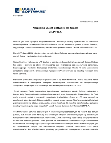 Case study Wrocław, 05.02.2008 Narzędzia Quest Software dla Oracle w LPP S.A. LPP S.A. jest firmą zajmującą się projektowaniem i dystrybucją odzieży. Spółka działa od 1995 roku i aktualnie posiada 102 sklepy RESERVED w Polsce, oraz 67 salonów za granicą (Czechy, Słowacja, Węgry,Rosja, Łotwa,Estonia i Ukraina). Do LPP należą również brandy CROPP RE-KIDS i ESOTIQ Firma LPP S.A. od 2006 roku korzysta z narzędzi Quest Software usprawniających zarządzanie bazą danych Oracle i zwiększających jej wydajność. Wszystkie sklepy należące do LPP działają w oparciu o jedną centralną bazę danych Oracle. Dlatego tak ważne zarówno ze strony informatycznej, jak i biznesowej, jest zapewnienie sprawnego, bezawaryjnego i wydajnie działającego środowiska bazodanowego Oracle. W celu usprawnienia zarządzania bazą danych i zwiększenia jej wydajności LPP zdecydowało się na zakup rozwiązań firmy Quest Software. Pierwszym produktem zakupionym w grudniu 2006 r. był Toad for Oracle. Jest to popularne wśród administratorów i developerów narzędzie informatyczne przeznaczone do kompleksowego zarządzania bazą danych oraz ułatwiające tworzenie i optymalizację kodu PL/SQL. „Przed zakupem Toad’a testowaliśmy jego darmowe, ewaluacyjne wersje. Byliśmy zadowoleni z bardzo dużej funkcjonalności i możliwości oferowanych przez to narzędzie. Stwierdziliśmy, że Toad może znacznie ułatwić i usprawnić zarządzanie środowiskiem Oracle w LPP oraz pozwoli na zwiększenie jej wydajności. Dlatego podjęliśmy decyzję o jego zakupie. Toad’a wyróżnia także łatwa i praktycznie intuicyjna obsługa oraz prosta i szybka instalacja. W zasadzie natychmiast po zakupie i instalacji mogliśmy już z niego korzystać.” - Jacek Kujawa, Dyrektor ds. Informatyki LPP S.A. Toad firmy Quest Software dostępny jest w kilku wersjach przeznaczonych dla różnych baz danych (Oracle, SQL Server, DB2, MySQL) oraz w różnych edycjach charakteryzujących się dodatkowymi funkcjonalnościami (Standard Edition, Professional, Xpert). Do obsługi Toad’a służy przejrzysta i łatwa w obsłudze konsola graficzna. Toad pozwala na kompleksowe zarządzanie całym środowiskiem bazodanowym. Automatyzując i upraszczając wykonywanie codziennych zadań administracyjnych, jak np. import/eksport danych czy uaktualnianie statystyk, pozwala zaoszczędzić czas pracy administratorów. Jest również bardzo przydatny programistom i developerom – pozwala znacznie przyspieszyć proces tworzenia kodu PL/SQL oraz zredukować ilość błędów i zoptymalizować kod, tak, aby był jak najlepszej jakości. Dodatkowo Toad umożliwia tworzenie rozbudowanych raportów przydatnych nie tylko działom IT, ale także kadrze zarządzającej i analitykom biznesowym. W LPP S.A. Toad znacznie uprościł zarządzanie całym środowiskiem Oracle. W LPP pozostał jednak problem zauważalnych spadków wydajności centralnej bazy danych pojawiających się głównie w nocy (LPP wyróżnia się jednym z największych przetwarzań nocnych w Polsce). Bez specjalistycznych narzędzi trudno byłoby wykryć i dokładnie zdiagnozować ich przyczynę. W związku z tym LPP zdecydowało się wiosną 2007 r. na zakup i wdrożenie dwóch kolejnych narzędzi Quest Software do obsługi bazy danych Oracle: Performance Analysis for Oracle oraz Space Manager. Performance Analysis for Oracle (PA) to narzędzie do przeprowadzania analiz wydajności środowiska Oracle. Pozwala na szybką i dokładną diagnostykę problemów wydajnościowych oraz przeprowadzanie tuningu instancji w celu osiągnięcia jak najlepszej wydajności bazy danych. Performance Analysis wykorzystuje technologię IntelliProfile pozwalającą na inteligentne ustalenie linii bazowej wydajności. Po jej przekroczeniu, PA pokazuje analizę problemów i rekomendowane działania w celu natychmiastowej poprawy wydajności bazy danych. Dzięki stałemu monitoringowi 24x7 analizowane są informacje dotyczące wydajności środowiska bazodanowego, co pozwala natychmiast wykryć nieprawidłowości i anomalie. PA umożliwia tworzenie dokładnych analiz wydajności bazy danych zarówno w czasie rzeczywistym, jak i w ujęciu historycznym. Śledzi także wszystkie wprowadzane przez administratorów zmiany i ustala ich wpływ na wydajność. „LPP posiada bardzo rozbudowane przetwarzanie nocne. Nasza centralna baza danych często bywa obciążona m.in. przez procedury centralnego zarządzania zatowarowaniem, cenami i promocjami.. Jeżeli w nocy nagle spadnie wydajność, Performance Analysis pozwala sprawdzić i zdiagnozować, co się dzieje i zobaczyć jakie procesy wpłynęły na to spowolnienie. Potrafi wyświetlić kiedy było obciążenie, które batche generowały największy spadek wydajności i dla jakich procesów. Możemy teraz oglądać historię nocy i dokładnie przeanalizować wybrany fragment, który nas interesuje. Performance Analysis sprawił, że diagnostyka i analiza wydajności stały się proste, szybkie i praktycznie całkowicie zautomatyzowane.” - Jacek Kujawa, Dyrektor ds. Informatyki LPP S.A. Space Manager umożliwia stały monitoring pojemności oraz zarządzanie przestrzenią dyskową. Narzędzie to pozwala na w pełni zautomatyzowane optymalizowanie pojemności bazy danych Oracle w czasie rzeczywistym (24x7) bez żadnego wpływu na działanie aplikacji i spadków wydajności. Stały monitoring dostarcza szczegółowych informacji oraz analiz na temat wykorzystania dysku. Identyfikuje elementy i obszary, które najszybciej zajmują dodatkową przestrzeń. Wszystko to jest pokazane w przejrzystym graficznym interfejsie. Space Manager określa także wymagania przestrzeni w przyszłości oraz powiadamia o obszarach potrzebujących jej natychmiastowego zwiększenia. Dodatkowo Space Manager pozwala na przeprowadzanie symulacji i testów, które pozwalają dokładnie przewidzieć i zaplanować przyszłe potrzeby i wydatki związane z koniecznością 