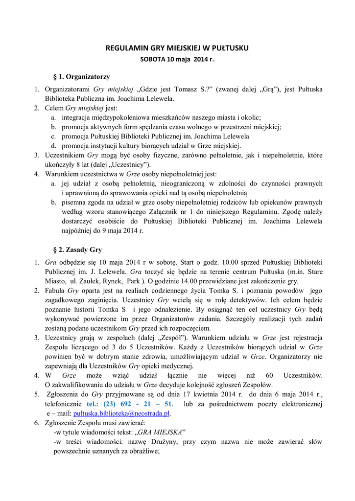 REGULAMIN GRY MIEJSKIEJ W PUŁTUSKU SOBOTA 10 maja 2014 r. § 1. Organizatorzy 1. Organizatorami Gry miejskiej „Gdzie jest Tomasz S.?” (zwanej dalej „Grą”), jest Pułtuska Biblioteka Publiczna im. Joachima Lelewela. 2. Celem Gry miejskiej jest: a. integracja międzypokoleniowa mieszkańców naszego miasta i okolic; b. promocja aktywnych form spędzania czasu wolnego w przestrzeni miejskiej; c. promocja Pułtuskiej Biblioteki Publicznej im. Joachima Lelewela d. promocja instytucji kultury biorących udział w Grze miejskiej. 3. Uczestnikiem Gry mogą być osoby fizyczne, zarówno pełnoletnie, jak i niepełnoletnie, które ukończyły 8 lat (dalej „Uczestnicy”). 4. Warunkiem uczestnictwa w Grze osoby niepełnoletniej jest: a. jej udział z osobą pełnoletnią, nieograniczoną w zdolności do czynności prawnych i uprawnioną do sprawowania opieki nad tą osobą niepełnoletnią b. pisemna zgoda na udział w grze osoby niepełnoletniej rodziców lub opiekunów prawnych według wzoru stanowiącego Załącznik nr 1 do niniejszego Regulaminu. Zgodę należy dostarczyć osobiście do Pułtuskiej Biblioteki Publicznej im. Joachima Lelewela najpóźniej do 9 maja 2014 r. § 2. Zasady Gry 1. Gra odbędzie się 10 maja 2014 r w sobotę. Start o godz. 10.00 sprzed Pułtuskiej Biblioteki Publicznej im. J. Lelewela. Gra toczyć się będzie na terenie centrum Pułtuska (m.in. Stare Miasto, ul. Zaułek, Rynek, Park ). O godzinie 14.00 przewidziane jest zakończenie gry. 2. Fabuła Gry oparta jest na realiach codziennego życia Tomka S. i poznania powodów jego zagadkowego zaginięcia. Uczestnicy Gry wcielą się w rolę detektywów. Ich celem będzie poznanie historii Tomka S i jego odnalezienie. By osiągnąć ten cel uczestnicy Gry będą wykonywać powierzone im przez Organizatorów zadania. Szczegóły realizacji tych zadań zostaną podane uczestnikom Gry przed ich rozpoczęciem. 3. Uczestnicy grają w zespołach (dalej „Zespół”). Warunkiem udziału w Grze jest rejestracja Zespołu liczącego od 3 do 5 Uczestników. Każdy z Uczestników biorących udział w Grze powinien być w dobrym stanie zdrowia, umożliwiającym udział w Grze. Organizatorzy nie zapewniają dla Uczestników Gry opieki medycznej. 4. W Grze może wziąć udział łącznie nie więcej niż 60 Uczestników. O zakwalifikowaniu do udziału w Grze decyduje kolejność zgłoszeń Zespołów. 5. Zgłoszenia do Gry przyjmowane są od dnia 17 kwietnia 2014 r. do dnia 6 maja 2014 r., telefonicznie tel.: (23) 692 - 21 – 51. lub za pośrednictwem poczty elektronicznej e – mail: [email protected]. 6. Zgłoszenie Zespołu musi zawierać: -w tytule wiadomości tekst: „GRA MIEJSKA” -w treści wiadomości: nazwę Drużyny, przy czym nazwa nie może zawierać słów powszechnie uznanych za obraźliwe; -imię, numer telefonu komórkowego, oraz adres e-mail głównego przedstawiciela Drużyny („Głównodowodzącego”), musi to być osoba pełnoletnia. 7. Każdy Zespół, po weryfikacji zgodności zgłoszenia z regulaminem Gry otrzyma potwierdzenie przyjęcia zgłoszenia, a następnie informacje niezbędne do rozpoczęcia Gry. 8. Gra rozpocznie się o godz. 10.00 w Pułtuskiej Bibliotece Publicznej im. Joachima Lelewela, ul. Słowackiego 6. 9. Podczas Gry każdy Zespół otrzyma Kartę Uczestnika. 10. Podczas Gry Zespoły będą wykonywać zadania i wskazówki. 11. O kolejności otrzymywania zadań na punktach Gry decyduje kolejność przybycia Zespołu na ten punkt. 12. Uczestnicy Gry, w trakcie jej trwania poruszają się pieszo. W każdym punkcie kontaktowym Gry, przed otrzymaniem zadania, Zespół musi okazać Kartę Uczestnika przedstawicielowi Organizatora. W każdym punkcie kontaktowym Gry liczba Uczestników w Zespole będzie weryfikowana z liczbą Uczestników oznaczoną na Karcie. W razie niezgodności Zespół nie będzie mógł otrzymać zadania na punkcie Gry. 13. W przypadku naruszenia przez Uczestnika Gry lub Zespół niniejszego regulaminu, złamania zasad fair play, grania niegodnie z zasadami Gry, o których gracze zostali poinformowani przez jej rozpoczęciem, oszukiwania, utrudniania gry innym graczom bądź niszczenia wskazówek, w dowolnym momencie Gry Organizatorzy mają prawo odebrania Zespołowi Karty Uczestnika i wykluczenia go z Gry. Decyzja Organizatorów w tej kwestii jest ostateczna. 14. Gra toczy się w normalnym ruchu miejskim i prosimy o zachowanie szczególnej ostrożności. 15. Odbierając Kartę Zawodnika i podpisując się na liście uczestnicy wyrażają zgodę na: a. wzięcie udziału w Grze na warunkach określonych w niniejszym regulaminie; b. przetwarzanie przez Organizatorów danych osobowych uczestnika w zakresie niezbędnym dla przeprowadzenia Gry (zgodnie z ustawą o ochronie danych osobowych z dnia 29.09.1997 (Dz. U. nr 133 poz. 883). c. opublikowanie na stronach internetowych Organizatorów wizerunku Uczestnika, oraz imienia i nazwiska uczestnika w przypadku, gdy ten otrzyma nagrodę lub wyróżnienie. § 3. Wyłanianie zwycięzców 1. Wszyscy uczestnicy, którzy odnajdą „Tomka S.” wygrywają grę. 2. Po zakończeniu Gry zostaną wylosowane nagrody rzeczowe spośród uczestników imprezy. § 5. Postanowienia końcowe 1. Regulamin znajduje się do wglądu w siedzibie Pułtuskiej Biblioteki Publicznej im. J. Lelewela, ul. Słowackiego 6 i na stronie internetowej [email protected] 2. W kwestiach dotyczących przebiegu Gry, nieprzewidzianych niniejszym regulaminem, a także w zakresie interpretacji tegoż regulaminu, głos rozstrzygający należy do Organizatorów. 3. Organizatorzy zastrzegają sobie prawo wprowadzenia zmian w regulaminie z ważnych przyczyn. Załącznik nr 1 ZGODA RODZICÓW/OPIEKUNÓW NA UDZIAŁ W GRZE MIEJSKIEJ „GDZIE JEST TOMASZ S.” ORGANIZOWANEJ PRZEZ PUŁTUSKĄ BIBLIOTEKĘ PUBLICZNĄ IM. JOACHIMA LELEWELA ………………………………………… (imię i nazwisko rodzica/opiekuna) ………………………………………… (adre