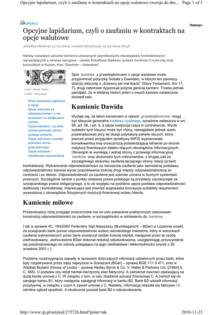 Opcyjne lapidarium, czyli o zaufaniu w kontraktach na opcje walutowe (wersja do dru... Page 1 of 3 DRUKUJ iPrzemysł biznes Opcyjne lapidarium, czyli o zaufaniu w kontraktach na opcje walutowe Arkadiusz Radwan 13-03-2009, ostatnia aktualizacja 13-03-2009 06:36 NaleŜy rozwaŜyć uznanie istnienia ubocznych (wynikowych) obowiązków kontraktowych wyrastających z umowy opcyjnej – uwaŜa Arkadiusz Radwan, prezes Centrum C-Law.org oraz konsultant w Kubas, Kos, Gaertner – Adwokaci autor: Paweł Gałka źródło: Fotorzepa Mniej ustawowej ingerencji w opcje Opcje walutowe są zabezpieczeniem, a nie sposobem na zwiększanie zysków Opcje walutowe: czy tylko zasada pewności obrotu podlega ochronie Opcje walutowe a zasady pewności obrotu gospodarczego Opcje walutowe – niewłaściwa reprezentacja Spór banków z przedsiębiorcami o opcje walutowe moŜe przypominać potyczkę Goliata z Dawidem, w którym ten pierwszy dzierŜy włócznię o „drzewcu jak wał tkacki” (Stary Testament, Sm 17, 7), drugi natomiast dysponuje jedynie garścią kamieni. Trzeba jednak pamiętać, Ŝe w biblijnej historii jeden z owych kamieni ostatecznie doszedł celu. Kamienie Dawida Wydaje się, Ŝe takim kamieniem w rękach przedsiębiorców mogą być klauzule generalne kodeksu cywilnego, wyraŜone zwłaszcza w art. 56, art. 58, i art. 5, a takŜe instytucja culpa in contrahendo. Wynik wykładni tych klauzul moŜe być róŜny, niewątpliwie jednak warto przeanalizować przy tej okazji judykaturę państw obcych, która jeszcze przed przyjęciem dyrektywy MiFID wypracowała konsekwentną linię orzeczniczą potwierdzającą istnienie po stronie instytucji finansowych daleko idących obowiązków informacyjnych. Obowiązki te wynikają z jednej strony z przewagi informacyjnej banków oraz złoŜoności tych instrumentów, z drugiej zaś ze szczególnego stosunku zaufania łączącego strony relacji (przed) kontraktowej. Wykreowanie odpowiedzialności za naruszone zaufanie jako samoistnej podstawy odpowiedzialności stanowi wyraz poszukiwania trzeciej drogi między odpowiedzialnością ex contractu i ex delicto. Odpowiedzialność za zaufanie jest szeroko uznana w licznych systemach prawnych. Szczególnie istotne z punktu widzenia prawa polskiego są przykłady zaczerpnięte ze szwajcarskiego prawa obligacyjnego, a to ze względu na podobne ujęcie podstaw odpowiedzialności deliktowej i kontraktowej. Interesująca jest równieŜ anglosaska koncepcja suitability requirement wywodzona z obowiązków fiducjarnych instytucji finansowej wobec klienta. Kamienie milowe Prezentowany niŜej przegląd orzecznictwa ma na celu pokazanie praktycznych zastosowań konstrukcji odpowiedzialności za zaufanie, w szczególności w odniesieniu do banków . I tak w sprawie 4C. 193/2000 Federalny Sąd NajwyŜszy (Bundesgericht – BGer) w Lozannie orzekł, Ŝe szwajcarski bank ponosi odpowiedzialność wobec niemieckiego inwestora, który w warunkach zaufania wykreowanych przez bank powierzył osobie trzeciej kapitał, następnie przez tę osobę zdefraudowany. Jednocześnie BGer dokonał redukcji odszkodowania, uwzględniając przyczynienie się poszkodowanego do szkody polegające na jego niedbalstwie i lekkomyślności (wyrok z 26 września 2001 r.). Podobne rozstrzygnięcia zapadły w sprawach dotyczących informacji udzielonych przez bank, które były rozpatrywane przez sądy najwyŜsze w Szwajcarii (BGer) – sprawa BGE 111 II 471, oraz w Wielkiej Brytanii (House of Lords) – sprawa Hedley Byrne & Co. V. Heller & Partners Ltd. ([1964] A. C. 465). U podstaw obu leŜał niemal identyczny stan faktyczny: A zamierzał zawrzeć opiewającą na duŜą kwotę umowę z C. W związku z tym, w celu zbadania sytuacji finansowej C, A zwrócił się do swojego banku B1, który następnie zasięgnął informacji w banku B2. Bank B2 udzielił informacji pozytywnej, w związku z czym A zawarł umowę z C. Niestety, informacja okazała się fałszywa i C wkrótce ogłosił upadłość. A skutecznie pozwał bank B2 o odszkodowanie. http://www.rp.pl/artykul/275726.html?print=tak 2010-11-23 Opcyjne lapidarium, czyli o zaufaniu w kontraktach na opcje walutowe (wersja do dru... Page 2 of 3 Bardzo podobna do opisanej była sprawa niemiecka („Lastschriftfall” – BGHZ 69, 82), w której Bundesgerichtshof (BGH) uznał odpowiedzialność banku z tytułu wprowadzenia w błąd wierzyciela, kiedy przy rozliczeniu w formie autoryzowanego polecenia pobrania środków pienięŜnych z konta dłuŜnika polecenie nie zostało zwrócone przez bank, mimo iŜ konto dłuŜnika nie wykazywało pokrycia. Wierzyciel wyprowadził stąd błędny wniosek o wypłacalności dłuŜnika i udzielił mu kolejnego kredytu, który nie został spłacony. Jeszcze dalej idzie inne orzeczenie niemieckiego BGH: bank, który zgodnie z prawdą poinformował inny bank o istnieniu pokrycia czeku określonego klienta-wystawcy, ma obowiązek ponownego poinformowania tego banku – nawet w braku powtórzonego zapytania – o zmianie okoliczności, które dezaktualizują poprzednią informację (BGHZ 61, 176). Z kolei w sprawie BGE 125 III 89 szwajcarski BGer nie uznał istnienia wobec doświadczonych przedsiębiorców obowiązków informacyjnych banku kredytującego dotyczących ryzyka związanego ze spekulacyjnymi inwestycjami w nieruchomości finansowanymi z udzielanego kredytu. Jednocześnie jednak BGer zauwaŜył, Ŝe sytuacja przedstawiałaby się inaczej w przypadku istnienia po stronie banku znaczącej przewagi informacyjnej, gdyby kredytobiorca był osobą niedoświadczoną. Ignorantia non nocet? W orzecznictwie przyjmuje się, Ŝe zasada zaufania moŜe niekiedy przełamywać nawet zasadę ignorantia iuris nocet – w ten sposób niemiecki BGH orzekł w sprawach BGHZ 16, 334, 338 i BGHZ 35, 272, 279, w których chodziło o niepoinformowanie klienta przez profesjonalnego pośrednika o konieczności dochowania formy aktu notarialnego przy sprzedaŜy nieruchomości. W podobnym