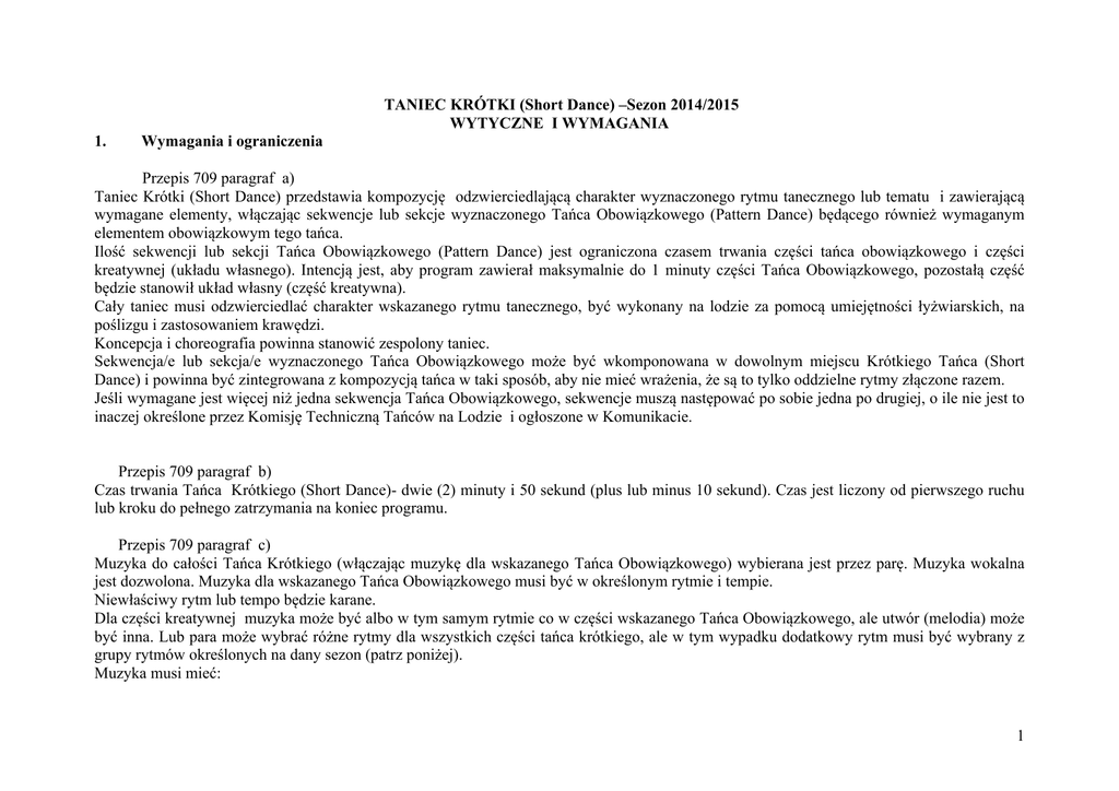 TANIEC KRÓTKI (Short Dance) –Sezon 2014/2015 WYTYCZNE I WYMAGANIA 1. Wymagania i ograniczenia Przepis 709 paragraf a) Taniec Krótki (Short Dance) przedstawia kompozycję odzwierciedlającą charakter wyznaczonego rytmu tanecznego lub tematu i zawierającą wymagane elementy, włączając sekwencje lub sekcje wyznaczonego Tańca Obowiązkowego (Pattern Dance) będącego również wymaganym elementem obowiązkowym tego tańca. Ilość sekwencji lub sekcji Tańca Obowiązkowego (Pattern Dance) jest ograniczona czasem trwania części tańca obowiązkowego i części kreatywnej (układu własnego). Intencją jest, aby program zawierał maksymalnie do 1 minuty części Tańca Obowiązkowego, pozostałą część będzie stanowił układ własny (część kreatywna). Cały taniec musi odzwierciedlać charakter wskazanego rytmu tanecznego, być wykonany na lodzie za pomocą umiejętności łyżwiarskich, na poślizgu i zastosowaniem krawędzi. Koncepcja i choreografia powinna stanowić zespolony taniec. Sekwencja/e lub sekcja/e wyznaczonego Tańca Obowiązkowego może być wkomponowana w dowolnym miejscu Krótkiego Tańca (Short Dance) i powinna być zintegrowana z kompozycją tańca w taki sposób, aby nie mieć wrażenia, że są to tylko oddzielne rytmy złączone razem. Jeśli wymagane jest więcej niż jedna sekwencja Tańca Obowiązkowego, sekwencje muszą następować po sobie jedna po drugiej, o ile nie jest to inaczej określone przez Komisję Techniczną Tańców na Lodzie i ogłoszone w Komunikacie. Przepis 709 paragraf b) Czas trwania Tańca Krótkiego (Short Dance)- dwie (2) minuty i 50 sekund (plus lub minus 10 sekund). Czas jest liczony od pierwszego ruchu lub kroku do pełnego zatrzymania na koniec programu. Przepis 709 paragraf c) Muzyka do całości Tańca Krótkiego (włączając muzykę dla wskazanego Tańca Obowiązkowego) wybierana jest przez parę. Muzyka wokalna jest dozwolona. Muzyka dla wskazanego Tańca Obowiązkowego musi być w określonym rytmie i tempie. Niewłaściwy rytm lub tempo będzie karane. Dla części kreatywnej muzyka może być albo w tym samym rytmie co w części wskazanego Tańca Obowiązkowego, ale utwór (melodia) może być inna. Lub para może wybrać różne rytmy dla wszystkich części tańca krótkiego, ale w tym wypadku dodatkowy rytm musi być wybrany z grupy rytmów określonych na dany sezon (patrz poniżej). Muzyka musi mieć: 1 i) wyraźne rytmiczne uderzenie . Muzyczny wstęp do Tańca Krótkiego może być bez wyraźnego rytmicznego uderzenia lub melodii przez maksimum 10 sekund na początku programu ii) musi być wybrana zgodnie z wyznaczonymi rytmami iii) musi być wybrana zgodnie z wyznaczonym tempem Przepis 709 paragraf d) Rysunek wskazanego Tańca Obowiązkowego musi być zgodny z art. 708 par. 1 d) i z opisem, położeniem i diagramem tego tańca. Rysunek części kreatywnej musi być generalnie w stałym kierunku i nie może przecinać środkowej osi lodowiska za wyjątkiem jednego razu na końcach lodowiska nie dalej jak 20 metrów od krótkiej bandy (odstępstwa zawarte w komunikatach). Pętle w każdym kierunku są dozwolone pod warunkiem, że nie przecinają centralnej osi podłużnej lodowiska (odstępstwa zawarte w komunikatach). Wyjątek od tej reguły stanowią: 1. przecięcie podłużnej osi lodowiska podczas wykonywania Obowiązkowej Sekwencji Kroków bez trzymania się po przekątnej, po Kole i po środkowej osi lodowiska 2. 2014-15: wykonując jedną pętlę w odległości nie większej niż 20 metrów od krótkiej bandy i z możliwością przecięcia środkowej osi lodowiska w celu połączenia z drugą Sekwencji Silver Samby w Juniorskim Tańcu Krótkim 3. 2014-15: wykonując jedną pętlę w Kreatywnej Sekwencji Paso Doble (Partial Step Sequence) w odległości nie większej niż 20 metrów od krótkiej bandy z możliwością przecięcia środkowej osi lodowiska w Seniorskim Tańcu Krótkim Przepis 709 paragraf e) Wszystkie kroki taneczne, obroty rotacje i zmiany pozycji są dozwolone pod warunkiem, że są zgodnie z rytmem. Trudność, oryginalność, różnorodność i pomysłowość jest wymagana od obojga łyżwiarzy. Podskoki i skoki z nie więcej niż 1 pełnym obrotem są dozwolone. Skoki z 1 obrotem nie mogą być wykonywane równocześnie przez boje partnerów. Klęczenie i ślizganie na dwóch kolanach lub siedzenie na lodzie jest niedozwolone (jeśli się to zdarzy, wówczas będzie uznane za upadek i zostanie zastosowane odpowiednie odjęcie). Dotykanie ręką/rękoma lodu jest niedozwolone. Przepis 709 paragraf f) Nie ma ograniczeń w pozycjach tanecznych (lub ich wariacjach). Pozycja „Ręka w Rękę” z pełnym wyprostem ramion jest dozwolona pod warunkiem, że nie jest utrzymana. 2 Przepis 709 paragraf g) Partnerzy mogą jechać oddzielnie jedynie w celu zmiany pozycji (nie dłużej niż jeden takt muzyczny), podczas prezentacji „Sekwencji kroków bez trzymania się” wykonywanej wzdłuż osi środkowej lodowiska, Sekwencji Twizzli lub podczas dozwolonych zatrzymań. Odległość między partnerami nie może być większa niż na odległość dwóch wyprostowanych ramion. Rozdzielenie na początku i/lub na końcu programu mogą trwać do 10 sekund bez ograniczenia odległości między łyżwiarzami. Przepis 709 paragraf h) Po uruchomieniu czasu od pierwszego ruchu, para może pozostać w jednym miejscu nie dłużej niż 10 sekund (nawet jeśli prezentuje dodatkowe zatrzymanie, które jest dozwolone). Podczas Programu Krótkiego dozwolone są dwa (2) pełne zatrzymania (czas zatrzymania nie może być dłuższy niż 5 sekund każde) lub jedno do 10 sekund (sezon 2014-15)W trakcie dodatkowych zatrzymań może być zastosowana każda choreografia odpowiednia do wybranej muzyki (włączając rozdzielenia nie większe niż na odległość 2 wyciągniętych ramion) (odstępstwa poniżej na sezon 2014-15). Przepis 709 paragraf i) Program powinien być ułożony w oparciu o dobrą technikę jazd