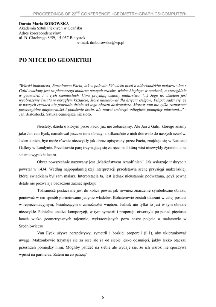 PROCEEDINGS OF 22ND CONFERENCE ▪GEOMETRY▪GRAPHICS▪COMPUTER▪ Dorota Maria BOROWSKA Akademia Sztuk Pięknych w Gdańsku Adres korespondencyjny: ul. B. Chrobrego 8/59, 15-057 Białystok e-mail: [email protected] PO NITCE DO GEOMETRII "Włoski humanista, Bartolomeo Facio, tak w połowie XV wieku pisał o niderlandzkim malarzu: Jan z Galii uważany jest za pierwszego malarza naszych czasów, wielce biegłego w naukach, a szczególnie w geometrii, i w tych rzemiosłach, które przydają ozdoby malarstwu. (...) Jego też dziełem jest wyobrażenie świata w okrągłym kształcie, które namalował dla księcia Belgów, Filipa; sądzi się, że w naszych czasach nie powstało dzieło od tego obrazu doskonalsze. Możesz tam nie tylko rozpoznać poszczególne miejscowości i położenie krain, ale nawet zmierzyć odległość pomiędzy miastami..." Jan Białostocki, Sztuka cenniejsza niż złoto. Niestety, dzieła o którym pisze Facio już nie zobaczymy. Ale Jan z Galii, którego znamy jako Jan van Eyck, namalował jeszcze inne obrazy, a kilkanaście z nich dotrwało do naszych czasów. Jeden z nich, być może równie niezwykły jak obraz opisywany przez Facia, znajduje się w National Gallery w Londynie. Przedstawia parę trzymającą się za ręce, nad którą wisi niezwykły żyrandol a na ścianie wypukłe lustro. Obraz powszechnie nazywany jest „Małżeństwem Arnolfinich”. Jak wskazuje inskrypcja powstał w 1434. Według najpopularniejszej interpretacji przedstawia scenę przysięgi małżeńskiej, której świadkiem był sam malarz. Interpretacja ta, jest jednak nieustannie podważana, gdyż pewne detale nie pozwalają badaczom zaznać spokoju. Tożsamość postaci nie jest do końca pewna jak również znaczenie symboliczne obrazu, ponieważ w ten sposób portretowano jedynie władców. Bohaterowie zostali ukazani w całej postaci w reprezentacyjnym, świadczącym o zamożności wnętrzu. Jednak nie tylko to jest w tym obrazie niezwykłe. Pobieżna analiza kompozycji, w tym symetrii i proporcji, otworzyła po ponad pięciuset latach wieko geometrycznych tajemnic, wykraczających poza nasze pojęcie o malarstwie w Średniowieczu. Van Eyck używa perspektywy, symetrii i boskiej proporcji (il.1), aby ukierunkować uwagę. Małżonkowie trzymają się za ręce ale są od siebie lekko odsunięci, jakby lekko otaczali przestrzeń pomiędzy nimi. Mogliby patrzeć na siebie ale wydaje się, że ich wzrok nie spoczywa wprost na partnerze. Zatem na co patrzą? 6 PROCEEDINGS OF 22ND CONFERENCE ▪GEOMETRY▪GRAPHICS▪COMPUTER▪ Rys. 1 Van Eyck używa perspektywy, symetrii i boskiej proporcji, aby ukierunkować uwagę. Jeśli na moment przestaniemy poddawać się realistycznej iluzji stworzonej przez malarza, a zaczniemy analizować szkielet kompozycji, dostrzeżemy w obrazie, pomiędzy postaciami kilka ważnych elementów. Zdejmując barwną „skórę” malowidła, odsłonimy niezwykły porządek geometryczny. Np. lustro zostało zaprojektowane niemal tak, jak rozeta okna średniowiecznej katedry. (il.2) Rys. 2 Lustro zostało zaprojektowane niemal tak, jak rozeta okna średniowiecznej katedry. Obraz w całości został bardzo dokładnie przemyślany, a miejsce każdego elementu jest dokładnie wymierzone. Van Eyck posługiwał się jednostką, wg której wszystko komponował, a 7 PROCEEDINGS OF 22ND CONFERENCE ▪GEOMETRY▪GRAPHICS▪COMPUTER▪ komponując mierzył. Prześwietlenie obrazu wskazuje na zmiany, których dokonywał w trakcie pracy. Przypomina to wypowiedź mówcy, który doprecyzowuje istotę tego, co chce wyrazić. Dzięki temu możemy zyskać pewne wskazówki dotyczące zamiarów twórcy. Ostatecznie obraz "Małżeństwie Arnolfinich" obfituje w liczby ciągu Fibonacciego i zależności między geometrycznymi wątkami. Detale, takie jak lustro, paternoster i miotełka, w centralnej części obrazu, zostały namalowane w taki sposób, że stwarzają „geometryczne środowisko” (il.3). Gwóźdź jest punktem, z którego wychodzą dwa końce paternostra jako promienie dwóch okręgów. Kolejny gwóźdź, na którym wisi miotełka, jest drugim punktem, o który możemy oprzeć prostą rozpiętą między dwoma gwoździami. Ta nieskomplikowana sytuacja pozwala na wykreślenie siedmiokąta, trudnej do konstrukcji figury, w zaskakująco precyzyjny sposób. Okazuje się również, że siedmiokąt jest ściśle powiązany z geometrią dziesięcioramiennego lustra i zawartych w nim pięciokątów. Rys. 3 Detale, takie jak lustro, paternoster i miotełka, w centralnej części obrazu, zostały namalowane w taki sposób, że stwarzają „geometryczne środowisko”. Wydaje się, że siedmiokąt jest wierzchołkiem wszystkich geometrycznych zdarzeń. Jednak od samej figury, ważniejsza jest metoda „odnalezienia” go. Nie znajdujemy w obrazie siedmiokąta jako takiego. Znajdujemy przede wszystkim elementy, które użyte prowadzą do jego zbudowania. Siedmiokąt jest, ale nie jest zbudowany z boków, z obrysu, z platońskiego „cienia rzeczywistości doskonałej”, za to jest uchwycona jego istota, jego źródło. Aby powstał potrzebna jest wiedza, ruch i narzędzia. To oddaje istotę Boga, boską działalność, jego wolę wg średniowiecznej wiary. 8