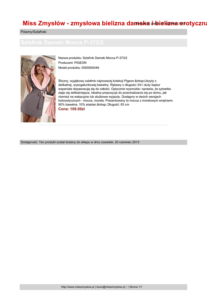 Utworzono: piątek, 21 czerwiec 2013 Miss Zmysłów - zmysłowa bielizna damska i bielizna erotyczna Piżamy/Szlafroki Szlafrok Damski Mocca P-373/2 Nazwa produktu: Szlafrok Damski Mocca P-373/2 Producent: PIGEON Model produktu: 0000000449 Śliczny, wyjątkowy szlafrok najnowszej kolekcji Pigeon. Uszyty z delikatnej, wysogatunkowej bawełny. Rękawy o długości 3/4 i duży kaptur wspaniale dopasowują się do całości. Optycznie wysmukla i sprawia, że sylwetka staje się delikatniejsza. Idealna propozycja do przechadzania się po domu, jak również na wakacyjne lub służbowe wyjazdy. Dostępny w dwóch wersjach kolorystycznych - mocca, morela. Prezentowany to mocca z morelowym wnętrzem. 90% bawełna, 10% elastan. Długość: 83 cm Cena: 109.00zł Dostępność: Ten produkt został dodany do sklepu w dniu czwartek, 20 czerwiec 2013 http://www.misszmyslow.pl | [email protected] | | Strona 1/1