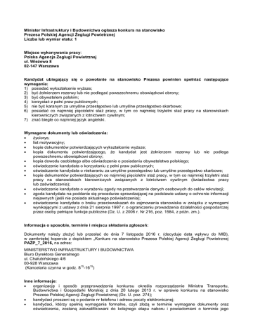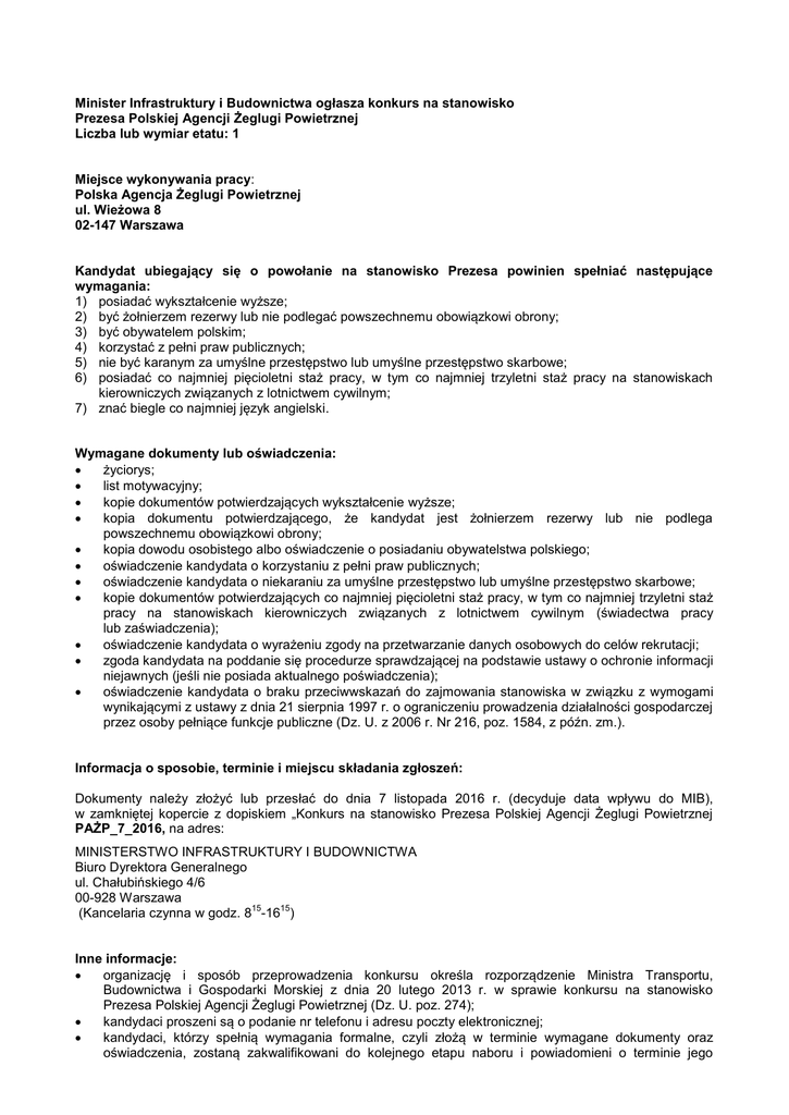 Minister Infrastruktury i Budownictwa ogłasza konkurs na stanowisko Prezesa Polskiej Agencji Żeglugi Powietrznej Liczba lub wymiar etatu: 1 Miejsce wykonywania pracy: Polska Agencja Żeglugi Powietrznej ul. Wieżowa 8 02-147 Warszawa Kandydat ubiegający się o powołanie na stanowisko Prezesa powinien spełniać następujące wymagania: 1) posiadać wykształcenie wyższe; 2) być żołnierzem rezerwy lub nie podlegać powszechnemu obowiązkowi obrony; 3) być obywatelem polskim; 4) korzystać z pełni praw publicznych; 5) nie być karanym za umyślne przestępstwo lub umyślne przestępstwo skarbowe; 6) posiadać co najmniej pięcioletni staż pracy, w tym co najmniej trzyletni staż pracy na stanowiskach kierowniczych związanych z lotnictwem cywilnym; 7) znać biegle co najmniej język angielski. Wymagane dokumenty lub oświadczenia: życiorys; list motywacyjny; kopie dokumentów potwierdzających wykształcenie wyższe; kopia dokumentu potwierdzającego, że kandydat jest żołnierzem rezerwy lub nie podlega powszechnemu obowiązkowi obrony; kopia dowodu osobistego albo oświadczenie o posiadaniu obywatelstwa polskiego; oświadczenie kandydata o korzystaniu z pełni praw publicznych; oświadczenie kandydata o niekaraniu za umyślne przestępstwo lub umyślne przestępstwo skarbowe; kopie dokumentów potwierdzających co najmniej pięcioletni staż pracy, w tym co najmniej trzyletni staż pracy na stanowiskach kierowniczych związanych z lotnictwem cywilnym (świadectwa pracy lub zaświadczenia); oświadczenie kandydata o wyrażeniu zgody na przetwarzanie danych osobowych do celów rekrutacji; zgoda kandydata na poddanie się procedurze sprawdzającej na podstawie ustawy o ochronie informacji niejawnych (jeśli nie posiada aktualnego poświadczenia); oświadczenie kandydata o braku przeciwwskazań do zajmowania stanowiska w związku z wymogami wynikającymi z ustawy z dnia 21 sierpnia 1997 r. o ograniczeniu prowadzenia działalności gospodarczej przez osoby pełniące funkcje publiczne (Dz. U. z 2006 r. Nr 216, poz. 1584, z późn. zm.). Informacja o sposobie, terminie i miejscu składania zgłoszeń: Dokumenty należy złożyć lub przesłać do dnia 7 listopada 2016 r. (decyduje data wpływu do MIB), w zamkniętej kopercie z dopiskiem „Konkurs na stanowisko Prezesa Polskiej Agencji Żeglugi Powietrznej PAŻP_7_2016, na adres: MINISTERSTWO INFRASTRUKTURY I BUDOWNICTWA Biuro Dyrektora Generalnego ul. Chałubińskiego 4/6 00-928 Warszawa 15 15 (Kancelaria czynna w godz. 8 -16 ) Inne informacje: organizację i sposób przeprowadzenia konkursu określa rozporządzenie Ministra Transportu, Budownictwa i Gospodarki Morskiej z dnia 20 lutego 2013 r. w sprawie konkursu na stanowisko Prezesa Polskiej Agencji Żeglugi Powietrznej (Dz. U. poz. 274); kandydaci proszeni są o podanie nr telefonu i adresu poczty elektronicznej; kandydaci, którzy spełnią wymagania formalne, czyli złożą w terminie wymagane dokumenty oraz oświadczenia, zostaną zakwalifikowani do kolejnego etapu naboru i powiadomieni o terminie jego przeprowadzenia telefonicznie i/lub za pomocą poczty elektronicznej; o zakwalifikowaniu do kolejnych etapów naboru kandydaci również będą powiadomieni telefonicznie i/lub za pomocą poczty elektronicznej; życiorys, list motywacyjny oraz wszystkie wymagane oświadczenia należy własnoręcznie podpisać, a w przypadku oświadczeń opatrzyć dodatkowo aktualną datą; w przypadku złożenia dokumentów w języku obcym, należy dołączyć ich tłumaczenie w języku polskim, dokonane przez tłumacza przysięgłego; po zakończeniu procesu naboru dokumenty złożone przez kandydatów, którzy nie zostaną zatrudnieni, będą komisyjnie zniszczone; dodatkowe informacje można uzyskać pod numerem telefonu (22) 630 17 49.