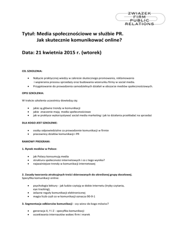 Tytuł: Media społecznościowe w służbie PR. Jak skutecznie komunikować online? Data: 21 kwietnia 2015 r. (wtorek) CEL SZKOLENIA: Nabycie praktycznej wiedzy w zakresie skutecznego promowania, reklamowania i wspierania procesu sprzedaży oraz budowania wizerunku firmy w social media. Przygotowanie do prowadzenia samodzielnych działań w obszarze mediów społecznościowych. OPIS SZKOLENIA: W trakcie szkolenia uczestnicy dowiedzą się: jakie są główne trendy w komunikacji jakie znaczenie mają media społecznościowe jak w praktyce wykorzystywać social media marketing i jak te działania przekładać na sprzedaż DLA KOGO JEST SZKOLENIE: osoby odpowiedzialne za prowadzenie komunikacji w firmie pracownicy działów komunikacji i PR RAMOWY PROGRAM: 1. Rynek mediów w Polsce: jak Polacy konsumują media struktura społeczności internetowych i co z tego wynika? najważniejsze trendy w komunikacji internetowej 2. Zasady tworzenia atrakcyjnych treści skierowanych do określonej grupy docelowej. Specyfika komunikacji online: psychologia lektury - jak ludzie czytają w dobie internetu (tryby czytania, eye tracking), żelazne reguły komunikacji elektronicznej magia liczb czyli co w komunikacji oznacza 90-9-1 3. Segmentacja odbiorców komunikacji - czy wiesz do kogo mówisz? generacja X, Y i Z - specyfika komunikacji oczekiwania internautów wobec firm i marek 4. Praktyczne wykorzystanie mediów społecznościowych fora internetowe- główne platformy, narzędzia, specyfika działań serwisy społecznościowe - m.in. Facebook, LinkedIn, społeczności tematyczne. Jak zaistnieć? blogi - prowadzić czy nie prowadzić? mikroblogi - czy w Polsce mają potencjał? platformy wideo - wykorzystanie do promocji marki angażujących treści wideo obraz zamiast treści: Vimeo, Instagram, Piterest - jak wykorzystywać w komunikacji 6. GOOGLE - jak budować obecność firmy z wykorzystaniem największej na świecie wyszukiwarki internetowej 7. Content marketing w akcji czyli jak budować strategię w oparciu o marketing treści. Case study. 8. Sytuacje kryzysowe w komunikacji z internautami [case study] TRENER: Monika Walczak, Grupa Szkoleniowa wymagamy.pl Jest certyfikowanym trenerem i coachem. Prowadzi działalność doradczą w obszarach zarządzania komunikacją marketingową oraz w kształtowania wizerunku przedsiębiorstw. Realizowała projekty m.in. dla PZU SA, PGE, Castorama, Statoil czy Orange. Jest członkiem Stowarzyszenia Content Marketing Polska. Termin szkolenia: 21 kwietnia 2015 r. , godzina 9:00 - 17:00 Związek Firm Public Relations ul. Czerska 8/10 (budynek Agory) FORMULARZ ZGŁOSZENIOWY Koszt udziału w szkoleniu: 750 zł netto + 23% VAT za osobę W razie dodatkowych pytań zapraszam do kontaktu: Sylwia Grabek [email protected] tel: 22 55 53 332, 531 84 84 71
